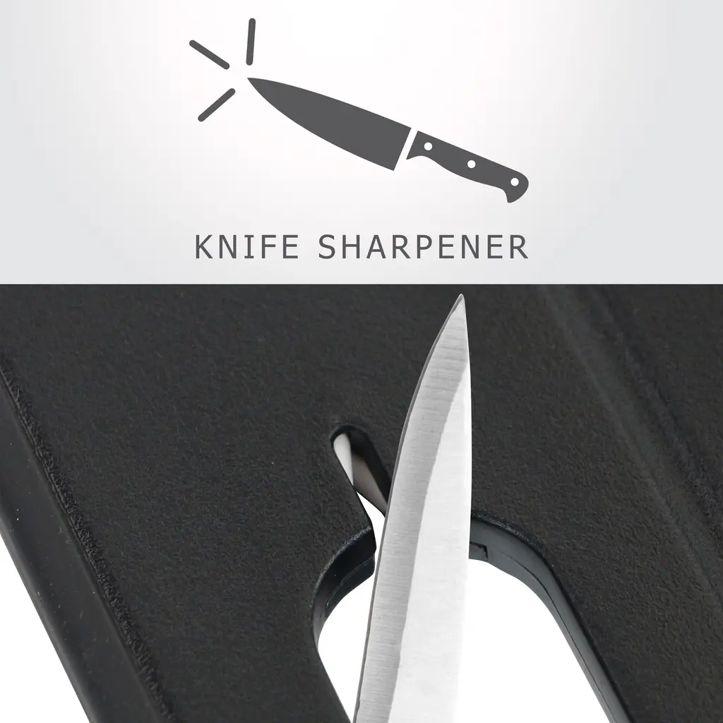 CUTTING BOARD | Food Safe Plastic (BPA Free) for everyday use. Juice grooves to catch water and drippings. Rubber edges around the double-sided tray stop it from sliding on your counter DEFROST TRAY |Thaw 50% faster with our premium aluminum alloy defrost tray. This reverse side of the tray is a handy gadget to thaw frozen foods in half the time. Do not use for cutting KNIFE SHARPENER | Ceramic knife sharpener to keep your cuts clean and safe ZESTER |1½" x 2" zester is a simple way to help you peel & grate garlic or other fruits/vegetables