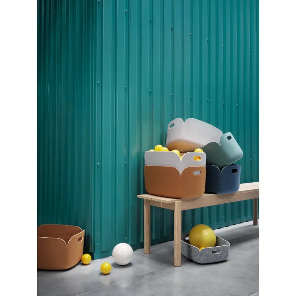 Muuto's Restore tray is the perfect companion for shelves and desks, keeping everything from important documents and papers to smaller items and accessories neatly organized. Designed by Mika Tolvanen, the Restore is a collection of multifunctional storage baskets and trays, shaped from durable polymer felt composite. The innovative material is manufactured from the fibers of recycled bottles. Restore trays and baskets feature a simple and pleasant form that is suitable for home and office.