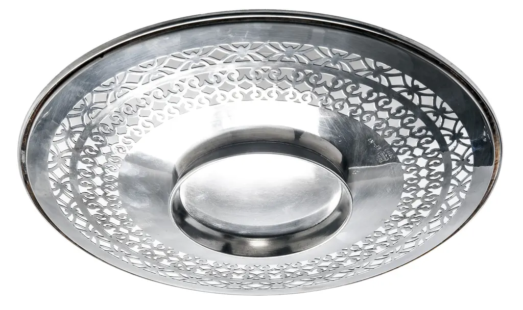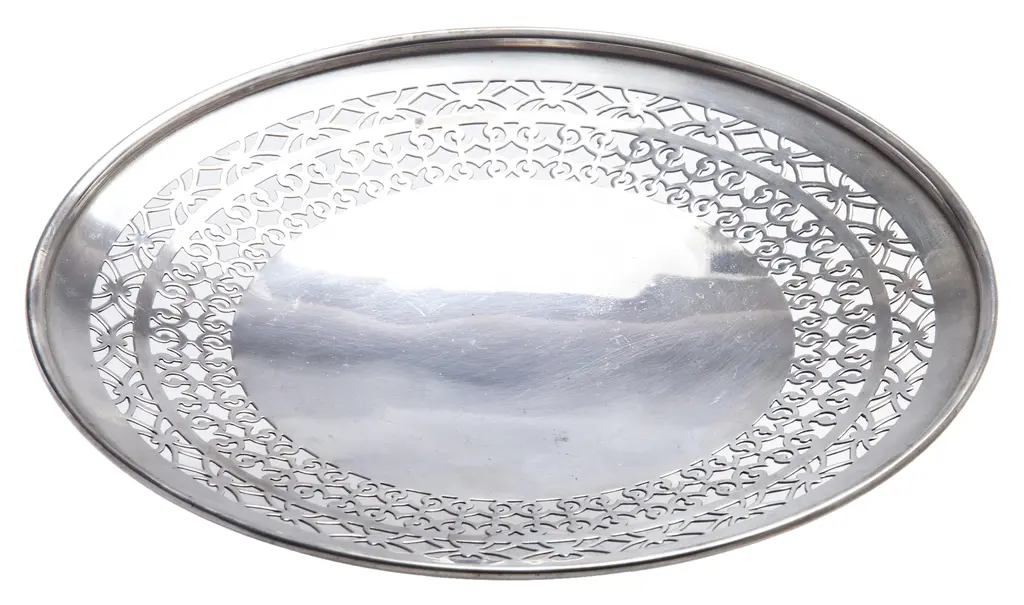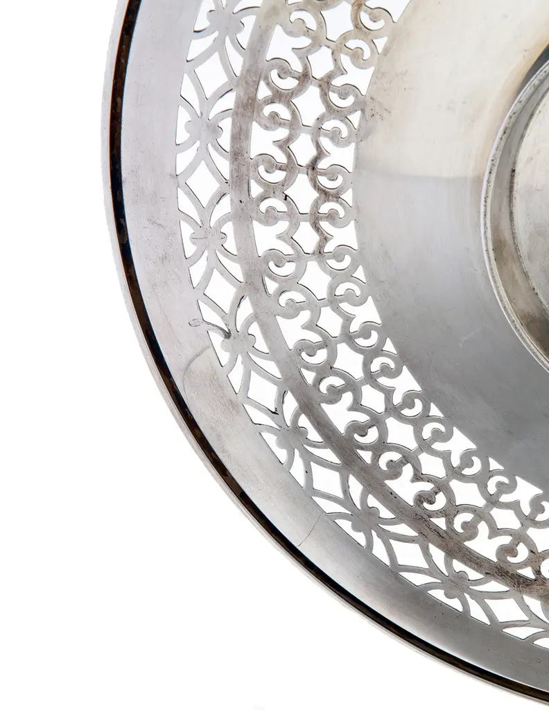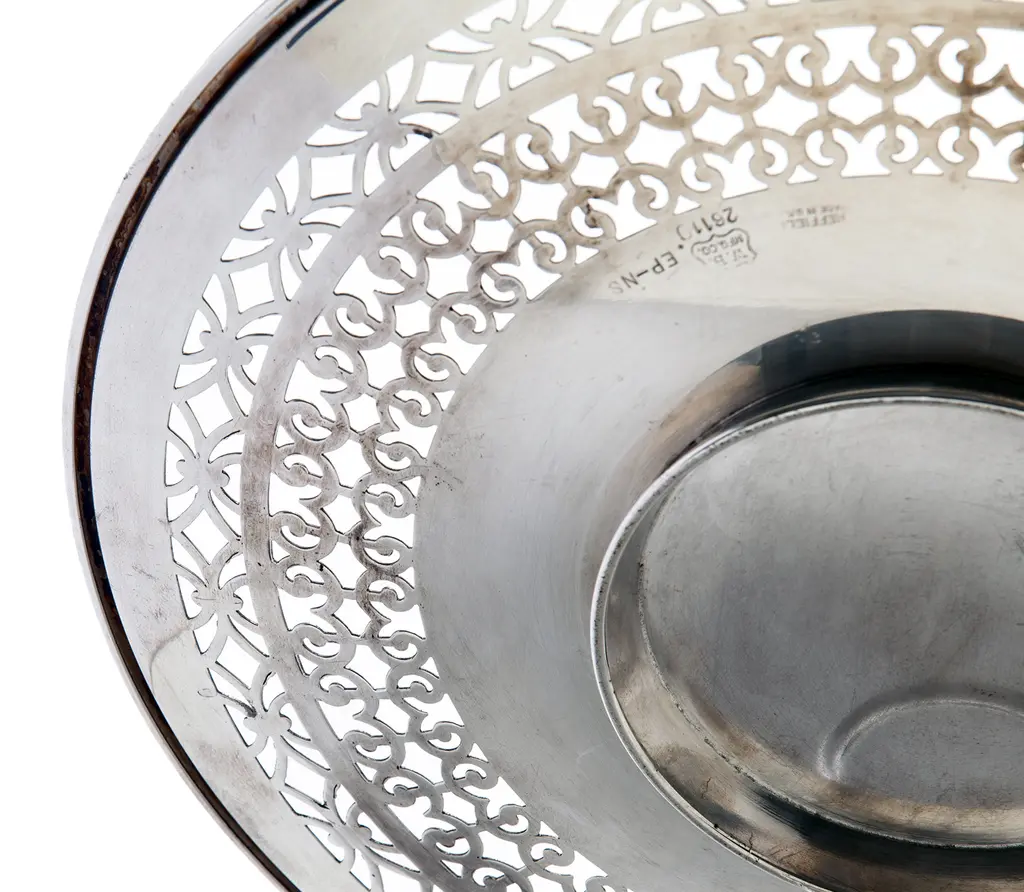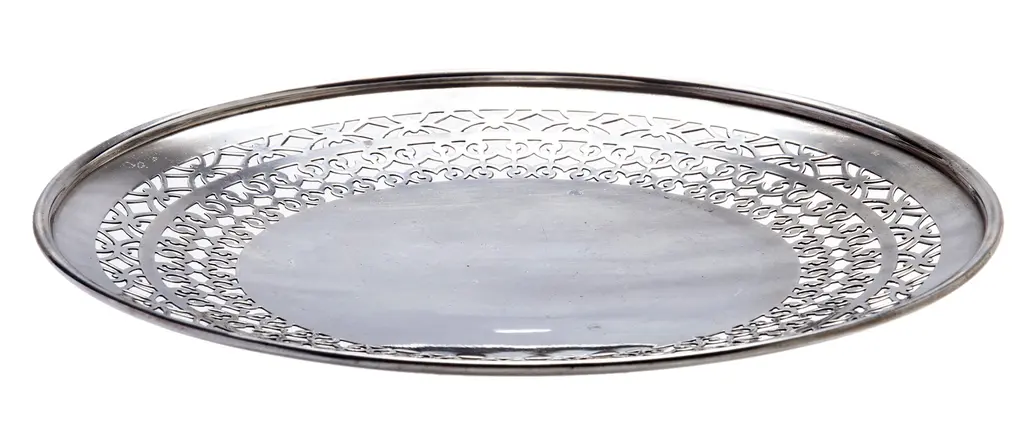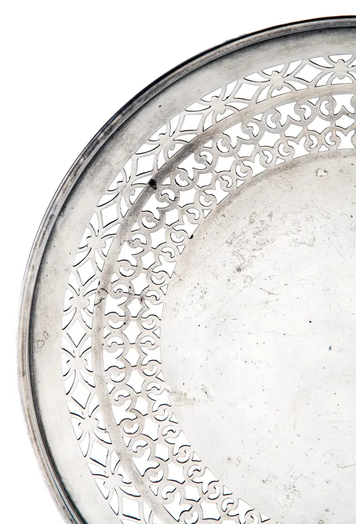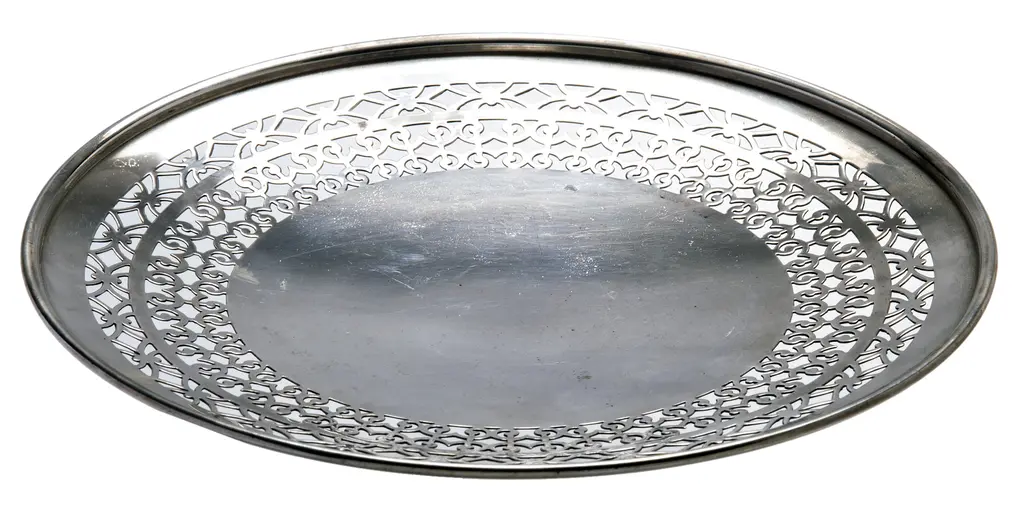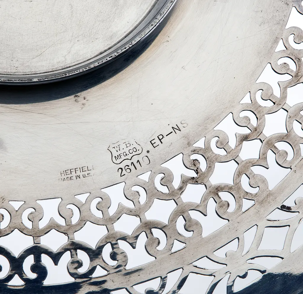 An American Sheffield silver plate footed tray/plate with decorative retriculated edge. I've used these, for a candle stand, or a plant saucer, soaps in the powder room as well as a serving tray.