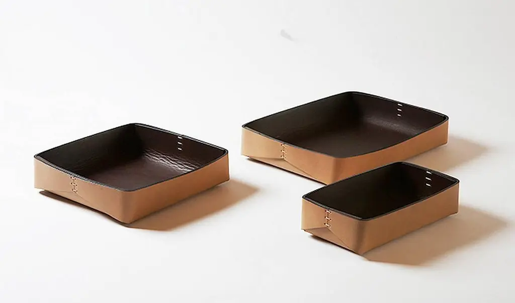 "Rettangolare" is a leather tray, designed and manufactured by Oscar Maschera. Genuine Italian leather vegetable tanned. This tray has two different colors: one for the inside and the other for the outside. Colors combination to be chosen from the available range: tan, sienna, orange, red, red-purple, dark brown, khaki, blue and black.DIMENSIONS:D. 9.4", W. 12.9", H. 2.3"Two skins put together, one single layer of leather and pleats held together by hand stitching. Strong thickness, raw edges, contrasting stitching. Leather, robust and soft, which maturates over time like wood, wine, brandy and cheese, is a material suitable for a living relationship with people and things it has to do with: it absorbs their scent and gives its own. It protects, gathers and changes shape, as it retains something of the life it once had.Past experiences in working with leather, with objects of common use transformed into their own form by the material of which they were made (baskets, boxes, trays, writing-desk items, small pieces of furniture, in addition to bags and cases, of course) have led Oscar Maschera to today’s production which has exceeded even the limits of explicit reality to get the pure form of the objects, reaching beyond the risky limit of mere functionality.