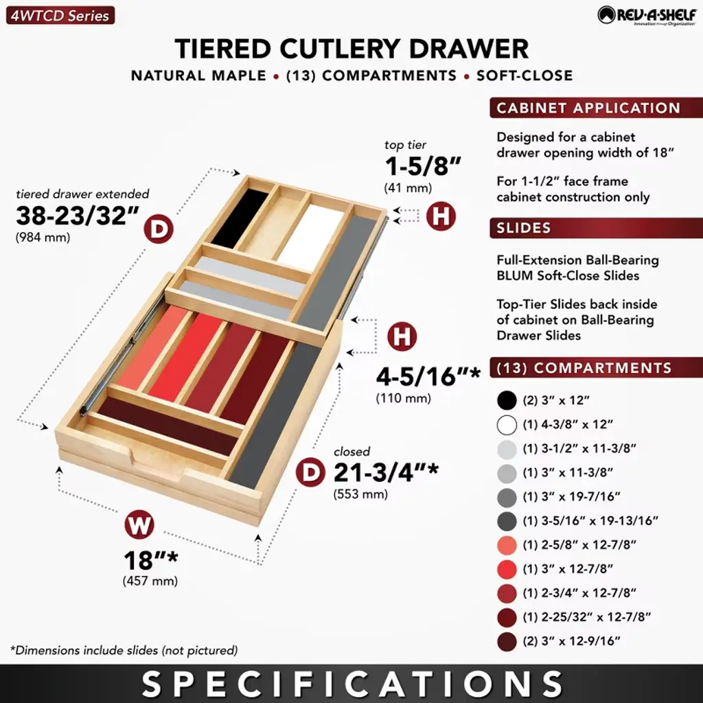 Rev-a-shelf 4Wtcd-21hsc-1 18 Inch Wide 2 Tiered Kitchen Utensil & Cutlery Pullout Drawer Tray Organizer With Blumotion Soft Close Slides, Wood