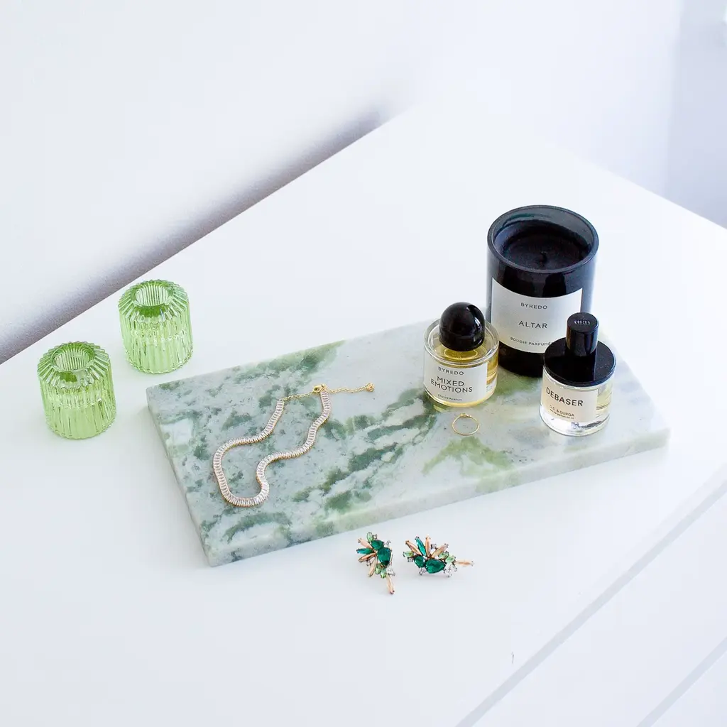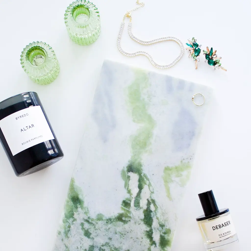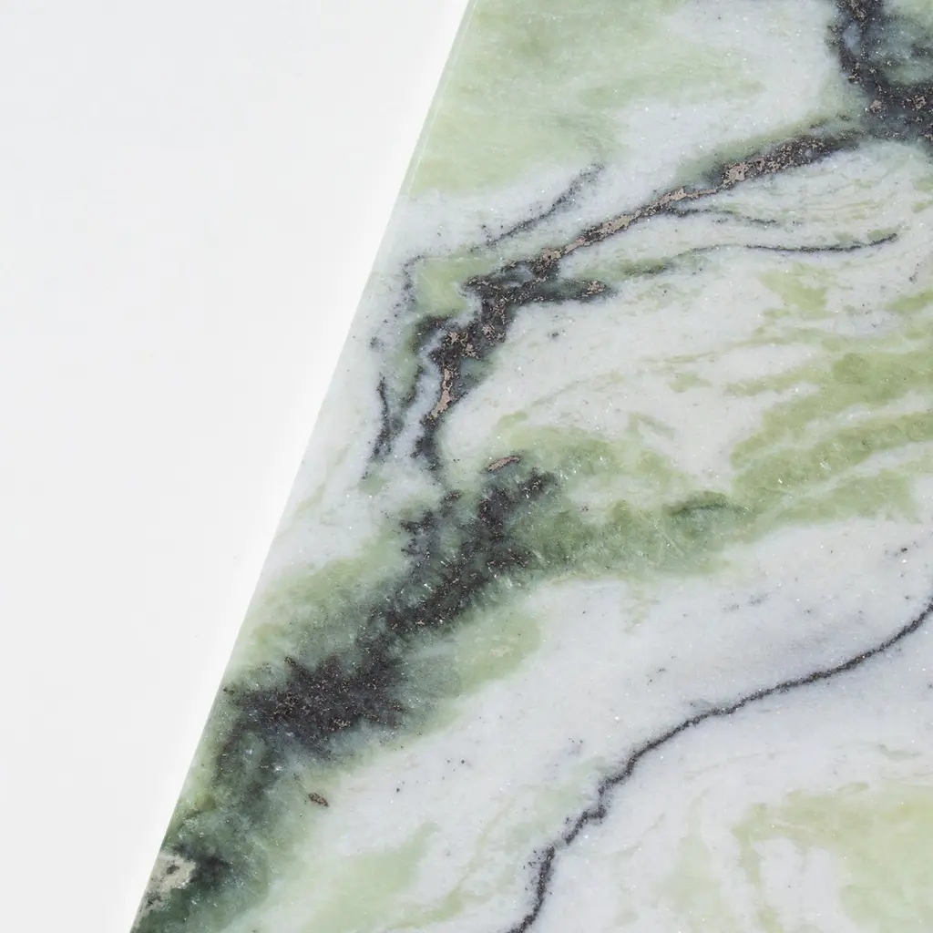 A jade-like marble reminiscent of rice paddy fields in Bali. vibrant energy coupled with an eternal calm. Set on a bone background, electric waves of green + emerald work their way through the stone. Made from Asian marble.