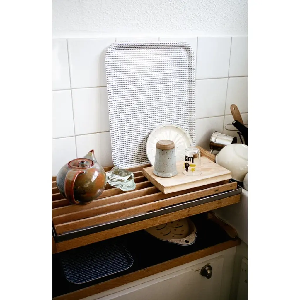 The Rivi tray, designed by Ronan and Erwan Bouroullec for Artek, features a unique textile pattern that comprises rows of long, parallel lines with delicate details. The rectangular tray is made of laminated plywood and paper. The appeal of Rivi, Finnish for "line", lies in the hand-drawn lines – Artek has a long tradition in crafting furniture from wood and perceives organic irregularity as a virtue rather than as a flaw. The Rivi home collection includes fabrics, cushion covers, trays, pouches and bags in a range of Nordic colors.