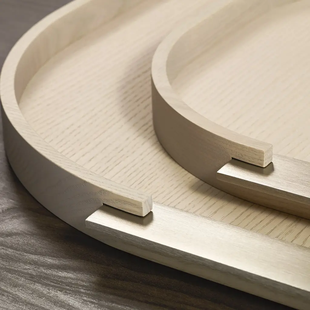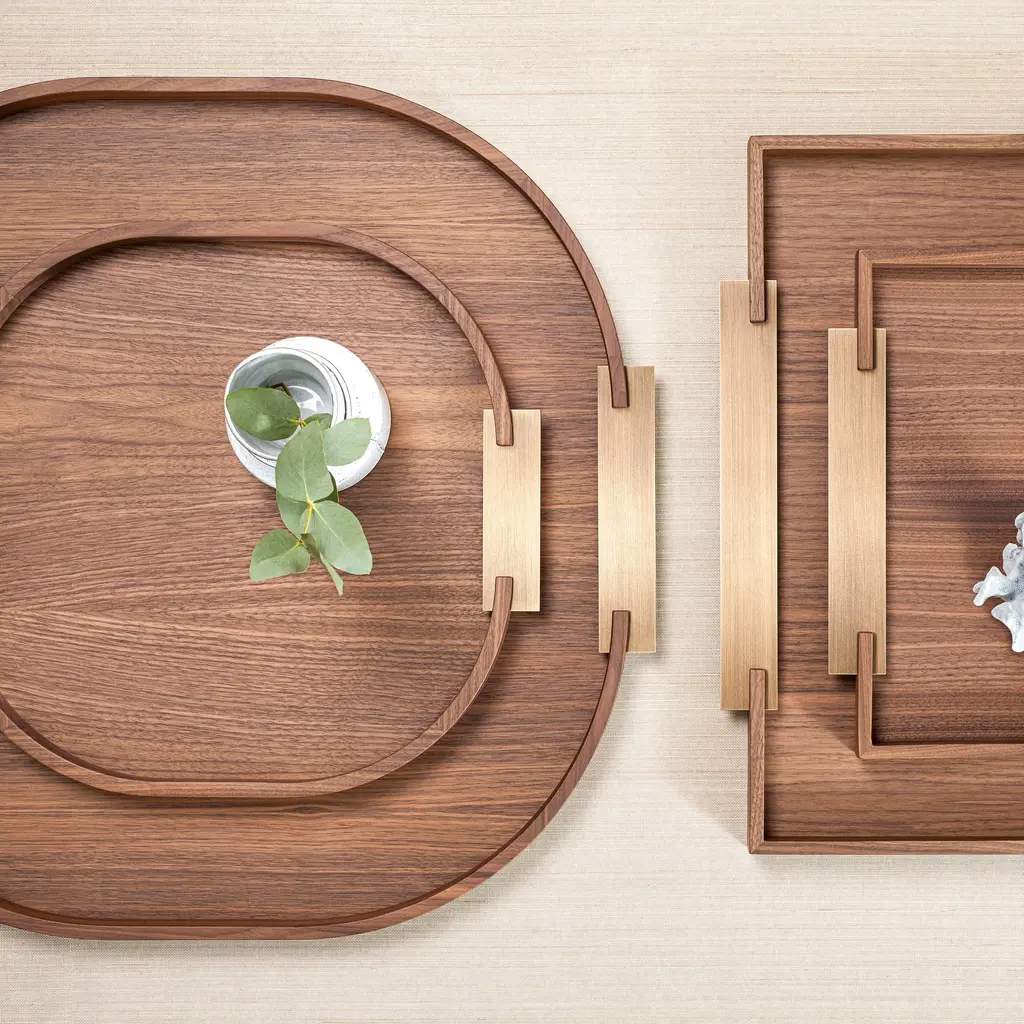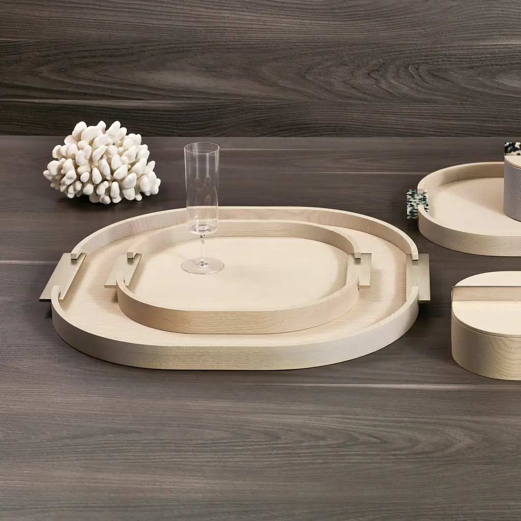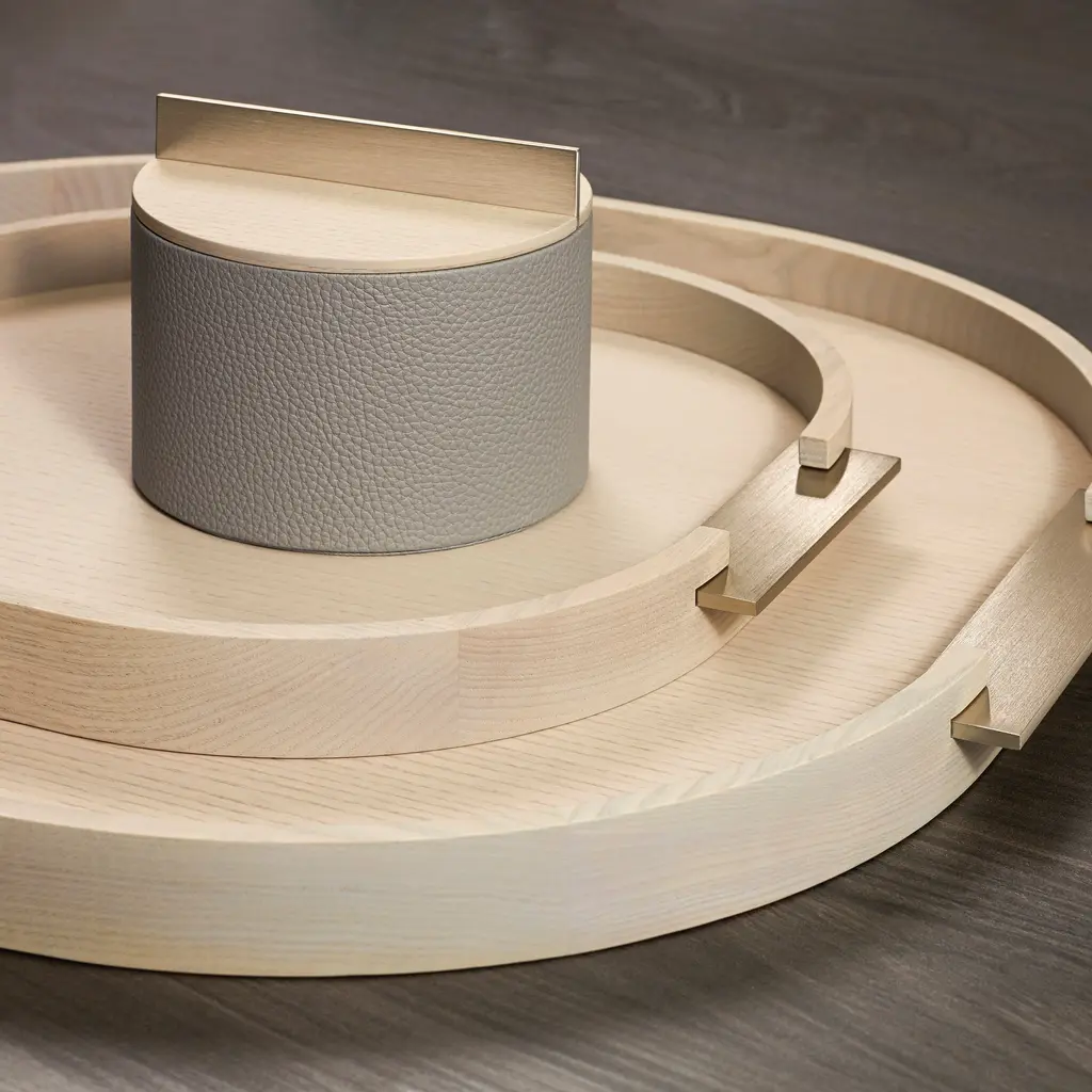 A tribute to pure form and luxurious materials, the Dama Rounded Tray is a refined creation from the Giobagnara x Riviere collaboration. Expertly handcrafted in Italy, this generous tray is carved from solid walnut or ashwood, showcasing the deep, natural grain. The soft, rounded form is punctuated by a single, striking metal handle, creating a focal point that is both practical and decorative. A fusion of natural warmth and metallic precision, it brings timeless elegance to any surface. Highlights: