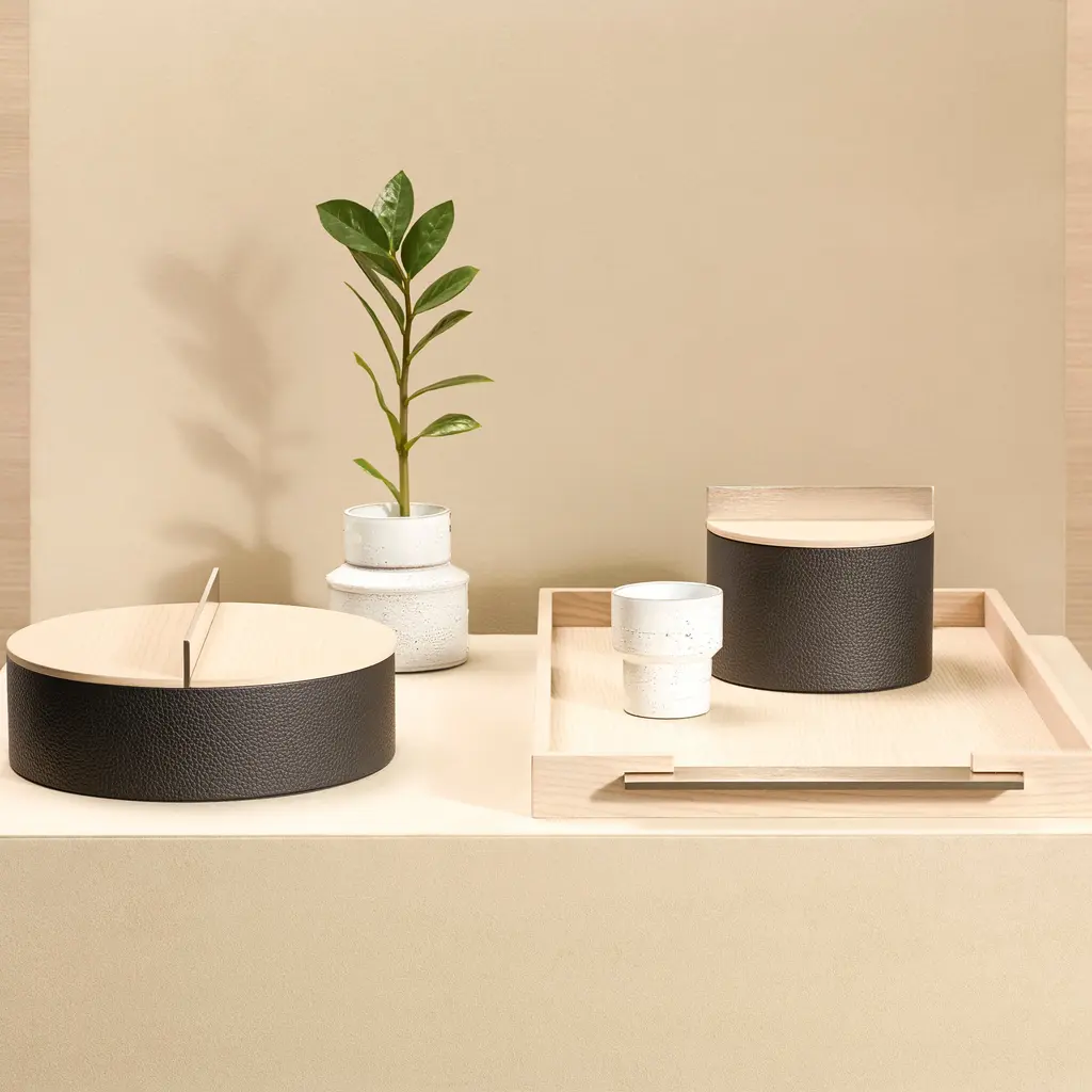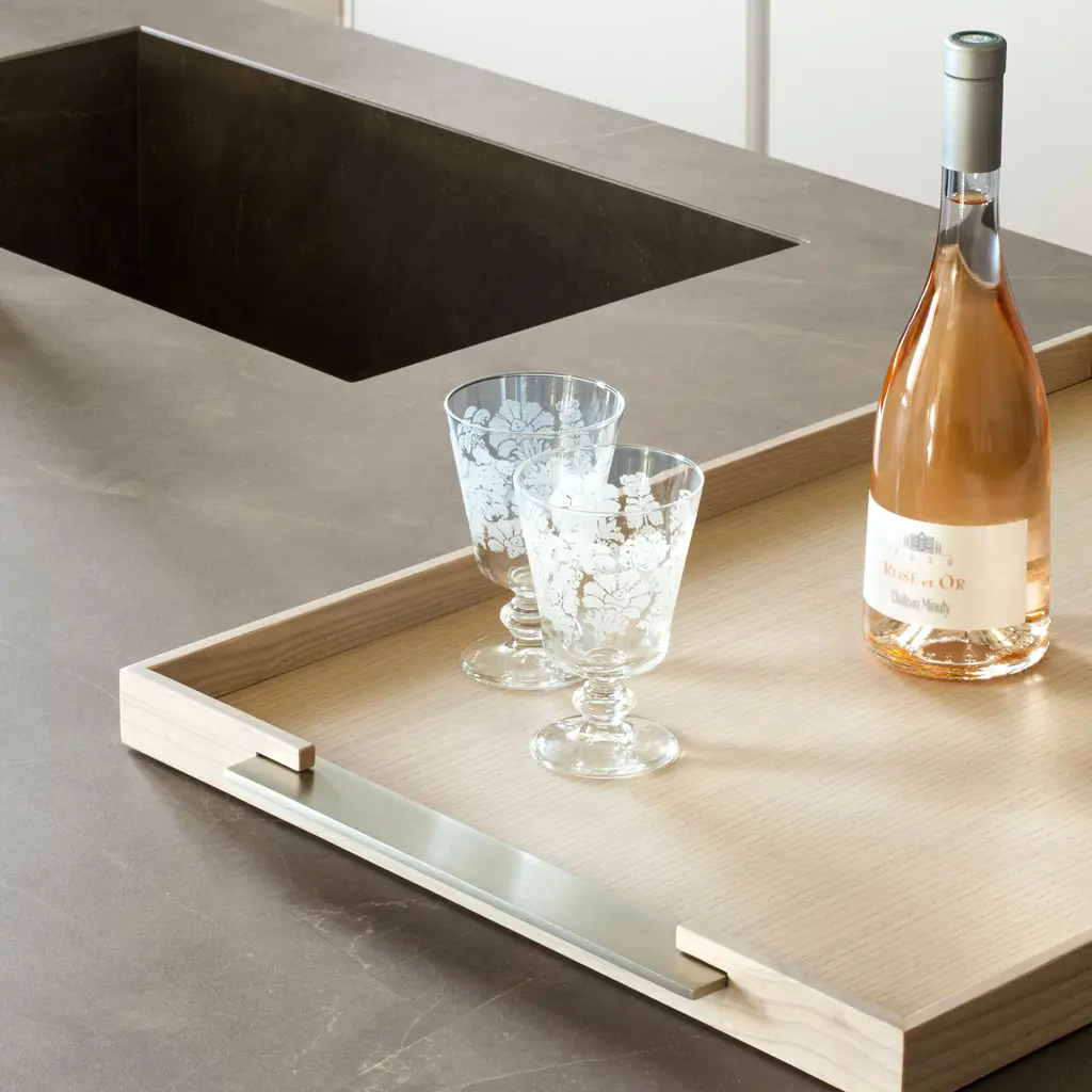 A celebration of pure form and artful materials, the Giobagnara x Riviere Dama Tray is a sophisticated design from the Giobagnara and Riviere collaboration. Expertly handcrafted in Italy, this generously scaled tray is carved from solid walnut or ashwood, showcasing its deep, natural grain. The elegant, elongated silhouette is anchored by two striking metal handles, creating a focal point that is both practical and decorative. A fusion of natural warmth and metallic precision, it brings timeless elegance to any surface. Highlights: