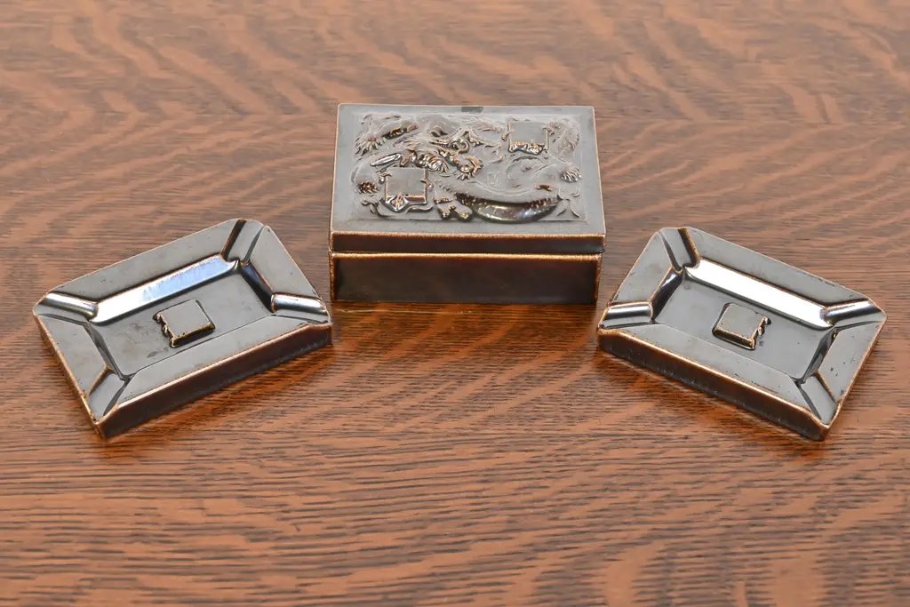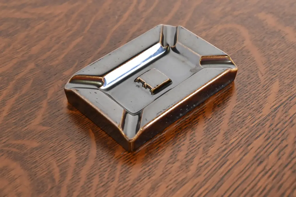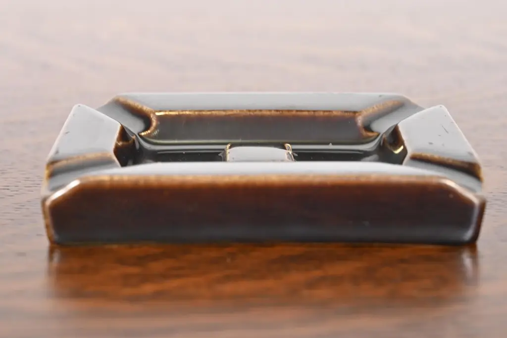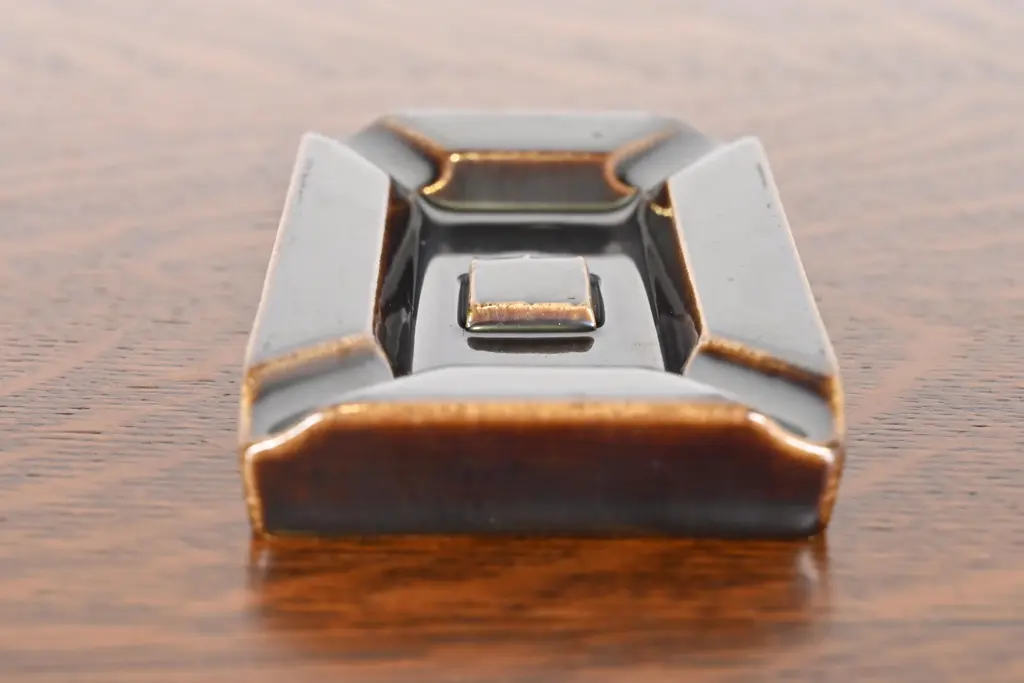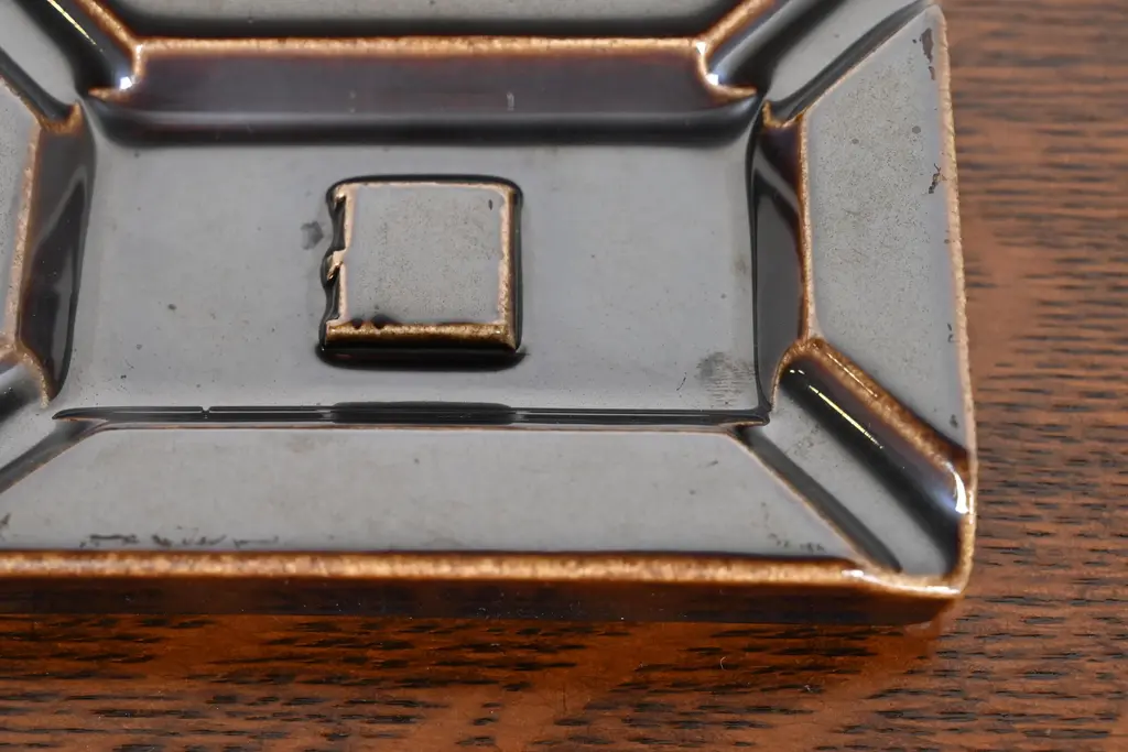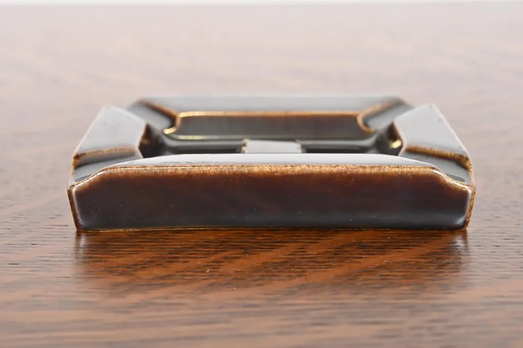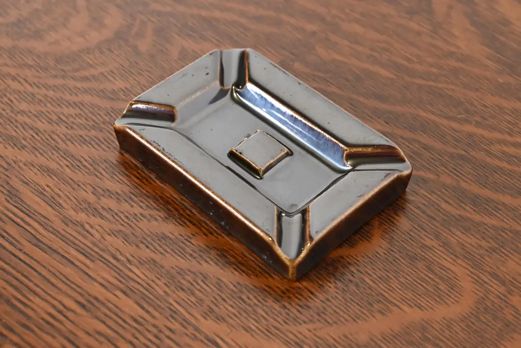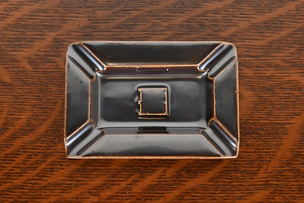A gorgeous Mid-Century Modern glazed art pottery ashtray or catchall By Rookwood Pottery USA, 1954 Glazed ceramic in a handsome deep brown color. Measures: 4.25"W x 2.88"D x 0.75"H. Good original vintage condition. Two ashtrays available. Matching cigarette box also sold separately.