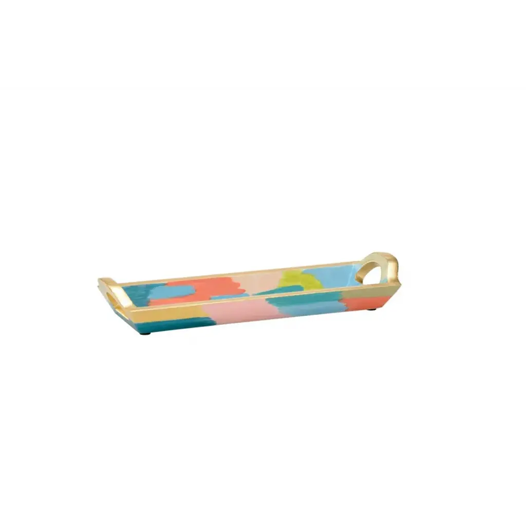 HAND PAINTED WOOD TRAY IN VIBRANT COLORS WITH ANTIQUE GOLD LEAF EXTERIOR AND CUT OUT HANDLES. BEAUTIFUL AS A DECORATIVE ACCESSORY AND FUNCTIONAL AS A CATCHALL FOR DAILY ESSENTIALS SUCH AS PHONE, WALLET AND KEYS. DESIGNED BY ELAINE BURGE.