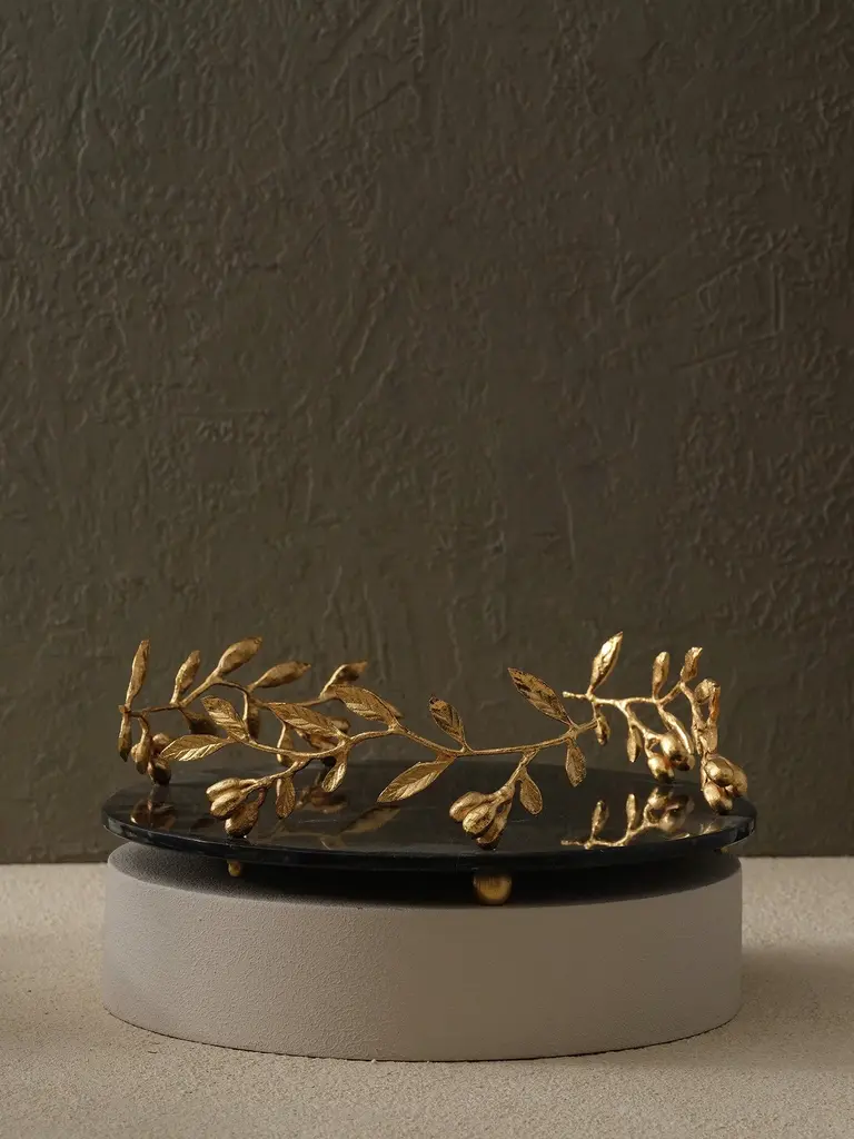 Elegant and sculptural, the Round Black Marble Tray with Gold Olive Branch Detailing is a true showpiece that brings the beauty of nature into a refined, contemporary form. The sleek black glass surface is crowned with a delicately winding olive branch in radiant gold, artfully draped around the tray's rim. Symbolizing peace and prosperity, the hand-crafted branches add texture, depth, and timeless symbolism. Ideal for serving or as a decorative centerpiece, this tray is a luxurious accent for dining tables, consoles, or vanities.