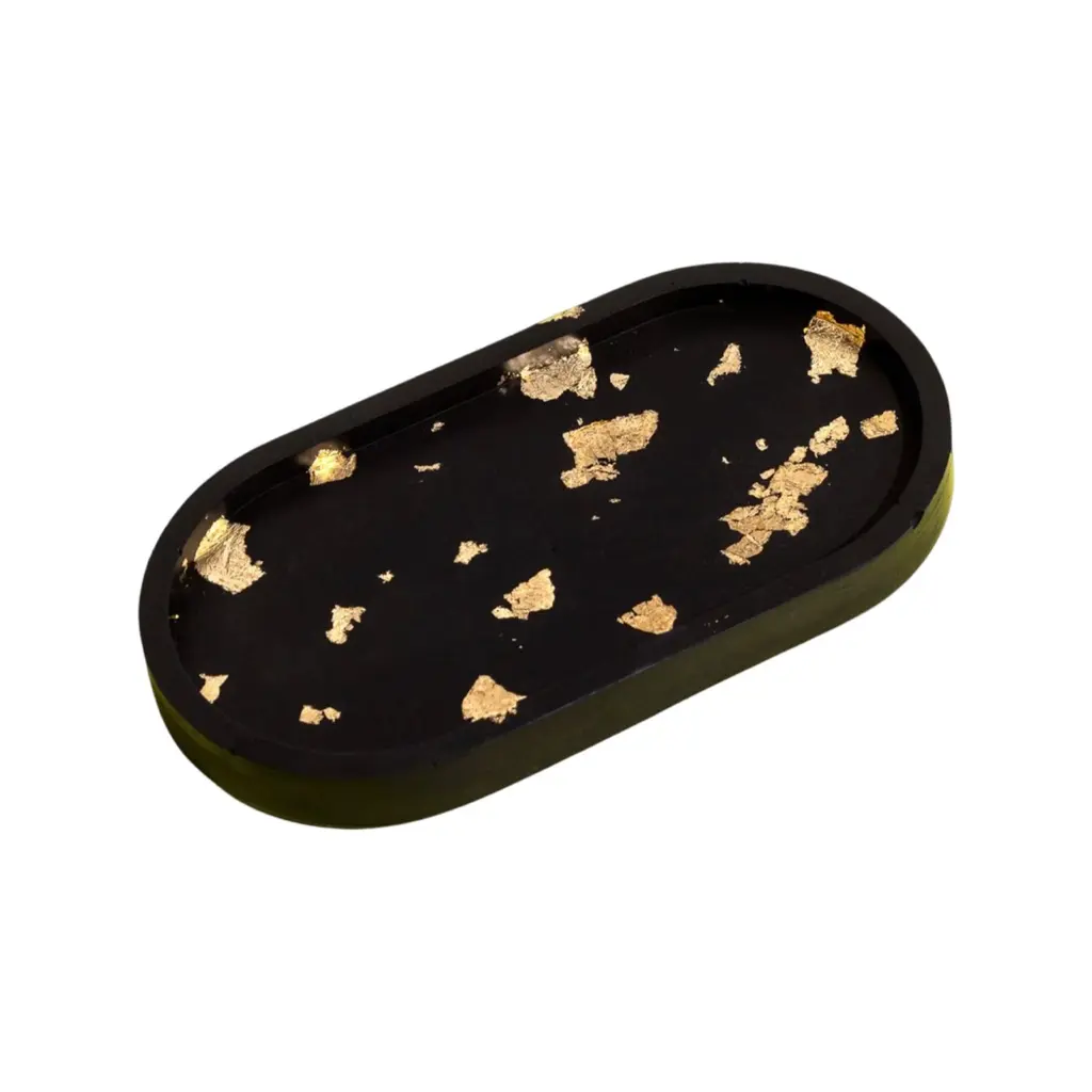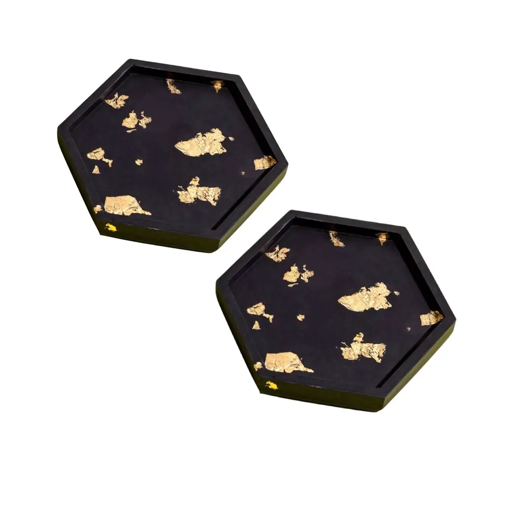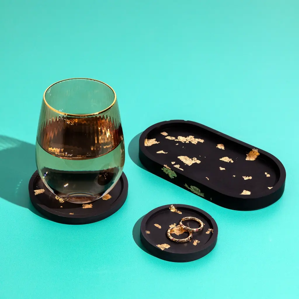 The perfect pair to hold your trinkets or serve as sparkly coasters for your coffee table. The gold detailing adds a touch of luxury, and the products are made by inserting gold flakes during the casting process. Made with a smooth finish, the trays can hold glasses of all sizes, and come with a cork backing to protect your surfaces. By Shax products are handmade per order and will look slightly different to the product images. Pieces may also have small air bubbles, which is a result of the hand poured working process of jesmonite and is a natural, authentic finish.