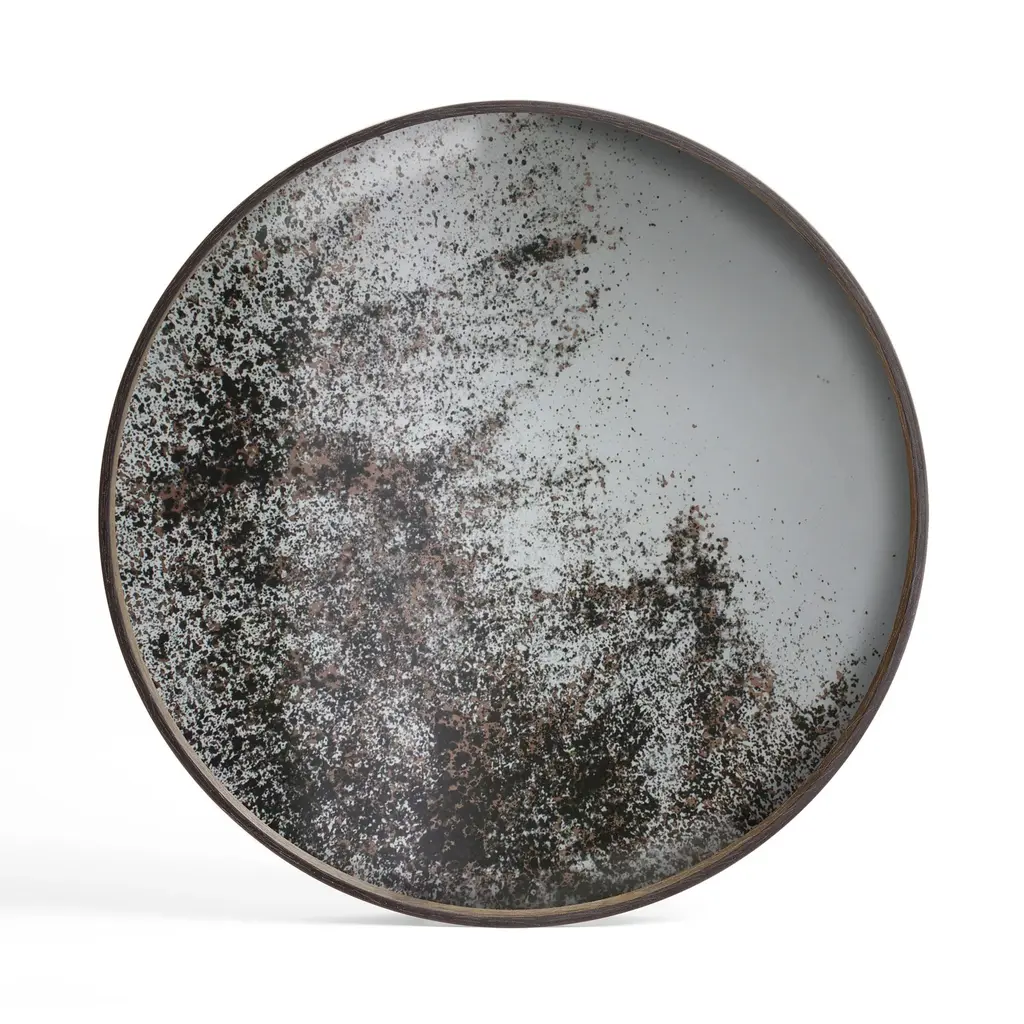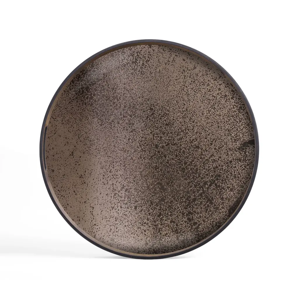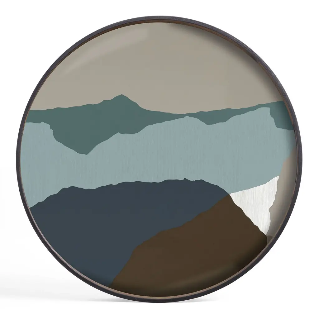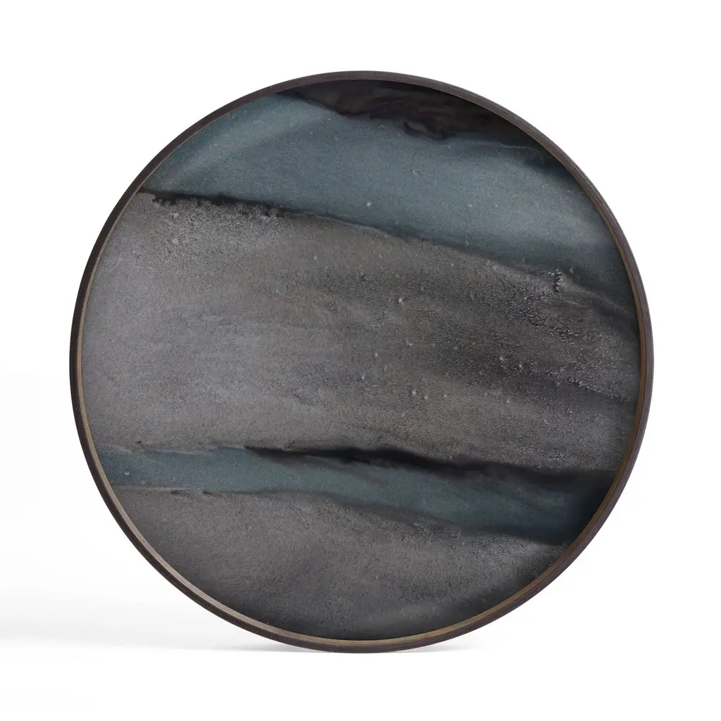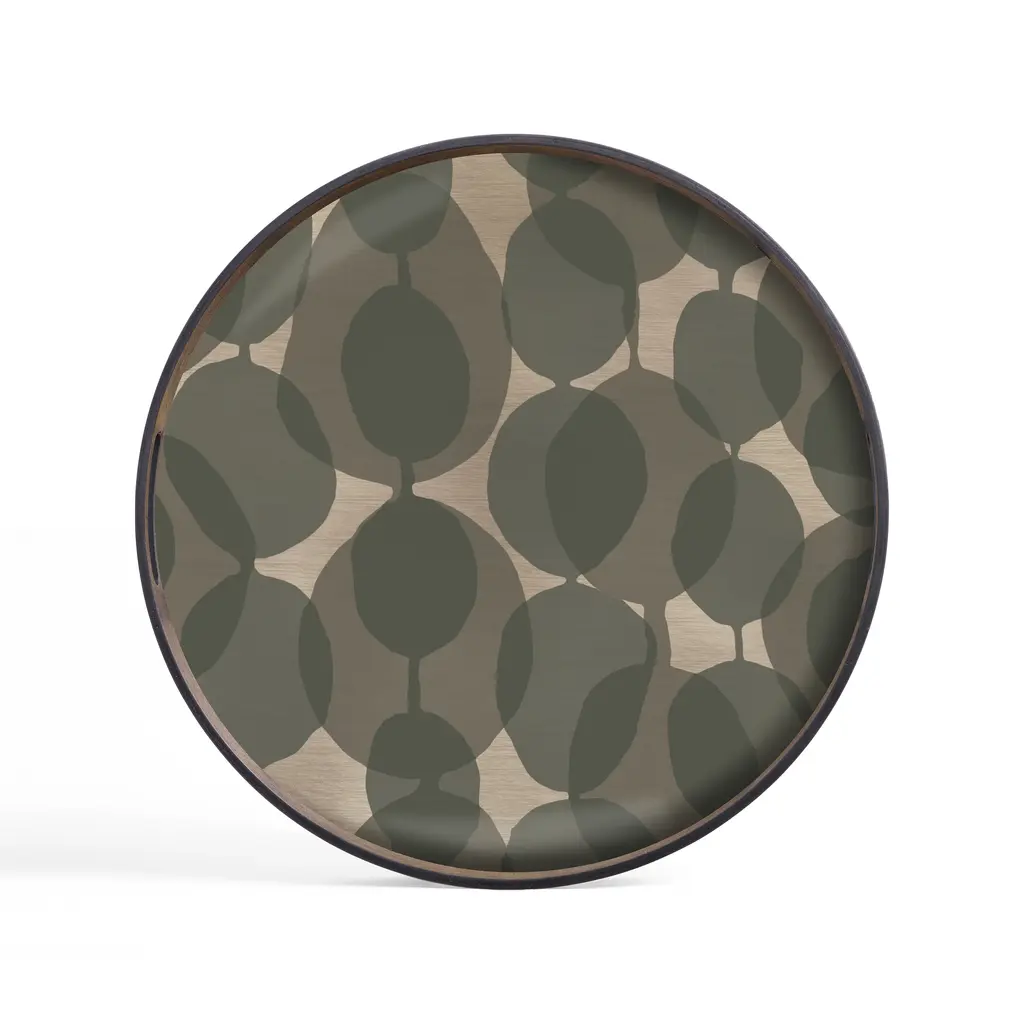 The Round Tray from Ethnicraft, designed by Dawn Sweitzer, combines hand-painted glass with dark FSC-certified wood rims to create a striking contrast. Its abstract patterns and gold accents bring a refined, contemporary elegance to any setting, while the warm hues add a subtle vibrancy. This tray effortlessly blends modern artistry with natural materials, making it a sophisticated centerpiece for your home or office. Highlights