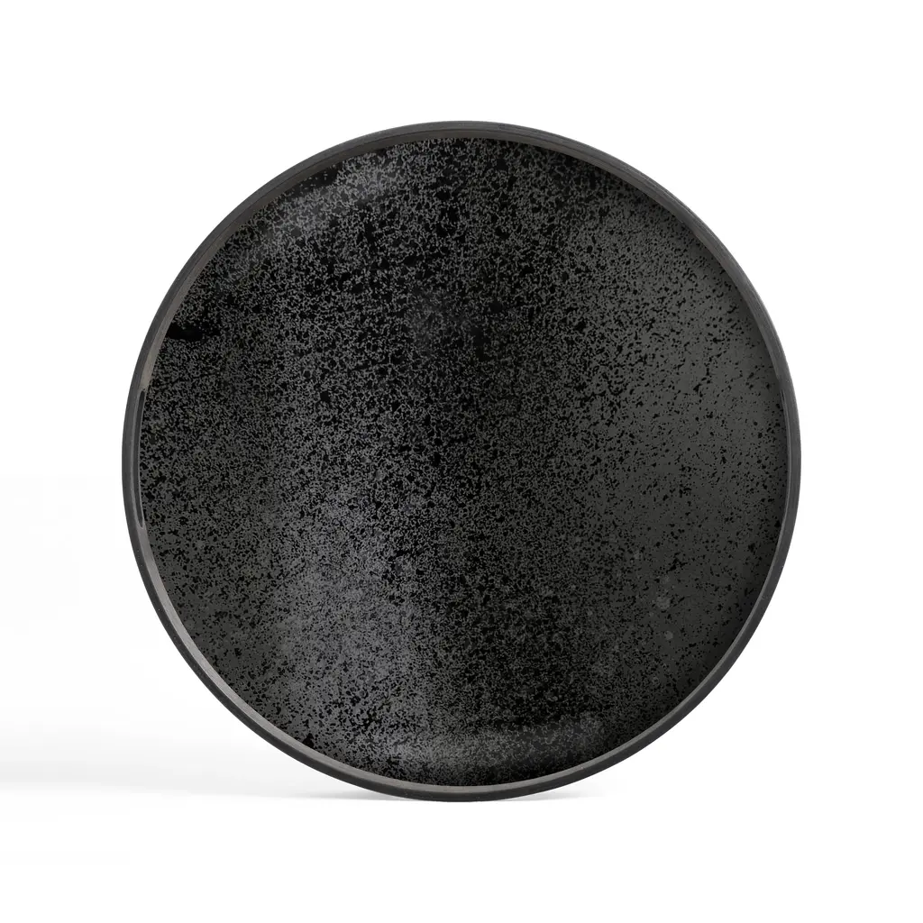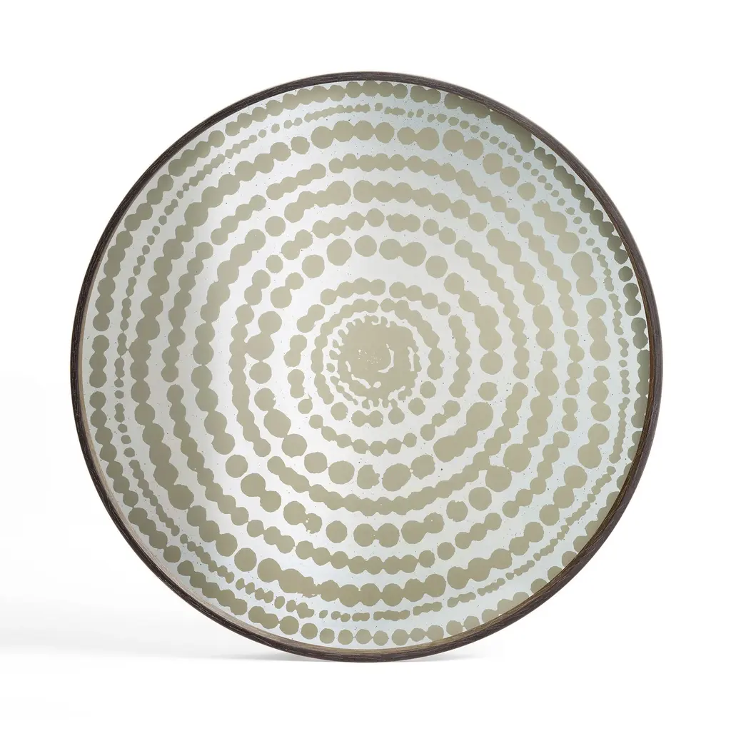 The Round Tray from Ethnicraft, designed by Dawn Sweitzer, combines hand-painted glass with dark FSC-certified wood rims to create a striking contrast. Its abstract patterns and gold accents bring a refined, contemporary elegance to any setting, while the warm hues add a subtle vibrancy. This tray effortlessly blends modern artistry with natural materials, making it a sophisticated centerpiece for your home or office. Highlights