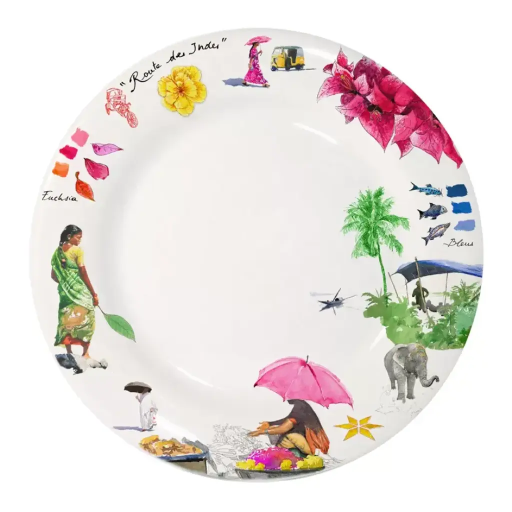 Inspired by the artist’s travel diary, this design transports us to the Indian subcontinent. We are carried away by the power of the colors, seduced by the sophistication of the details and mastery of the subjects. Located near the Loire Valley castles, the Faïencerie de Gien has been synonymous with prestigious faience tableware and decorative objects since its founding in 1821. Gien pieces are renowned for their warm white clays decorated with traditional motifs reminiscent of the French countryside.