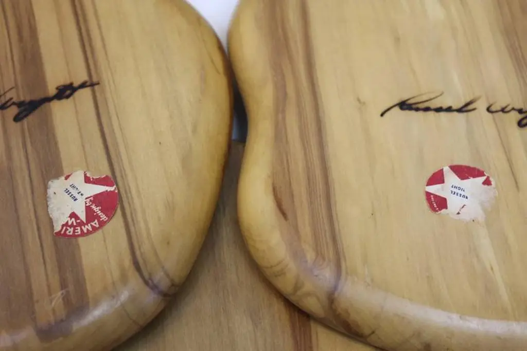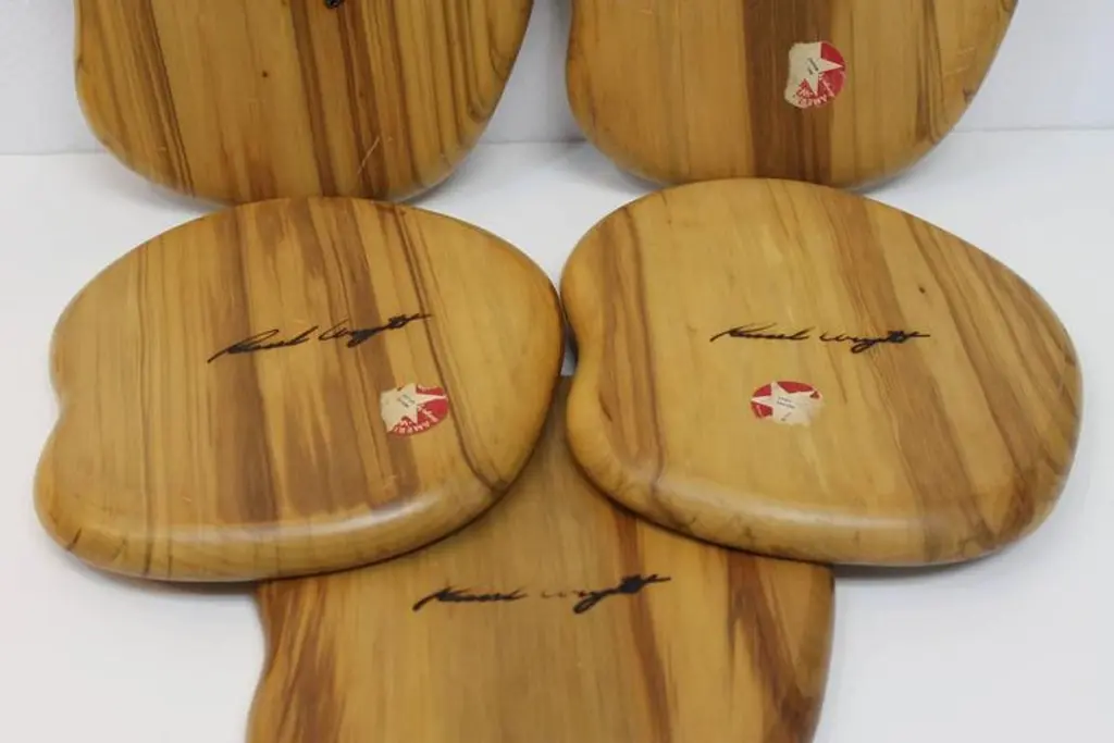 Russel Wright individually sized trays. Some trays have partial American way labels. Part of a wood line designed by husband and wife Industrial designers Russel and Mary Wright. Ann Kerr mentions these were probably sold in groupings. Price is per item.