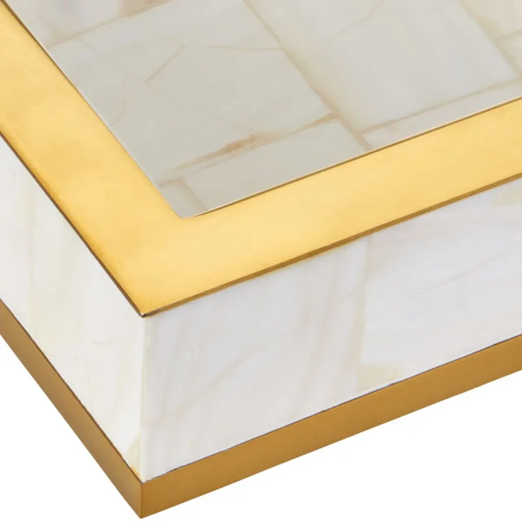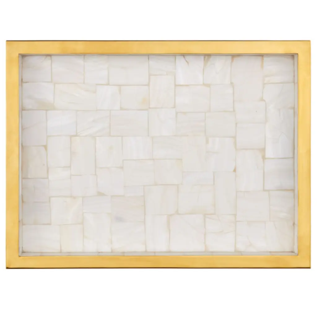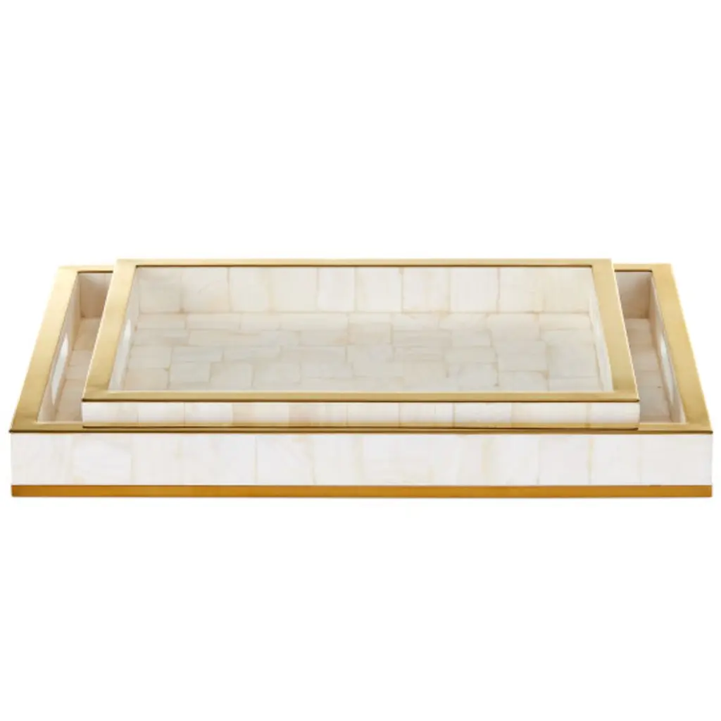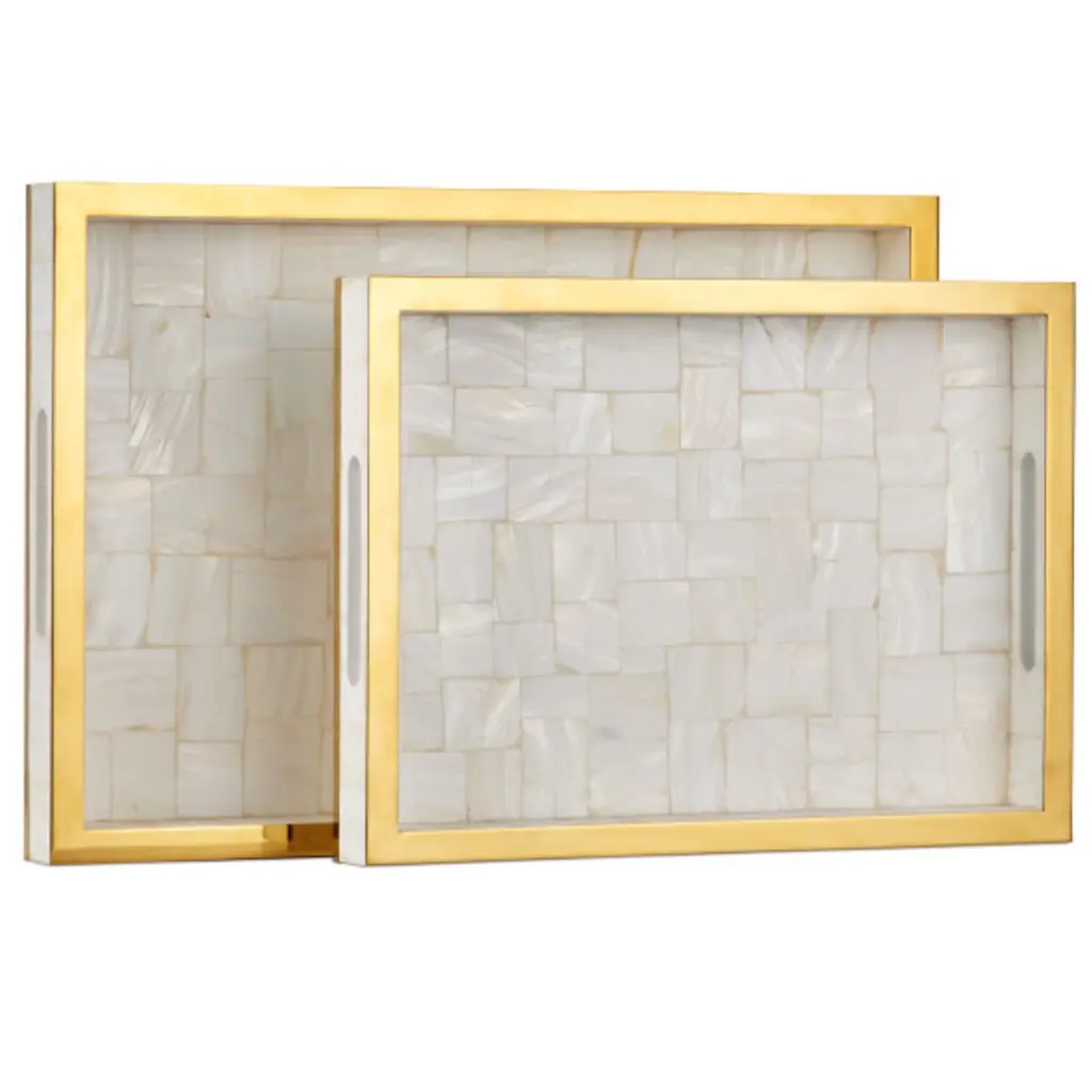The luxe feel of a timeless material makes the Casey Mother of Pearl Tray Set a striking display of fine artisanship. This elegant set includes a larger and smaller decorative tray, both crafted from shimmering mother-of-pearl and accented with rich gold details. Perfect for serving, organizing, or displaying treasured items, these trays exude timeless sophistication and will elevate any gathering with their radiant beauty.