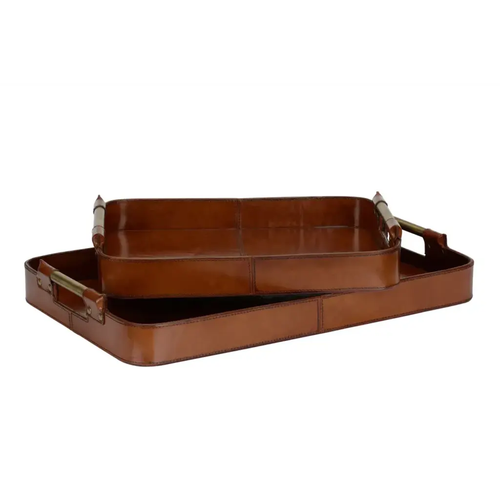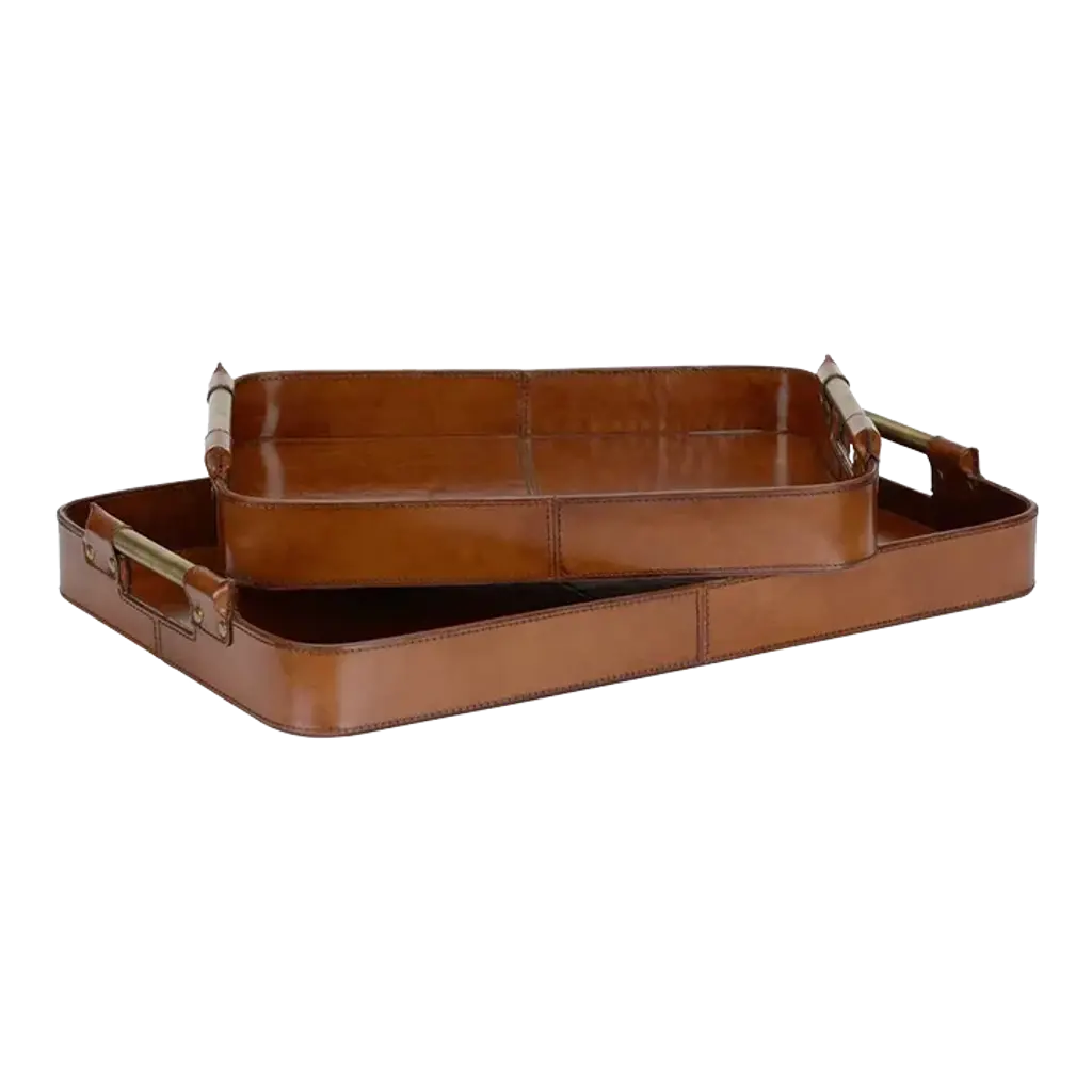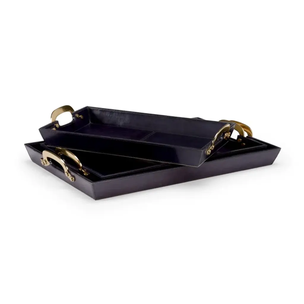 Set of two rich leather trays with distinctive gold handles with leather ends. Luxurious and functional.