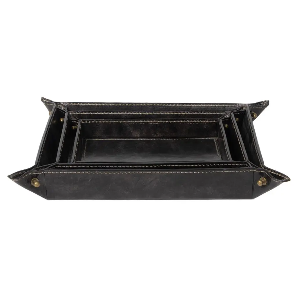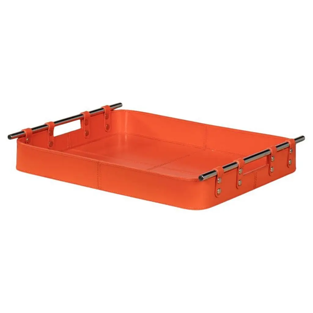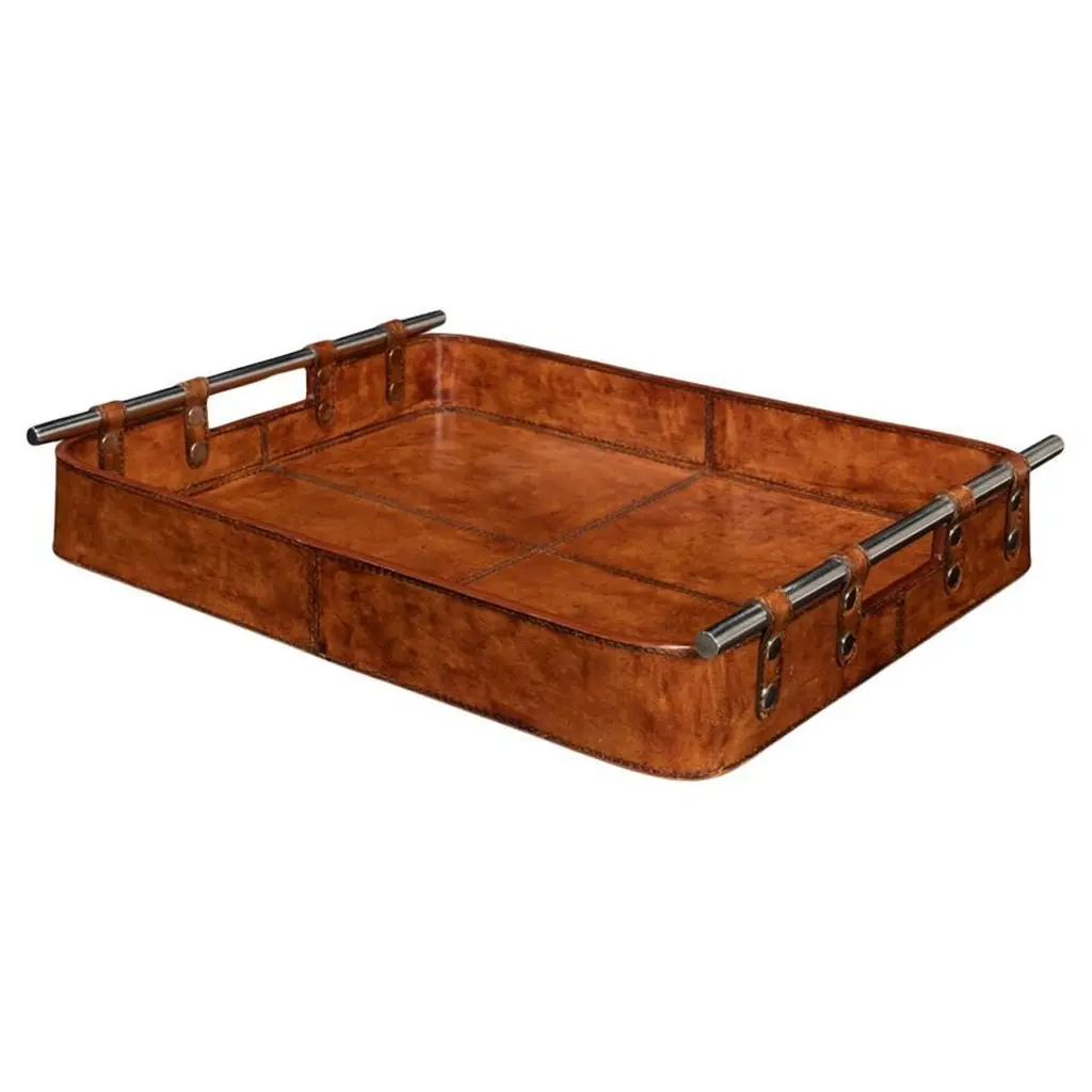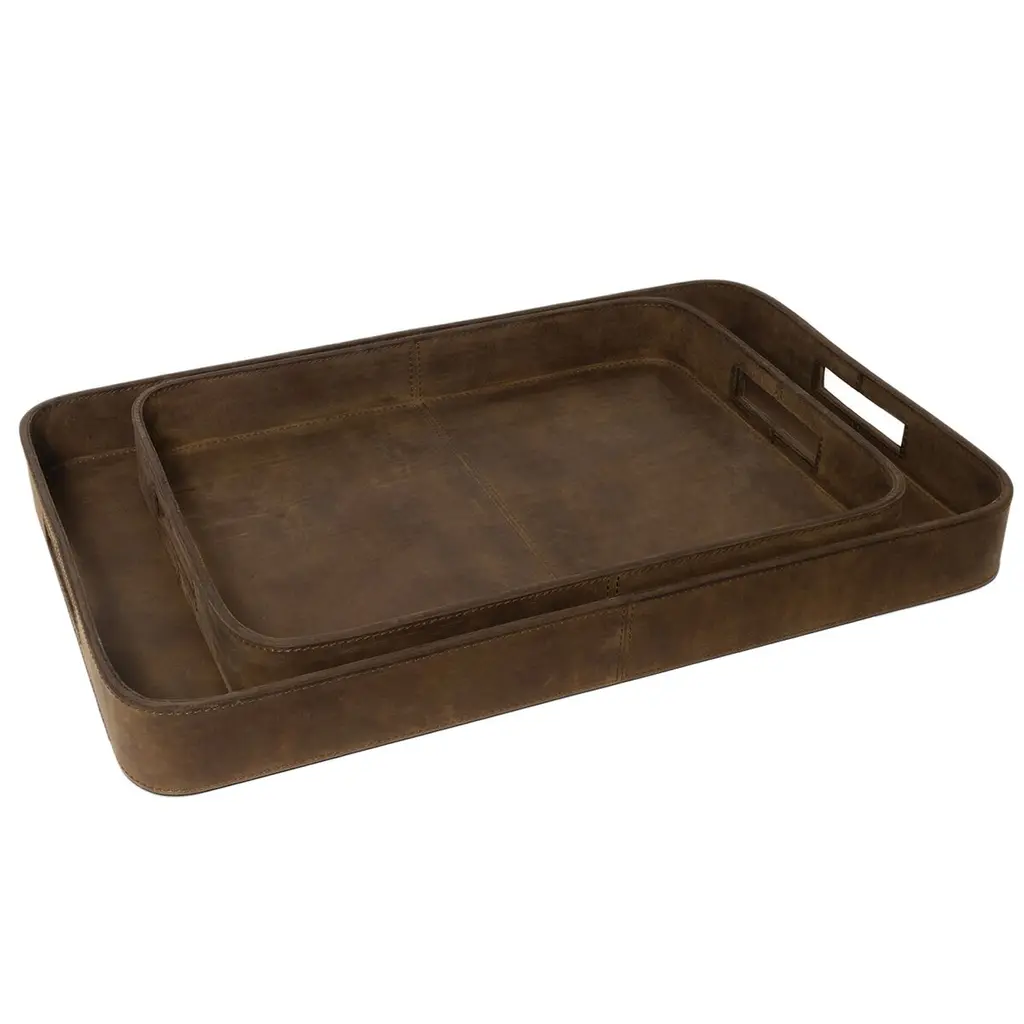 Set of two rich leather trays with distinctive gold handles with leather ends. Luxurious and functional.