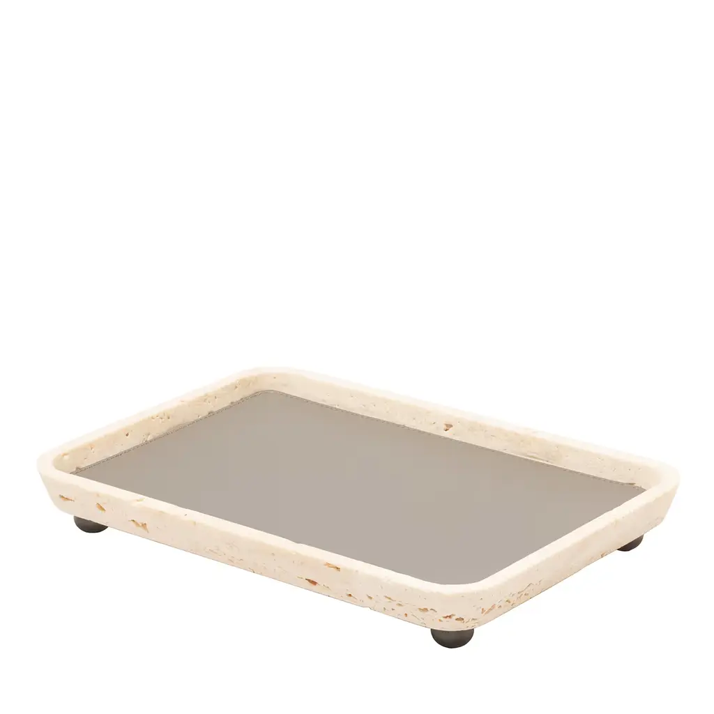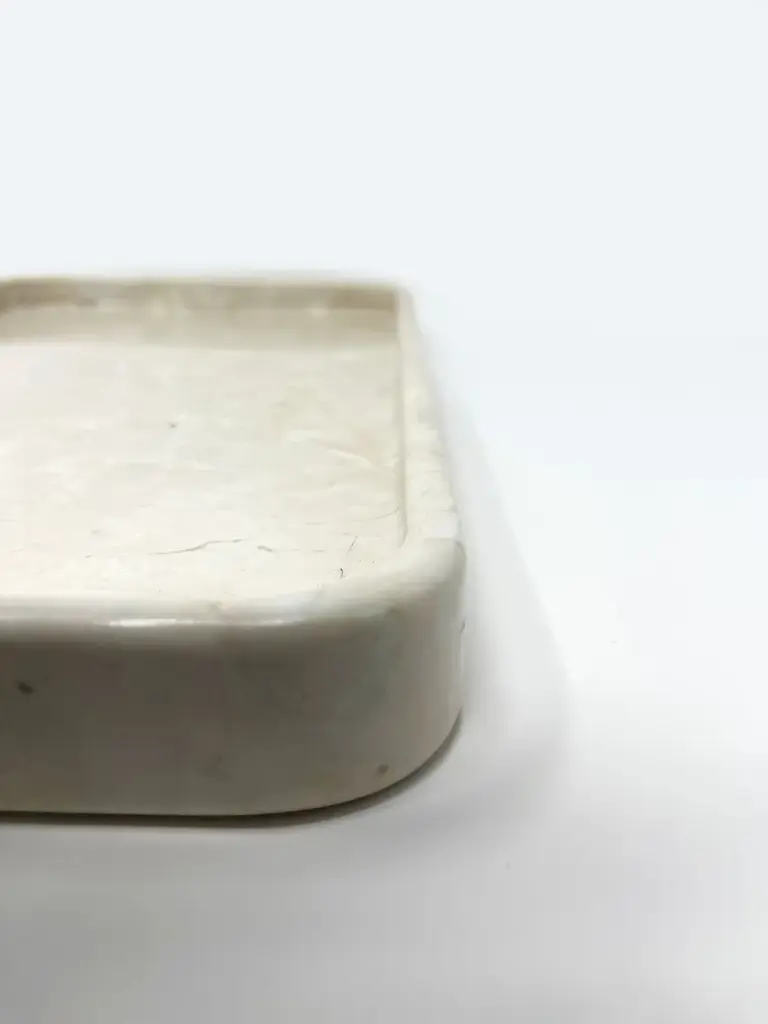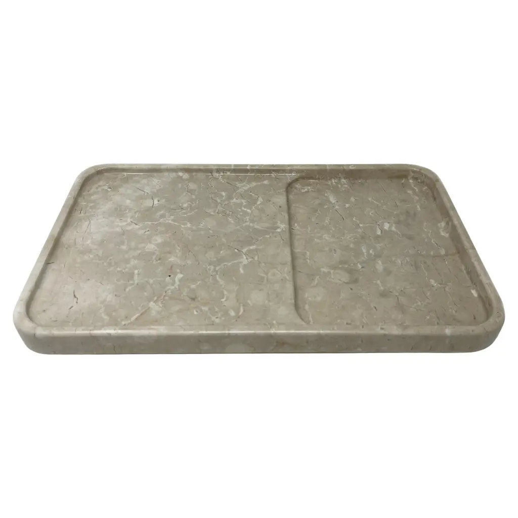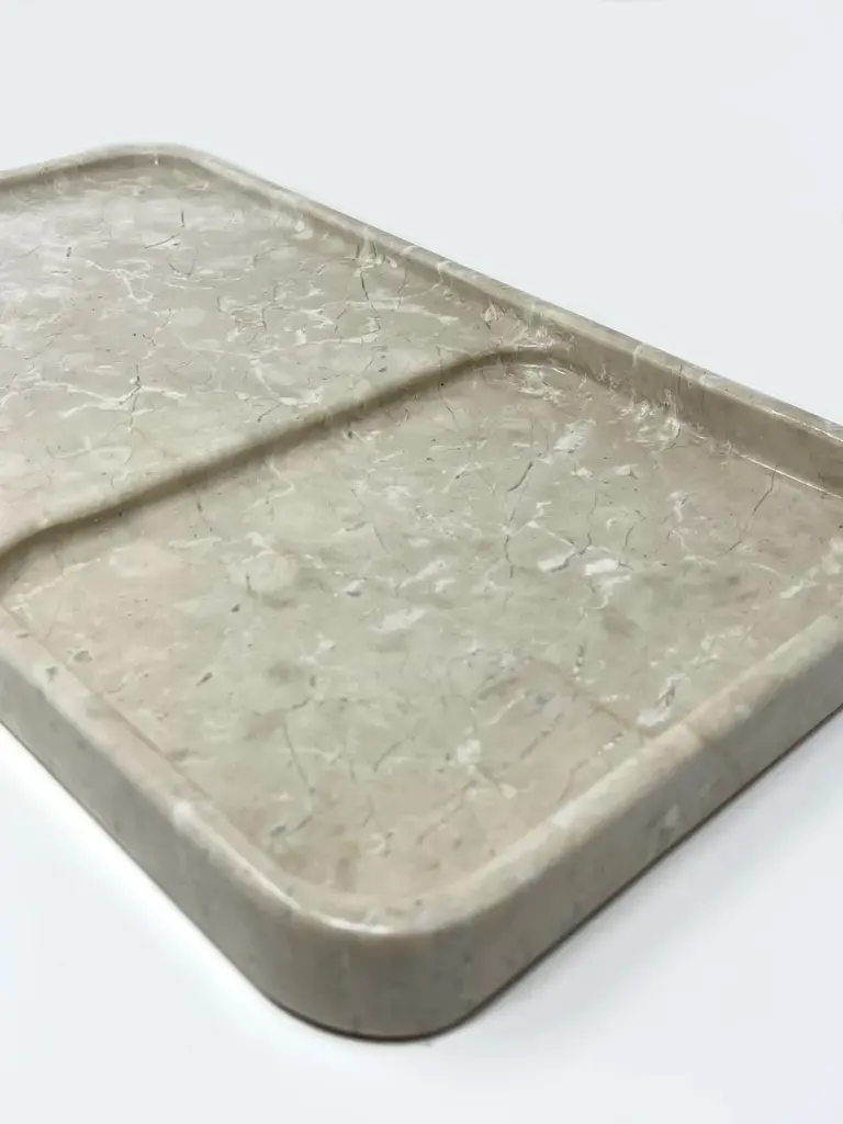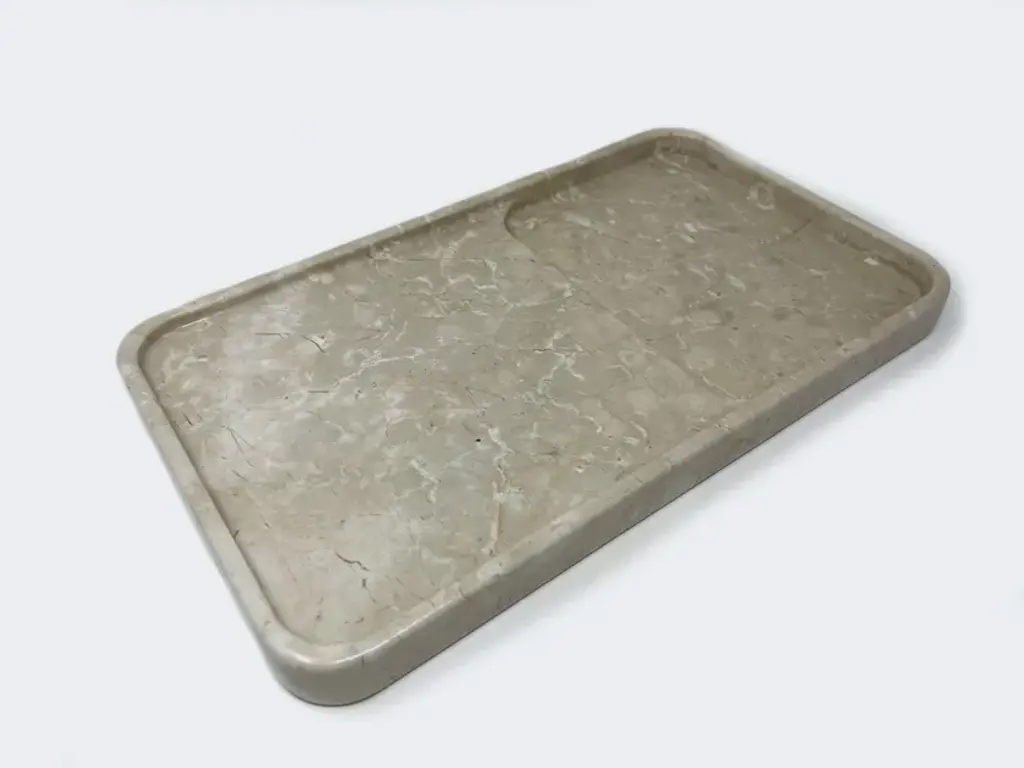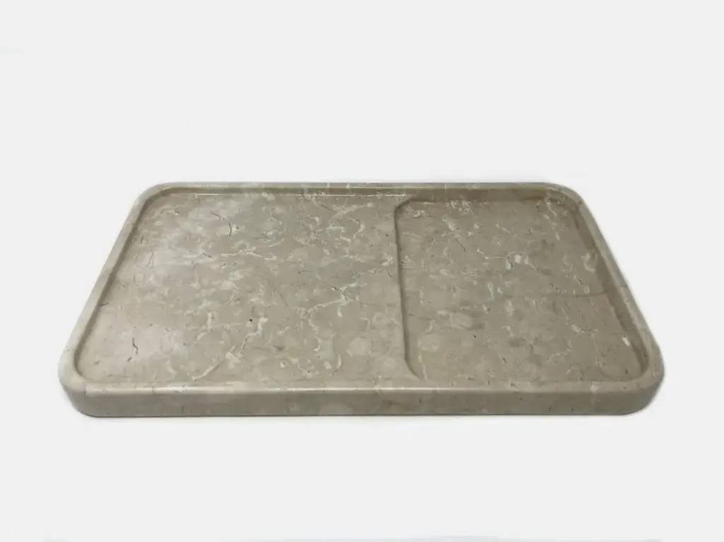 The Sabbia tray, made entirely of marble, can be used as a storage and emptying tray at home or in the office. This elegant marble tray, is also perfect for appetizers, arranging snacks in the hollow part and four glasses in the raised part. In addition, it can be used as a jewelry box or, in the bathroom, to rest bottles and dispensers.Proposed using Botticino Classico, Emperador Light, Calacatta Oro and Arabesco Grigio Orobico, the Sabbia marble tray can be customized according to the customer's wishes. It is possible to choose the material to make it more akin to the type of use and the environment in which it will be placed. Variations in color or slight imperfections are the result of the craftsmanship of this article and are not to be considered defects.
