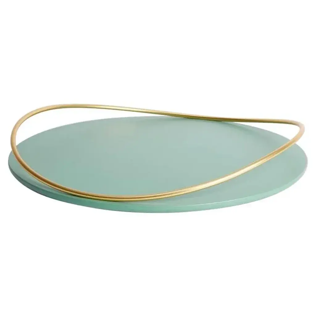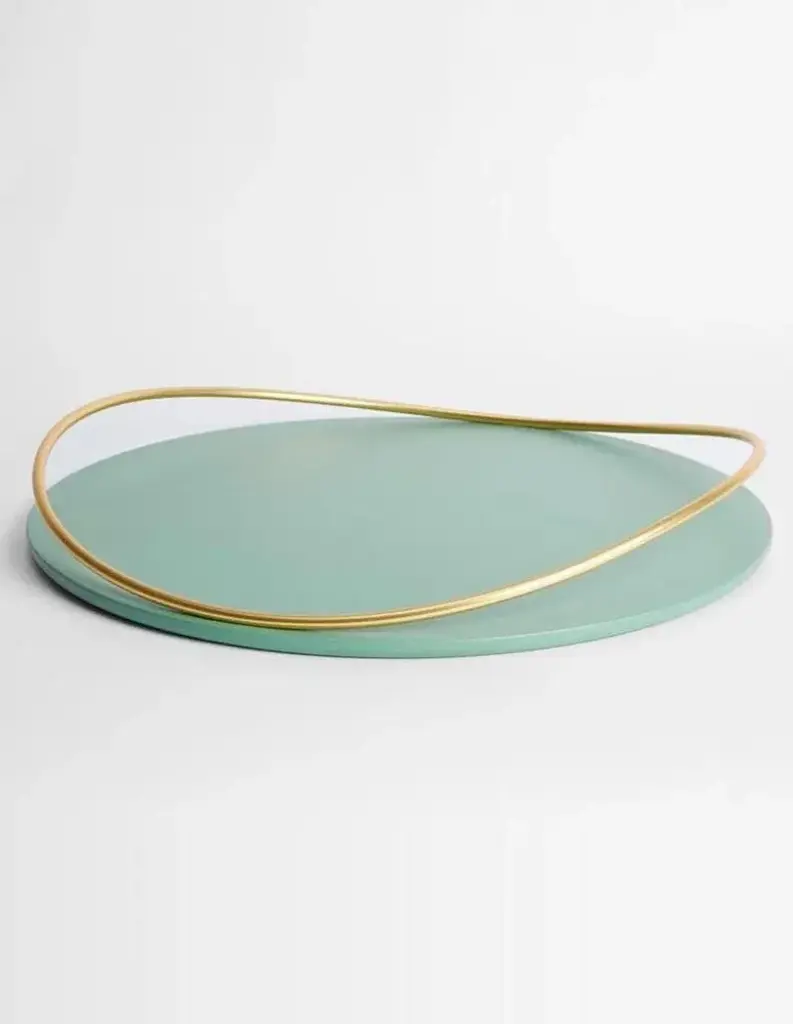Sage green touché a tray by Mason Editions Dimensions: 36 × 36 × 4.4 cm Materials: Iron and MDF Colours: taupe, cotto, burgundy, sage green, petrol green A light metal rod that rests on the surface and then lifts up, almost touching the surface with a quick tap, a movement that defines the handles of Touché trays. The organic shape of the round base communicates with the thin tubular, giving the impression of a perpetual undulatory motion, which seems to vanish when the trays are looked at from above. This small round tray with a small round handle is multi-functional, with a classic design that suits any decor. The round MDF base is available in several colours, with a slim handle in galvanized 24k gold. from serving drinks and canapés or as a refined centrepiece to display small objects and candles, it’s a must-have furnishing accessory.