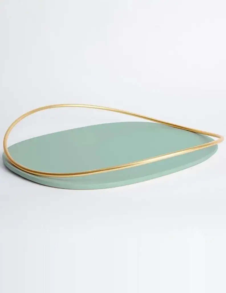 Sage green touché d tray by mason editions dimensions: 36 × 48 × 6.4 cm materials: iron and mdf colours: taupe, cotton, burgundy, sage green, petrol green a light metal rod that rests on the surface and then lifts up, almost touching the surface with a quick tap, a movement that defines the handles of touché trays. The organic shape of the oval base communicates with the thin tubular, giving the impression of a perpetual undulatory motion, which seems to vanish when the trays are looked at from above. This oval tray with a round handle won’t go unnoticed in the eyes of your party and dinner guests. The round mdf base is available in several colours, with a slim handle in galvanized 24k gold.