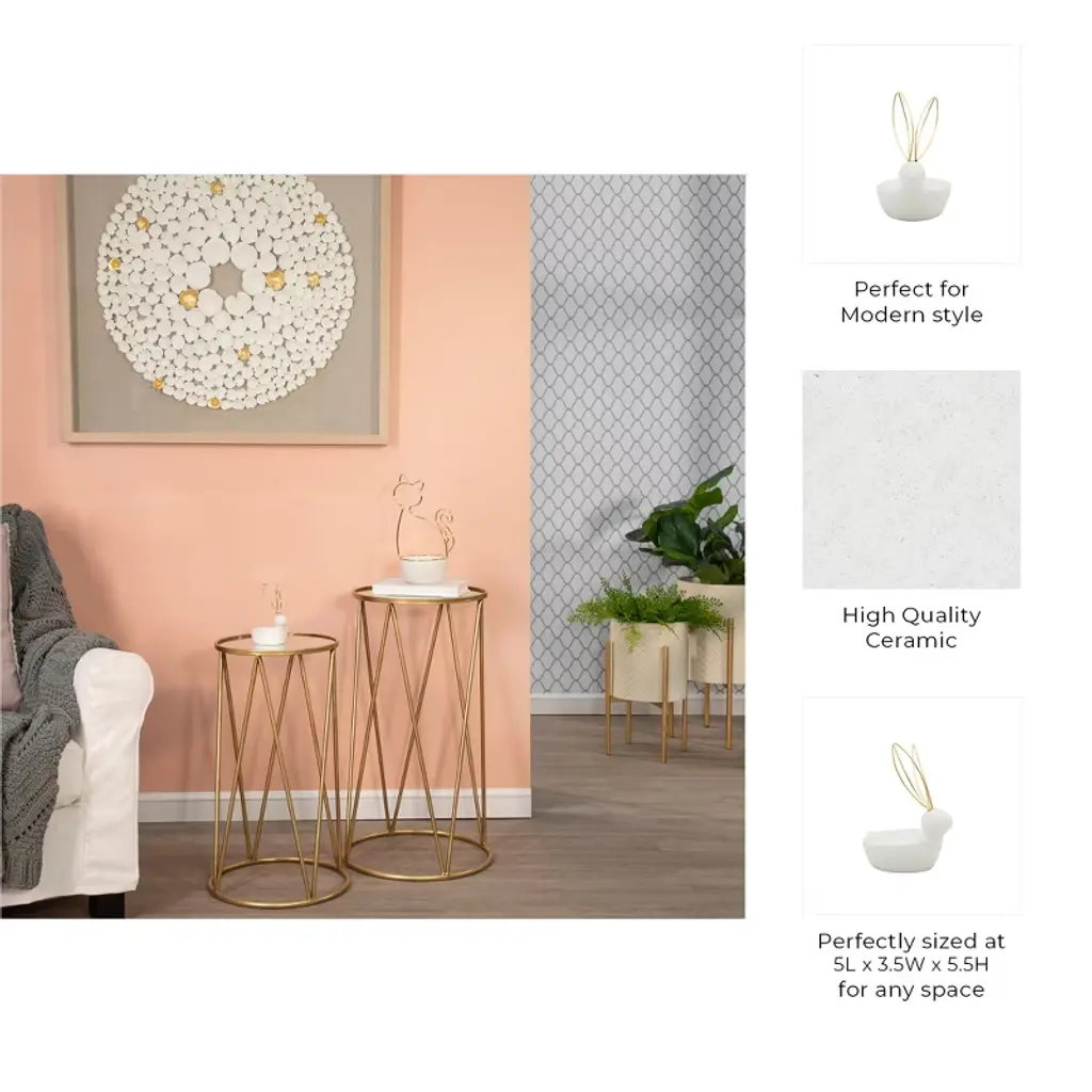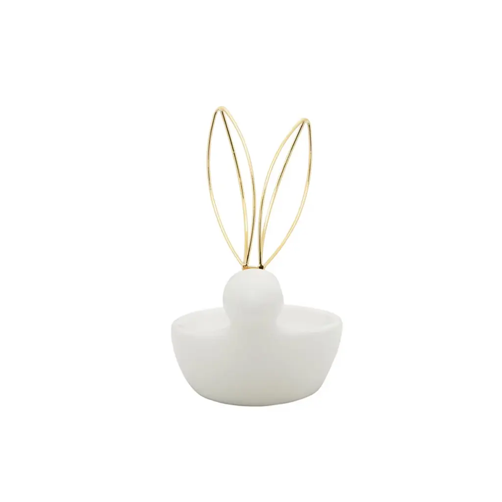 Sagebrook Home 6" Ceramic Trinket Tray - Bunny Rabbit Jewelry Holder In White With Gold Metal Ears - Decorative Jewelry Storage