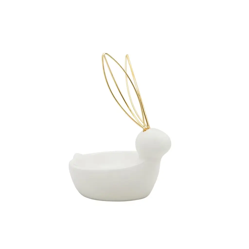 Somebunny told us you were looking for the perfect way to store and keep track of your jewelry and small trinkets! This ceramic trinket tray is ready to hop its way into your heart and into your home. In a contemporary color scheme of white with gold accents, this decorative jewelry holder will fit right in. Add to your bathroom counter, vanity, nightstand or wherever is convenient for durable, adorable storage of your rings, bracelets, earrings or other small trinkets. This bunny jewelry and trinket tray would also make an excellent gift for Easter, christening, birthdays, Christmas and more!
