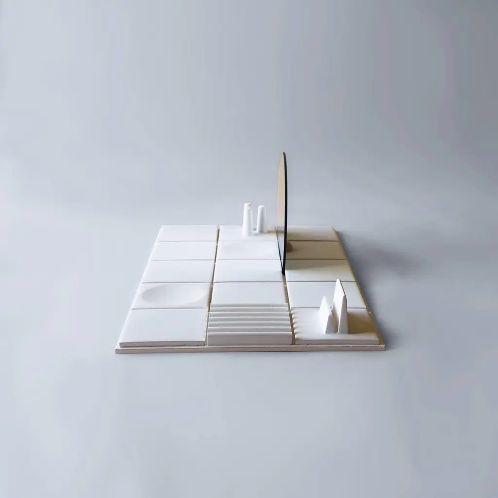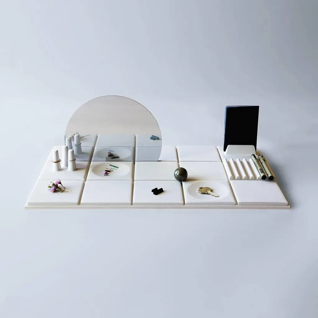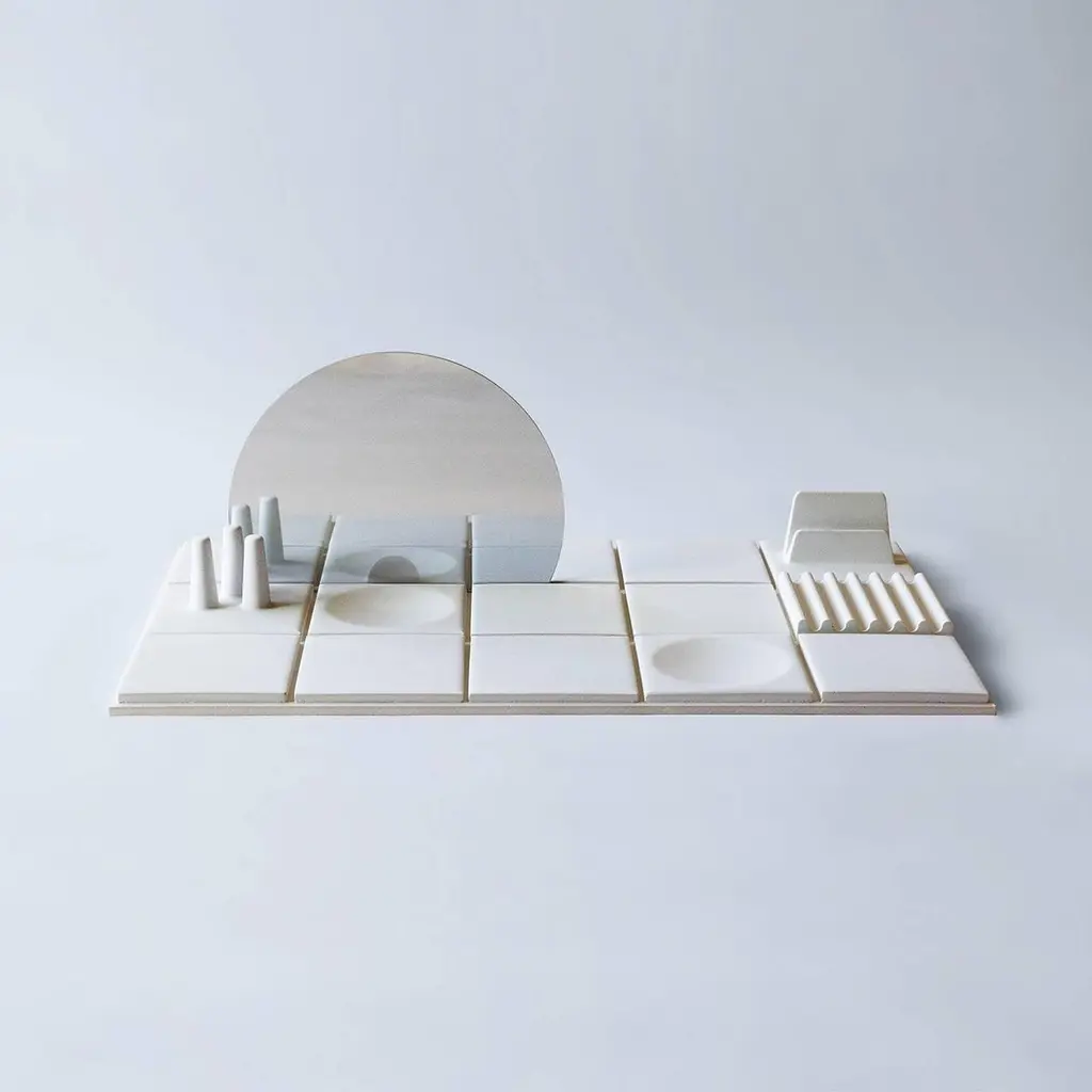 Cast in one pour, this piece is derived from classic bathroom tile to organize and curate your personal belongings. Perfect for your everyday essentials. A play on a classic architectural sample : the bathroom tile.Everyday it exists in the corner of our eye, an invisible actor of our daily routine.Out of context it becomes an object full of the rituals it witnessed.On the "wrong" surface it attracts the eye - desires a touch.Used the "wrong" way it is this newly found friend - that was always there.The Salle de Bain series plays on an oft-overlooked architectural detail: the bathroom tile. By displacing the familiar shape from a quotidian surface to its own distinct form, the cast-in- concrete tray becomes a stage in which you can curate and display your favourite belongings for easy use. Three different sizes in simple geometries accommodate myriad items and routines.Each tray is cast in concrete as a single piece. ~Cast concrete / Gypsum cement / Handmade~ L:22" W:13.25" H:7"~ 7lbs.