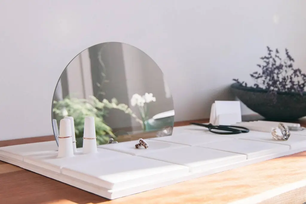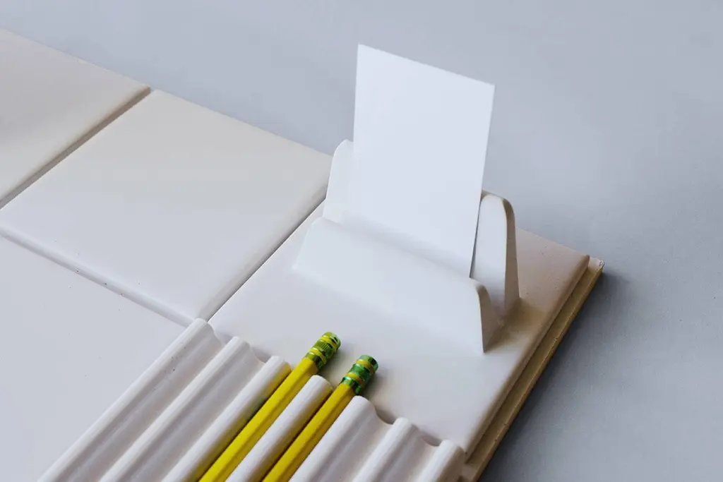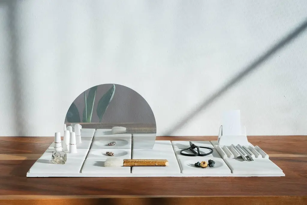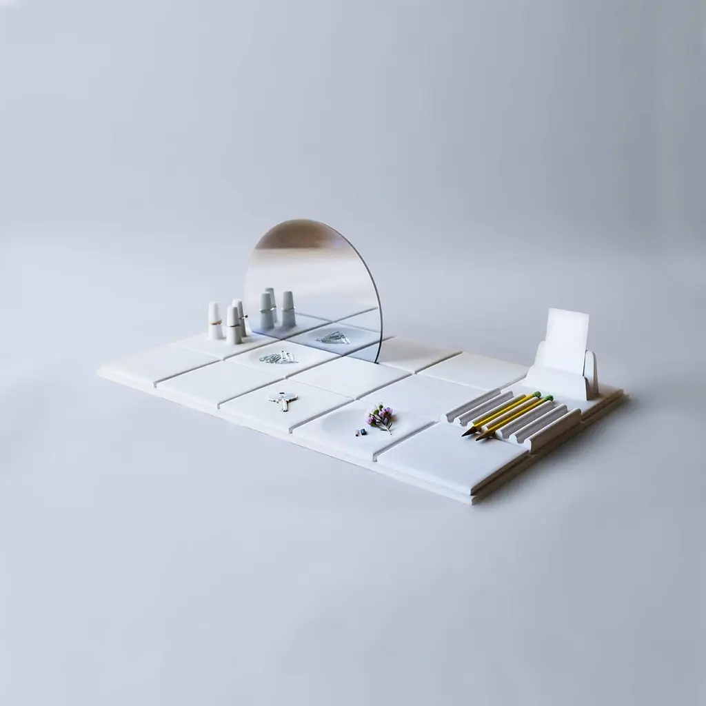 Cast in one pour, this piece is derived from classic bathroom tile to organize and curate your personal belongings. Perfect for your everyday essentials. A play on a classic architectural sample : the bathroom tile.Everyday it exists in the corner of our eye, an invisible actor of our daily routine.Out of context it becomes an object full of the rituals it witnessed.On the "wrong" surface it attracts the eye - desires a touch.Used the "wrong" way it is this newly found friend - that was always there.The Salle de Bain series plays on an oft-overlooked architectural detail: the bathroom tile. By displacing the familiar shape from a quotidian surface to its own distinct form, the cast-in- concrete tray becomes a stage in which you can curate and display your favourite belongings for easy use. Three different sizes in simple geometries accommodate myriad items and routines.Each tray is cast in concrete as a single piece. ~Cast concrete / Gypsum cement / Handmade~ L:22" W:13.25" H:7"~ 7lbs.