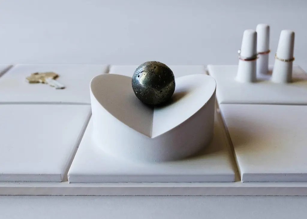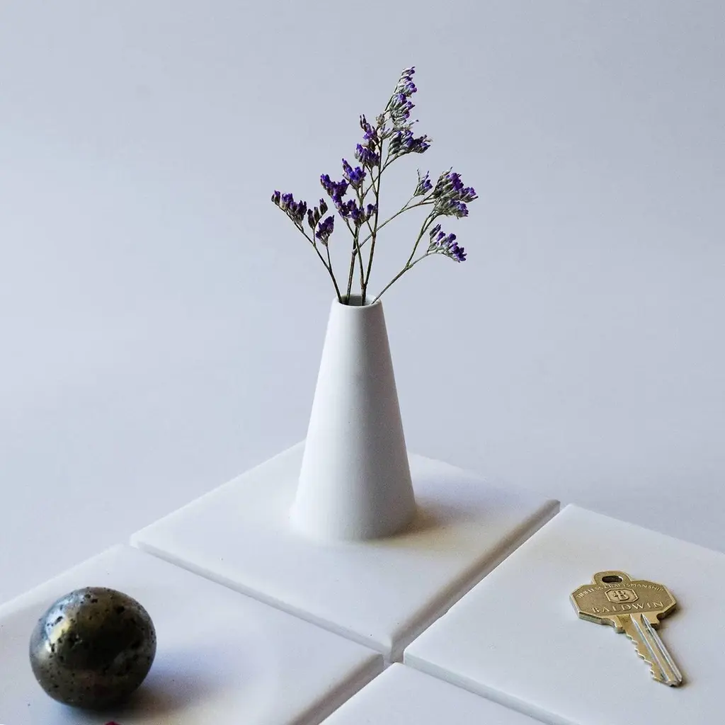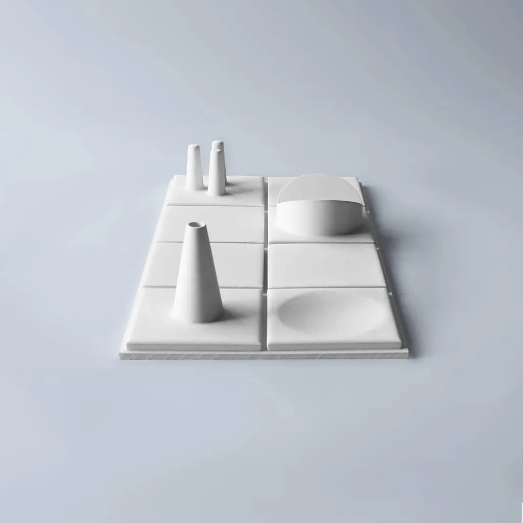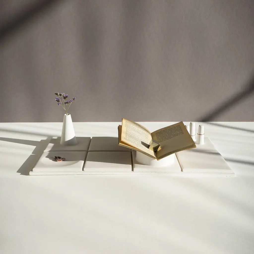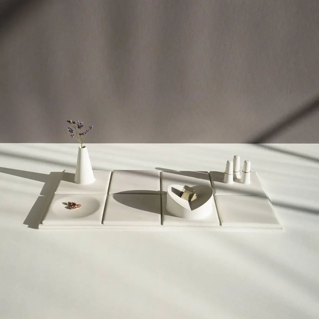 Cast in one pour, this piece is derived from classic bathroom tile to organize and curate your personal belongings. Perfect for your everyday bedside table items, including a tube for a fresh flower.A play on a classic architectural sample : the bathroom tile.Everyday it exists in the corner of our eye, an invisible actor of our daily routine.Out of context it becomes an object full of the rituals it witnessed.On the "wrong" surface it attracts the eye - desires a touch.Used the "wrong" way it is this newly found friend - that was always there.The Salle de Bain series plays on an oft-overlooked architectural detail: the bathroom tile. By displacing the familiar shape from a quotidian surface to its own distinct form, the cast-in- concrete tray becomes a stage in which you can curate and display your favourite belongings for easy use. Three different sizes in simple geometries accommodate myriad items and routines.Each tray is cast in concrete as a single piece. Cast concrete / Gypsum cement / HandmadeMeasures: L 18", W 9", H 3.5"5lbs.
