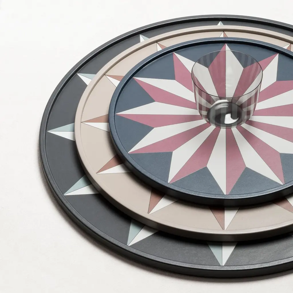 With patterns that take inspiration from details found in suggestive corners of Venice, these printed leather trays are a celebration of the iconic city on water. Featuring different sizes and shapes, the Venezia collection combines historic legacy with modernity and is the expression of the artistic and cultural vivacity that marks the city’s history. Decoration inspired by the rosette on the floor of the vestibule of the Marciana National Library in Venice.