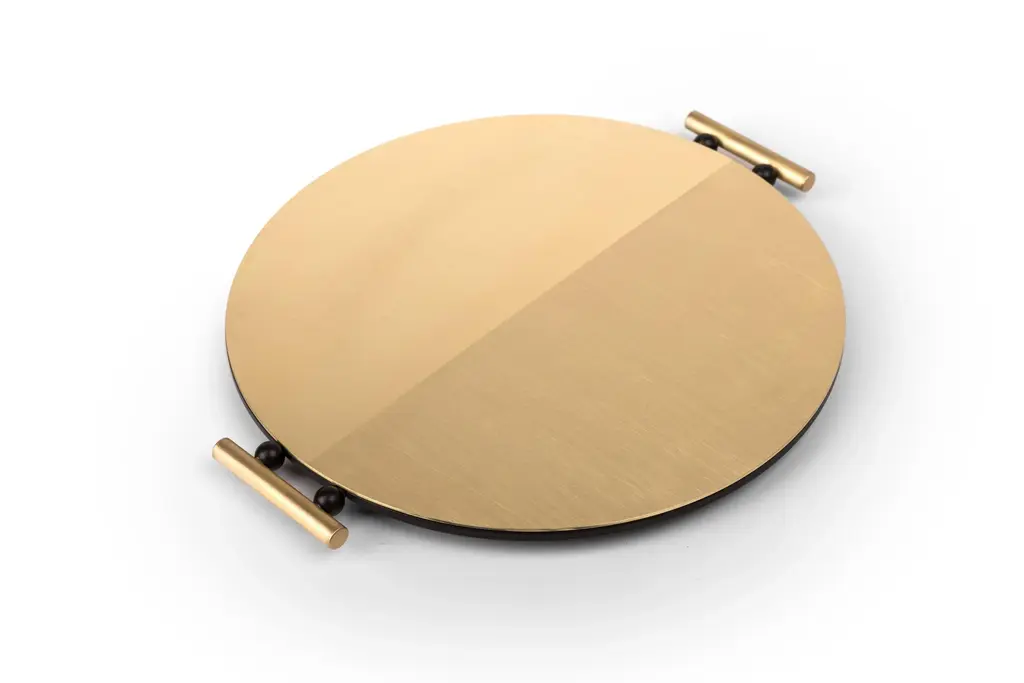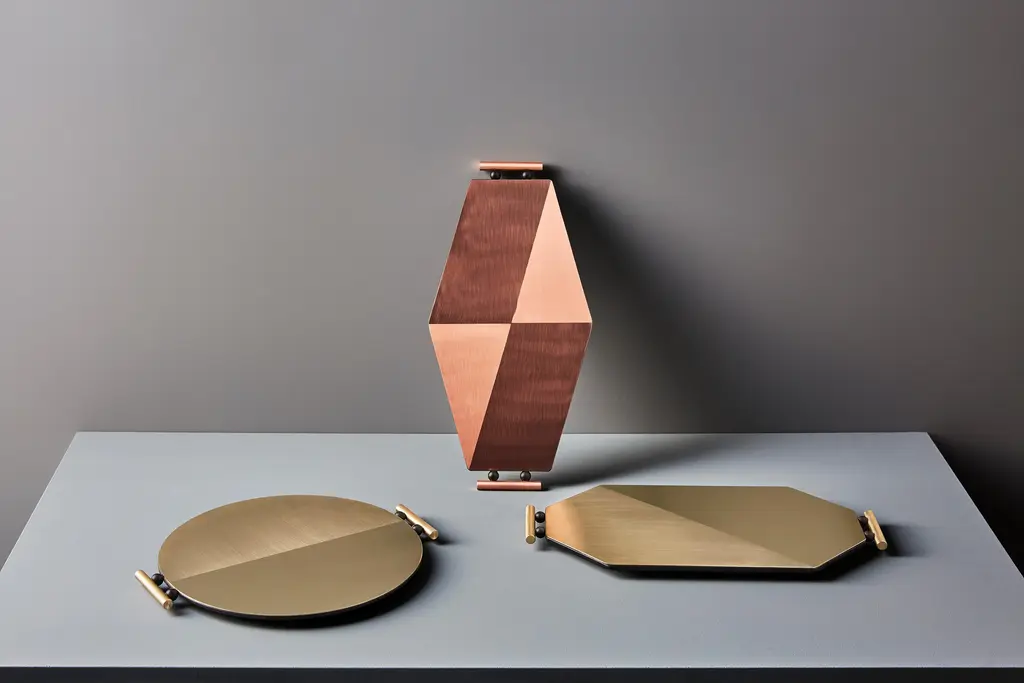Set of 3 satin trays by mingardo dimensions: d35 x w18 x h2 cm // d35 x w18 x h2 cm // d30 x w26 x h2 cm. Materials: natural brushed and polished brass with a ral 9005 varnished iron base. Weight: 9 kg also available in different finishes: natural brushed and polished brass or copper with ral 9005 varnished iron base; natural brushed and polished brass or copper with ral 9005 varnished iron base; natural brushed and polished brass or copper with ral 9005 varnished iron base.please contact us. A set of copper and brass covered trays that reminds of the bauhaus silver objects.