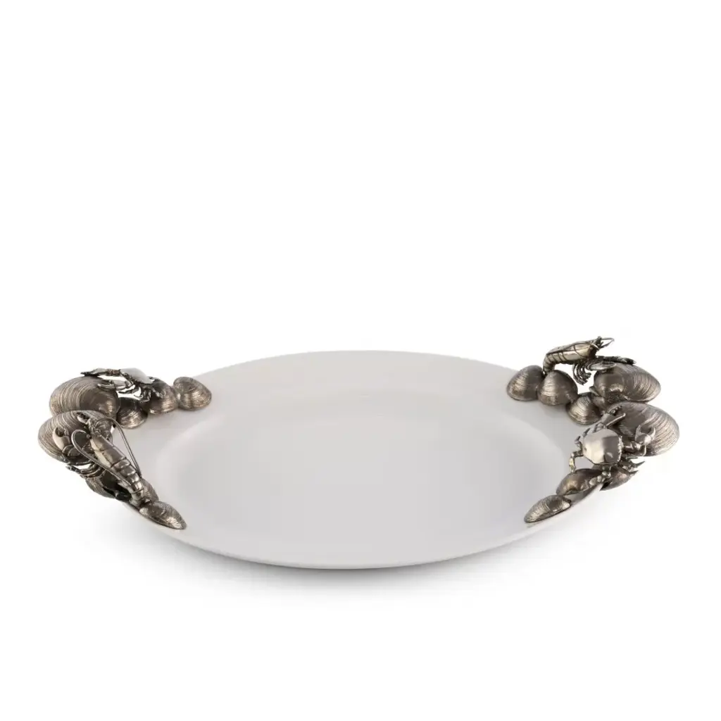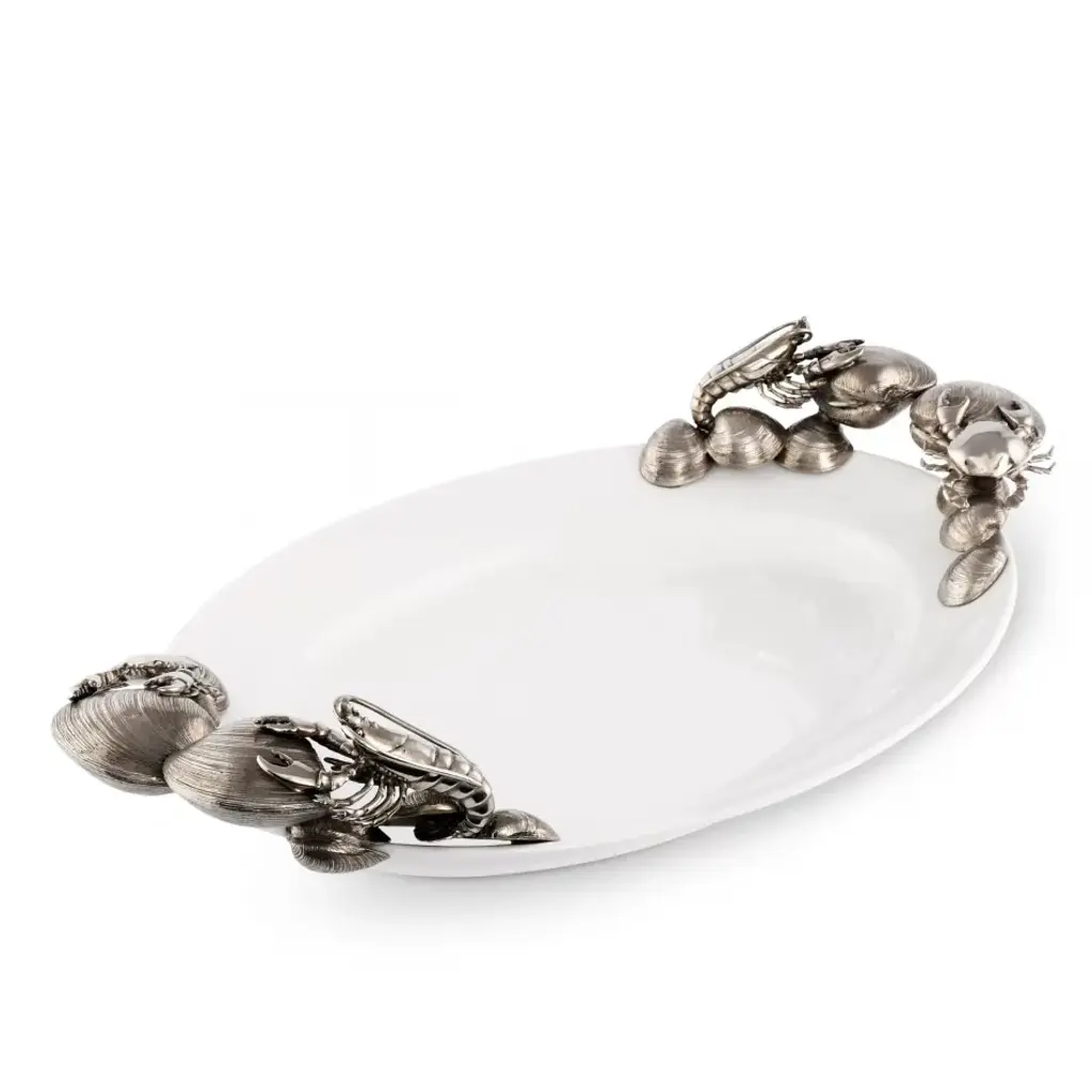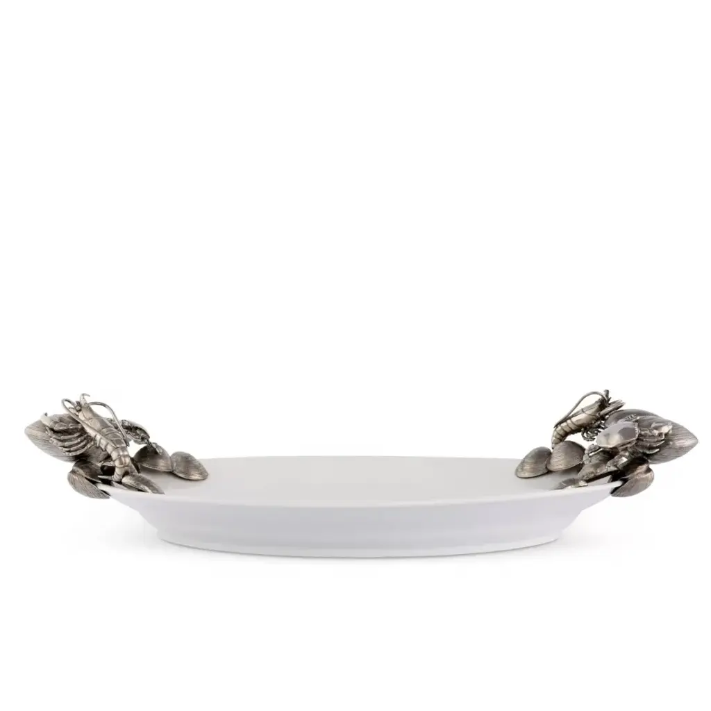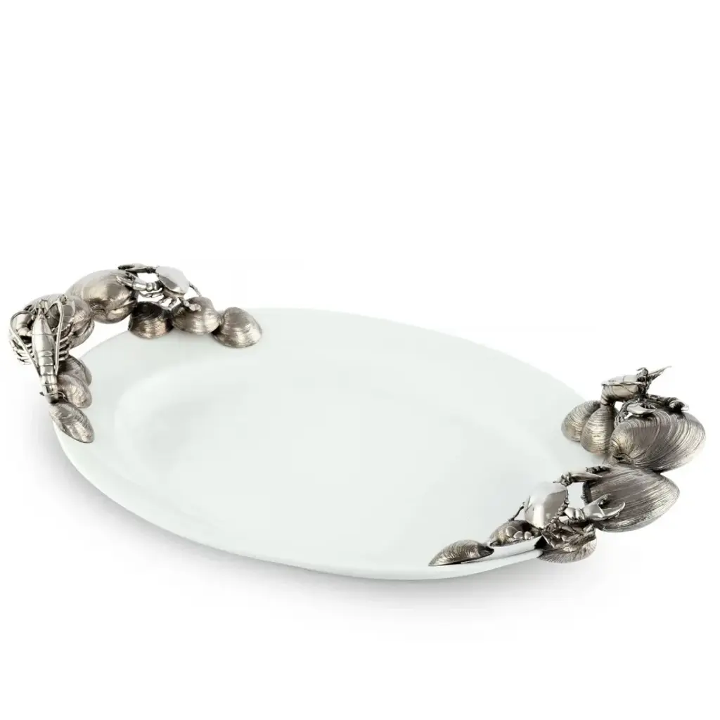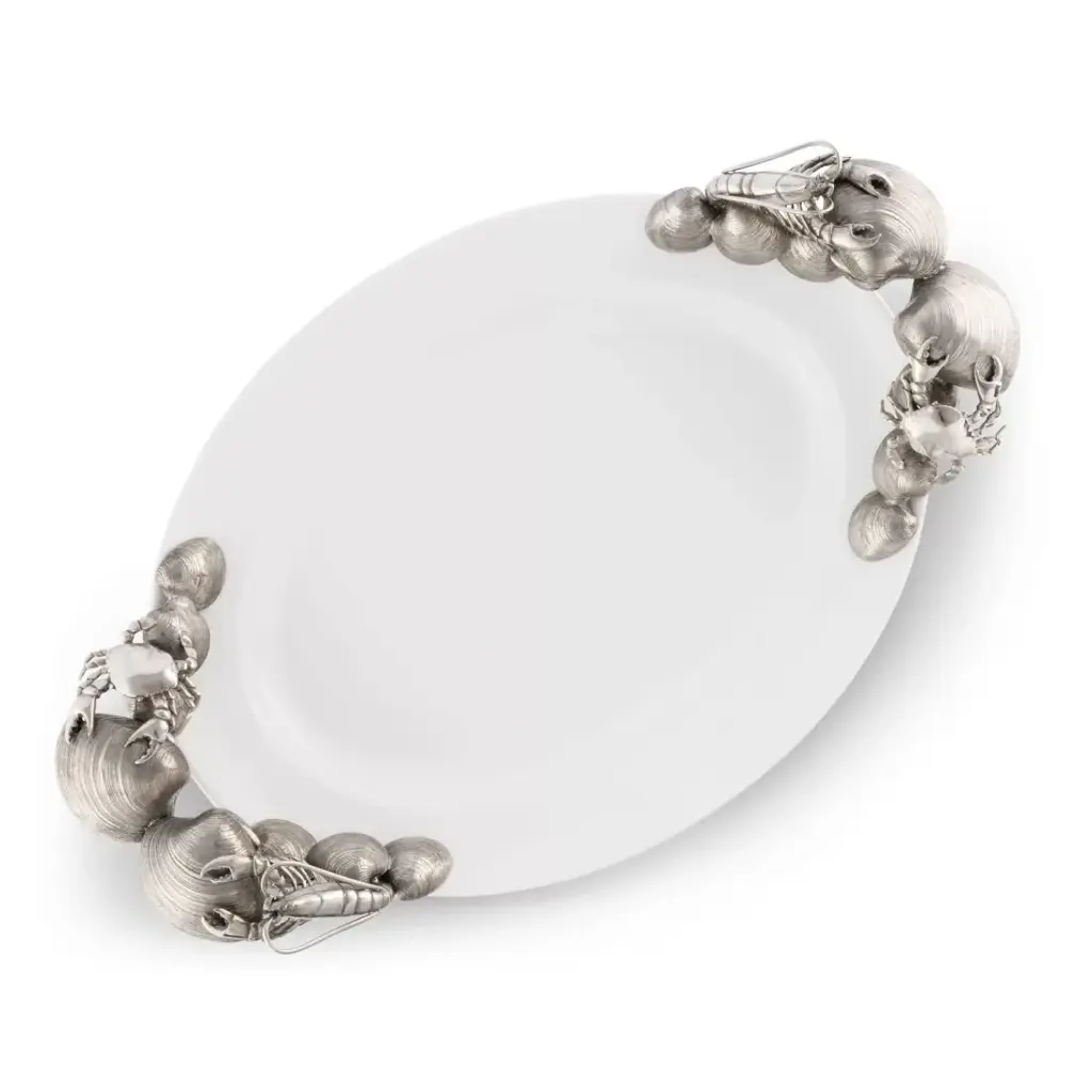Crabs, cockles, clams and prawns, intricately and realistically detailed in pure Vagabond House pewter are clustered to form the handles of our large, lustrous oval Marine Life Stoneware Serving Tray. Perfect for serving a seafood feast and expressing your marine style, these trays are also the perfect gifts for your hosts. Vagabond House is a family-owned American company specializing in fine pewter tableware, servingware and giftware. Largely inspired by nature, their exclusive products are designed to be unique, functional heirlooms for those who seek to express tradition and style in both family and formal entertaining.