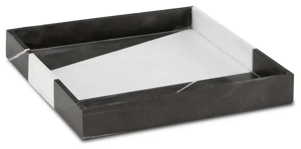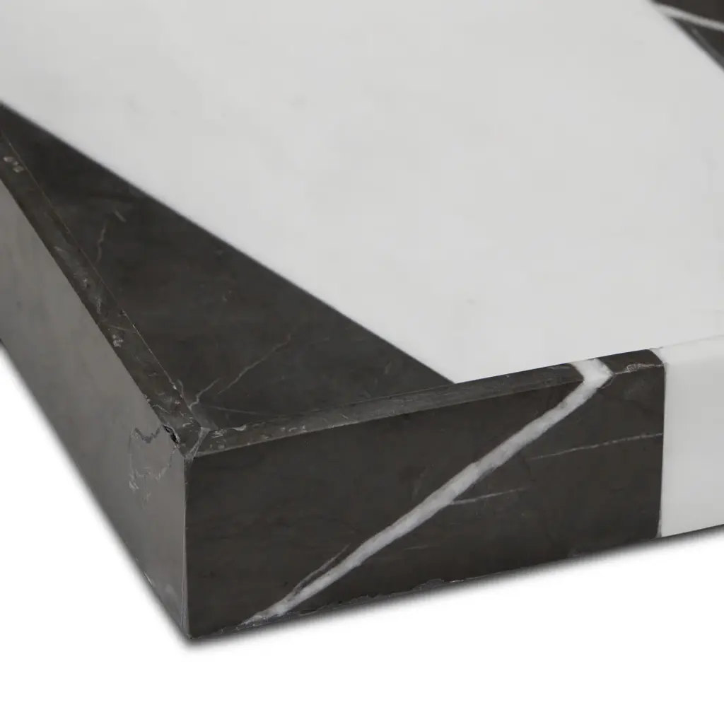 The Sena Marble Tray is geometrically sophisticated. The white and pietra gray marble are juxtaposed against each other in a dynamic way: a white swath of slices through the middle of the entire tray on slant, folding up from the bottom to the sides. The solid marble black and white decorative tray has mitered joints and a composite coating on the bottom to keep it from scratching surfaces.