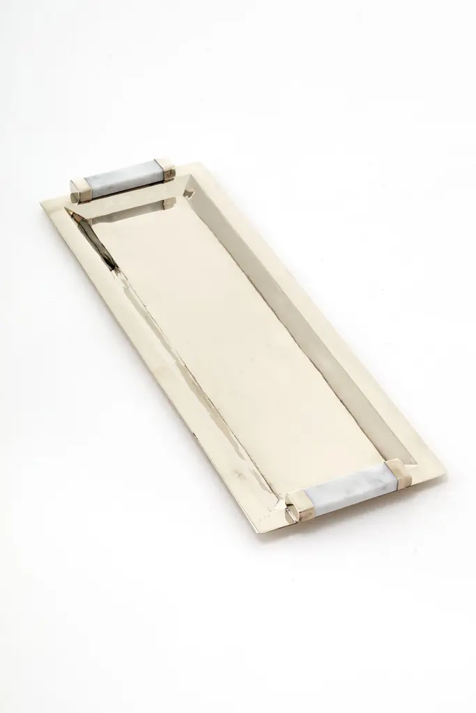 11.8" x 5"15.5" x 5.7"19.5" x 6"With the concept of intermingle materials from our earth, soft marbles and manually hammered alpaca, this sophisticated and elegant line is created, and it includes trays, champagne buckets and pitchers in different forms and sizes.Our pieces are made by hand. One of a kind.All natural stones may vary in color.