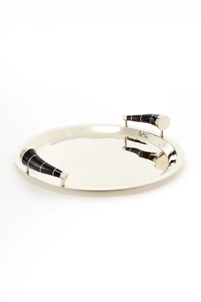 20 x 20 cm49 x 9 cm28 x 12 cm The calm, peace and stillness of the Villa La Angostura lakes, together with its woods, are transmitted to the handles and the relaxed shapes of the trays, pitchers, cutlery and champagne buckets of this family, elaborated with the combination of materials such as alpaca and black cow horns.Our pieces are made by hand. One of a kind.All natural stones may vary in color.