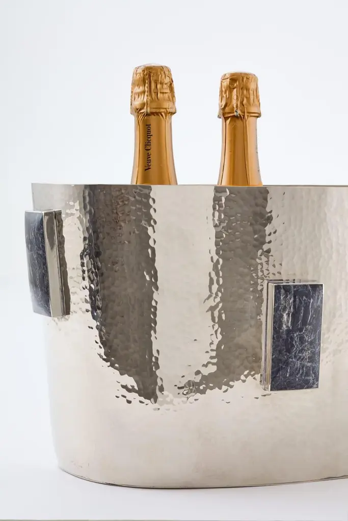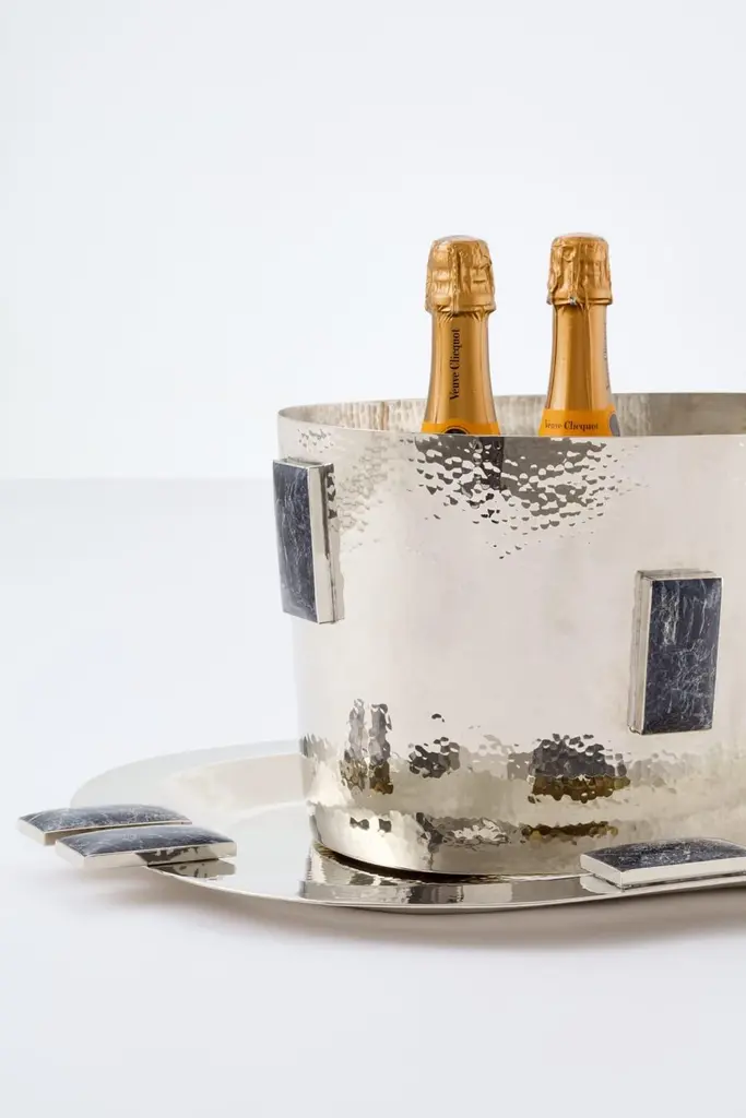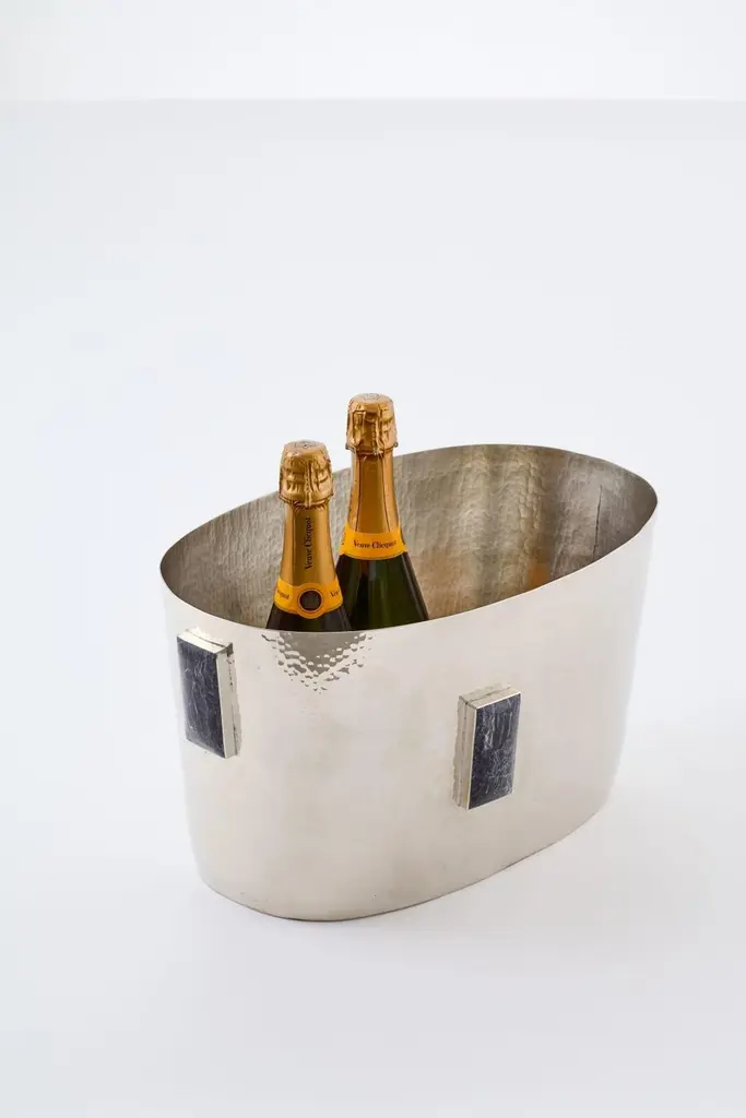 Set Large Glaciar Silver Alpaca & Black Onyx Stone Bar Tray & Champagne Bucket