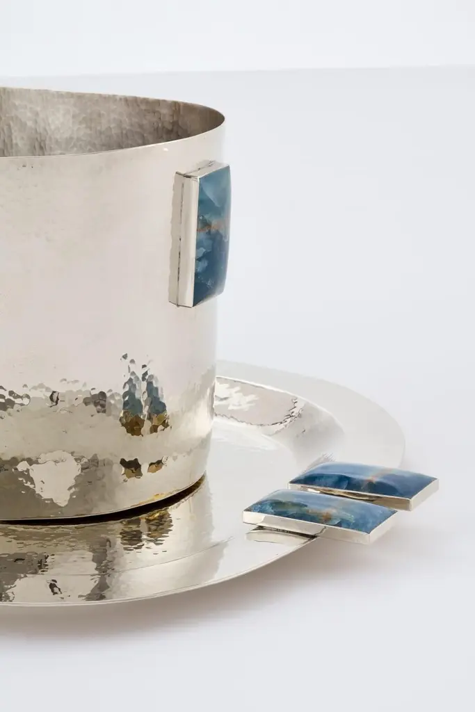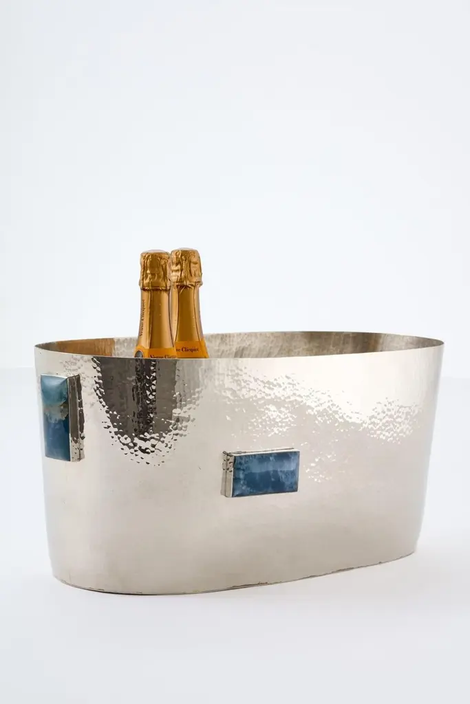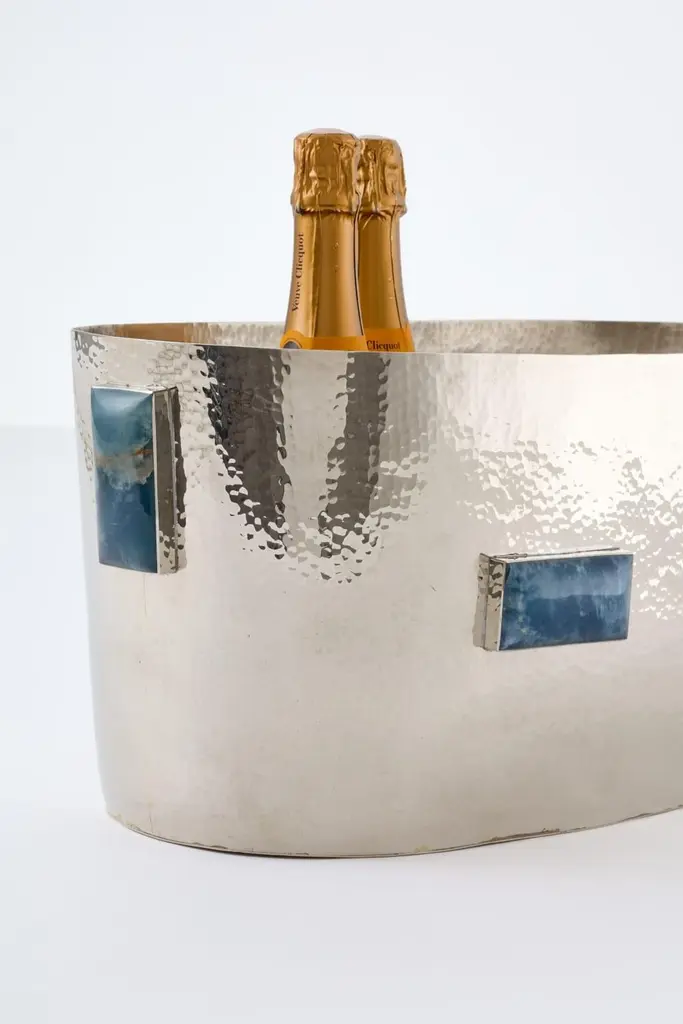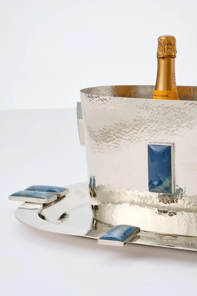 Set Large Glaciar Silver Alpaca & Blue Onyx Stone Bar Tray & Champagne Bucket