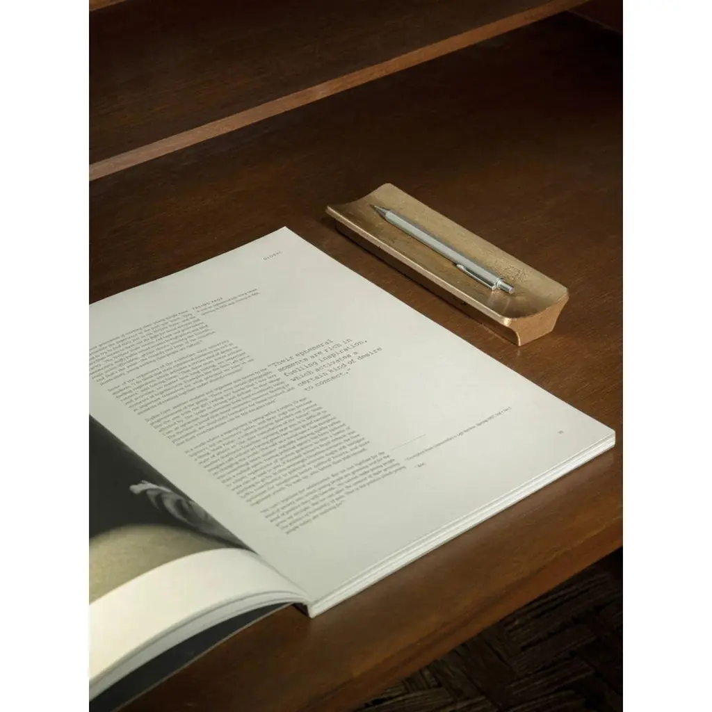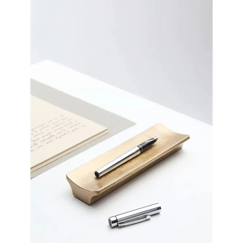 Set of 2 Brass Arc Pen Trays by Stem DesignDimensions: D 6 x W 18 x H 2.5 cm.Materials: Brass.Finish: Tumbled and burnished.Weight: 0,7 kg (each.)Finished and assembled by hand in India. Also available in aluminum. Please contact us. Arc pen tray is designed as a pedestal for a pen that you hold close.The linear piece with an elevated concave surface graciously exhibits any writing instrument and demonstrates a sculptural quality through its simplified form.The objects layers on as a metaphor and showcases the beauty of being who you are. It strips off all the layers of ornamentation and artificial finishes to build an immediate and intuitive connection with the product that lasts a lifetime.Stem is a contemporary Indian product design studio creating hand-crafted lighting and home accessories. Led by Aman Bhayana and Sugandhi Mehrotra, the studio’s philosophy revolves around storytelling, aiming to evoke a deep sense of connection with each product. Our vision is to create an immersive experience where art seamlessly integrates into everyday living. While honoring traditional craftsmanship, each piece is carefully hand-crafted, showcasing attention to detail and a sense of individuality. The designs are sustainably crafted to endure the test of time, gracefully aging with each passing year. These products become bearers of stories, connecting generations and serving as a source of inspiration throughout a lifetime.