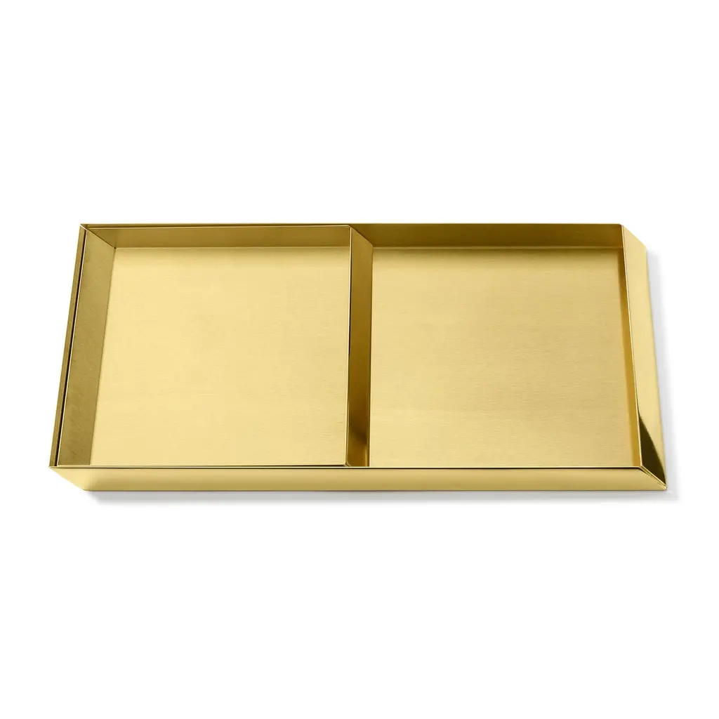 The compositional scheme of this family of small trays is the axonometric isometric projection of two parallelepipeds which creates a three-dimensional optical effect implemented by inclined edges and by contrasting metal finishes. Like in a game, you can get as many configurations as you wish, always creating different designs.Materials:Brass.