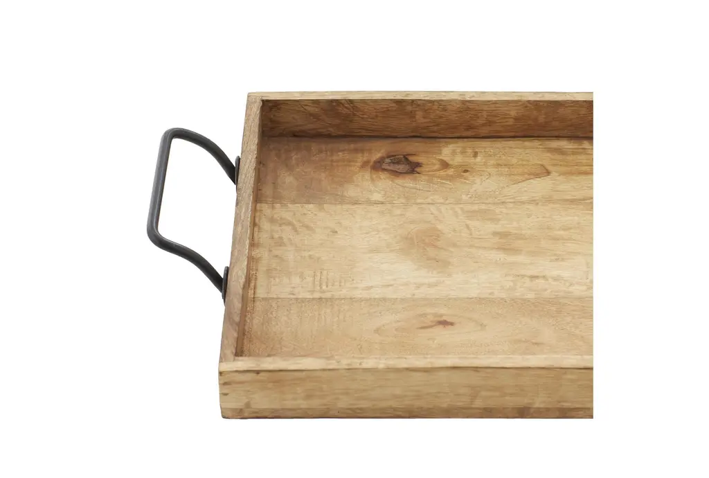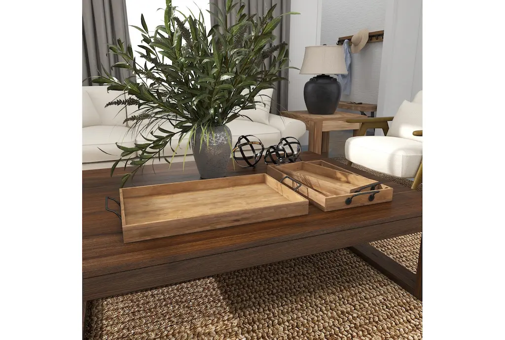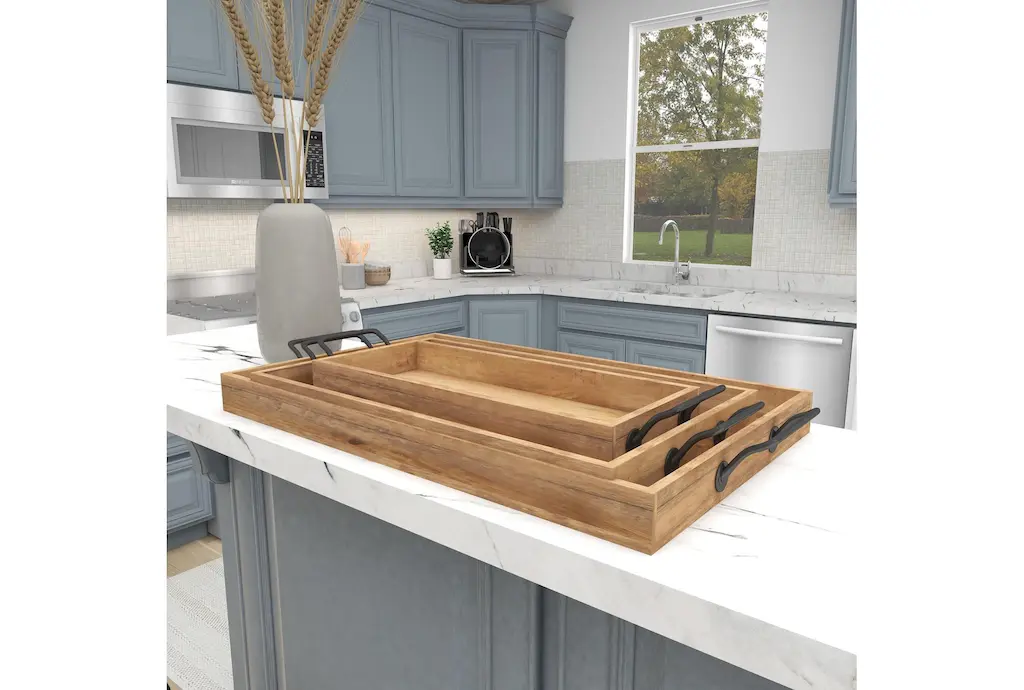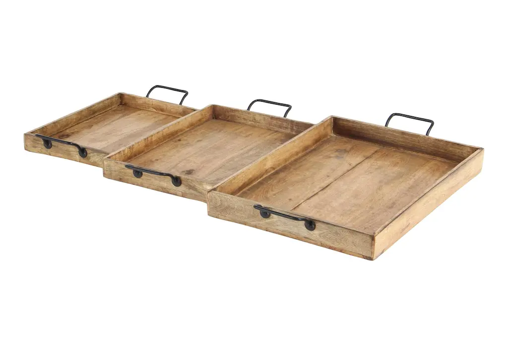Set Of 3 Brown Natural Wood Metal Serving Trays | Sets | 3 Piece | Rectangle | Handles