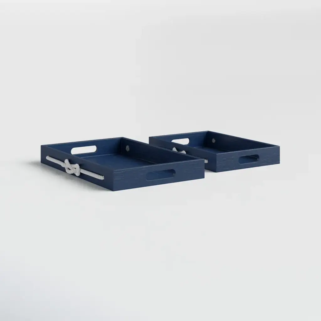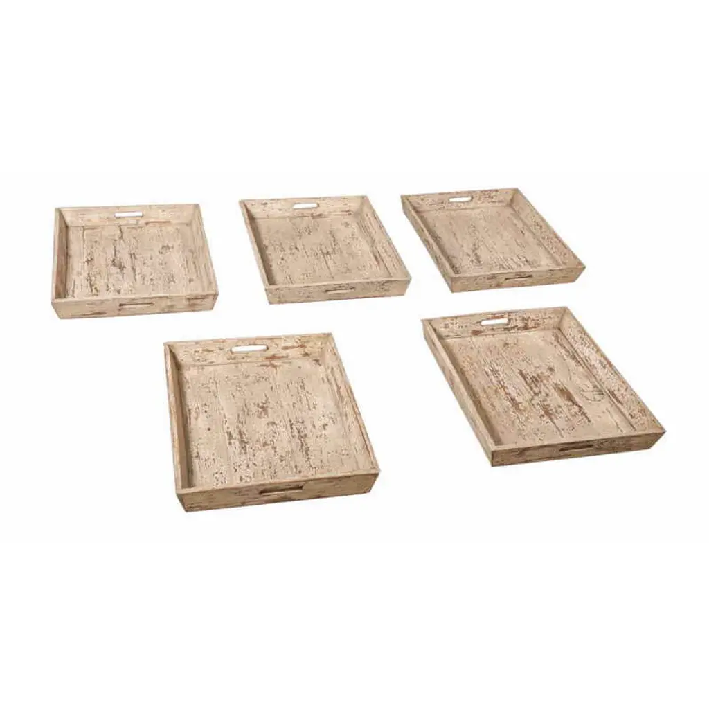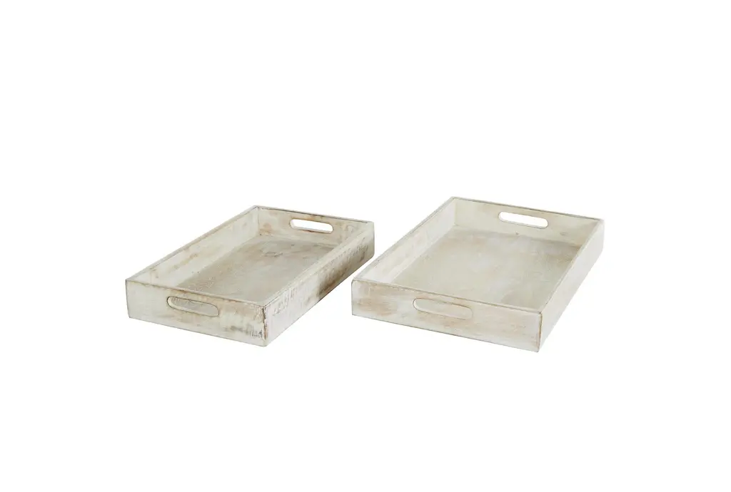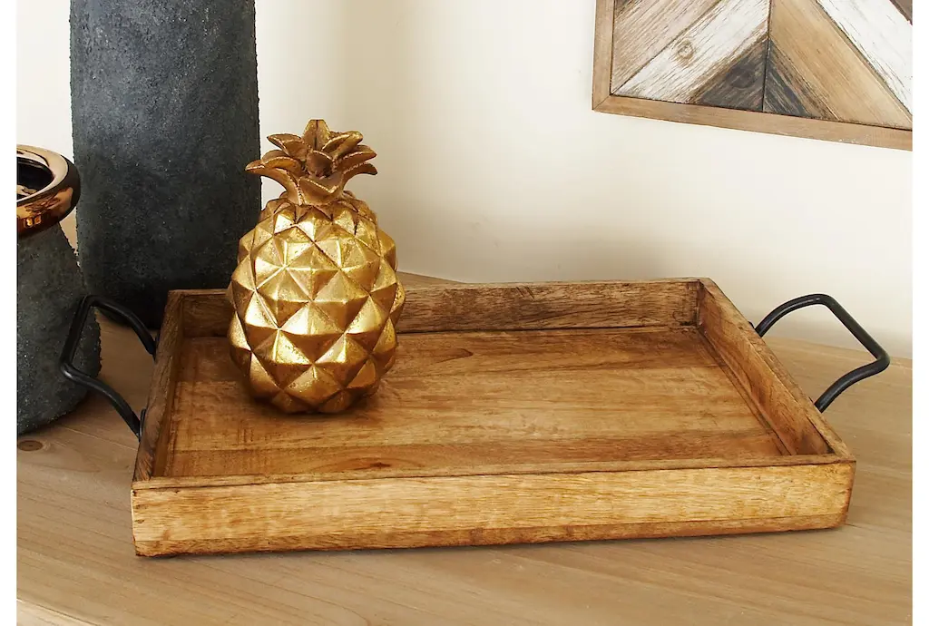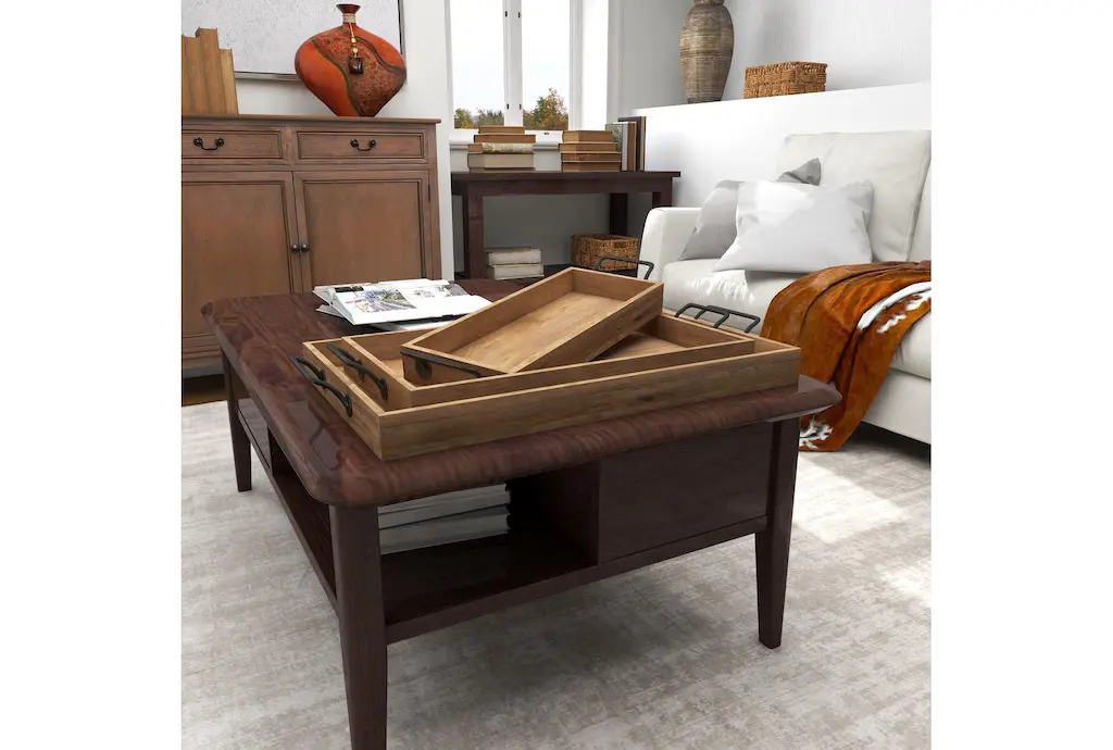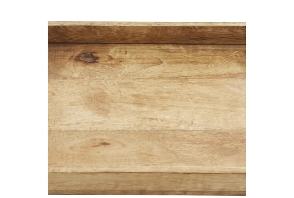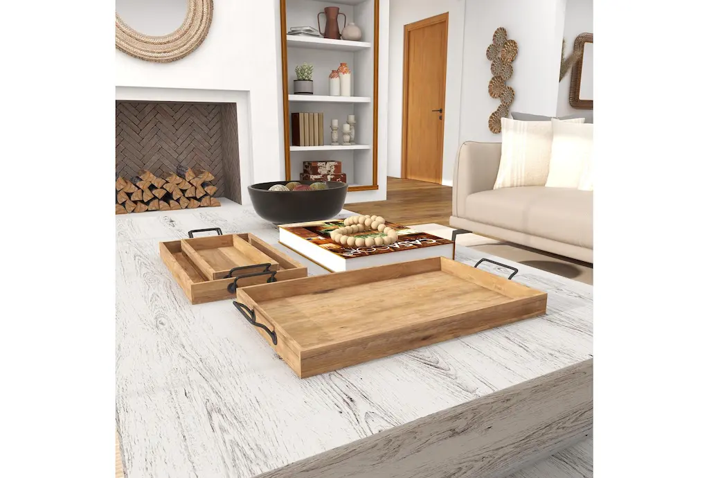 Ideal as decorative tray additions for shelves, coffee tables, the dining area, the kitchen, the living room, and coffee shops. Designed with felt or rubber stoppers at the base that prevent scratching furniture and table tops, as well as sliding around. This item ships in 1 carton. Please note that this item is for decorative purposes only and is not food safe. Mango wood tray makes a great gift for any occasion. Suitable for indoor use only. This item ships fully assembled in one piece. Made in India. This brown colored ottoman tray comes as a set of 3. Rustic style.