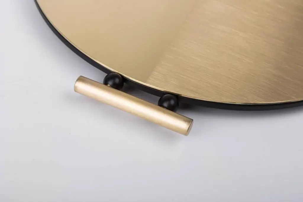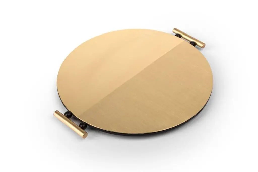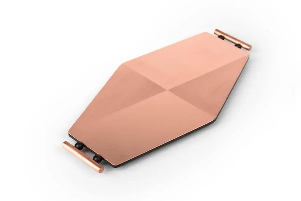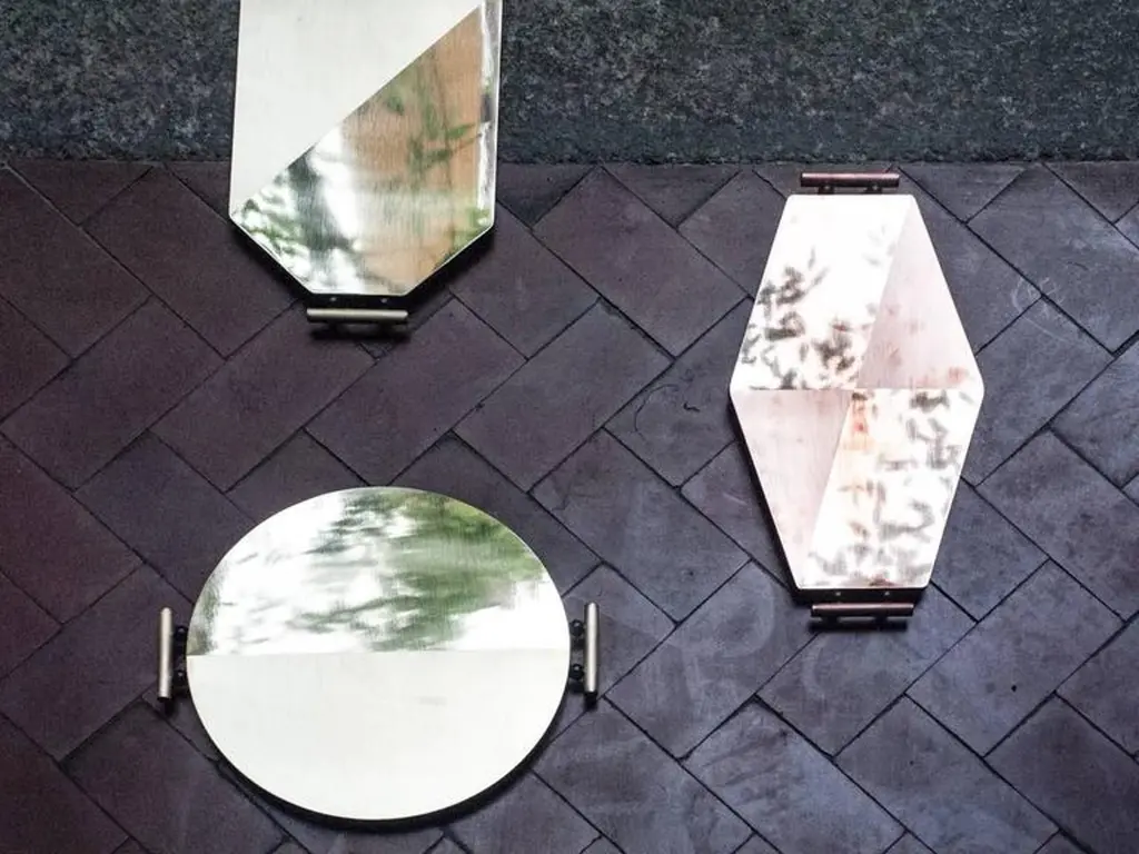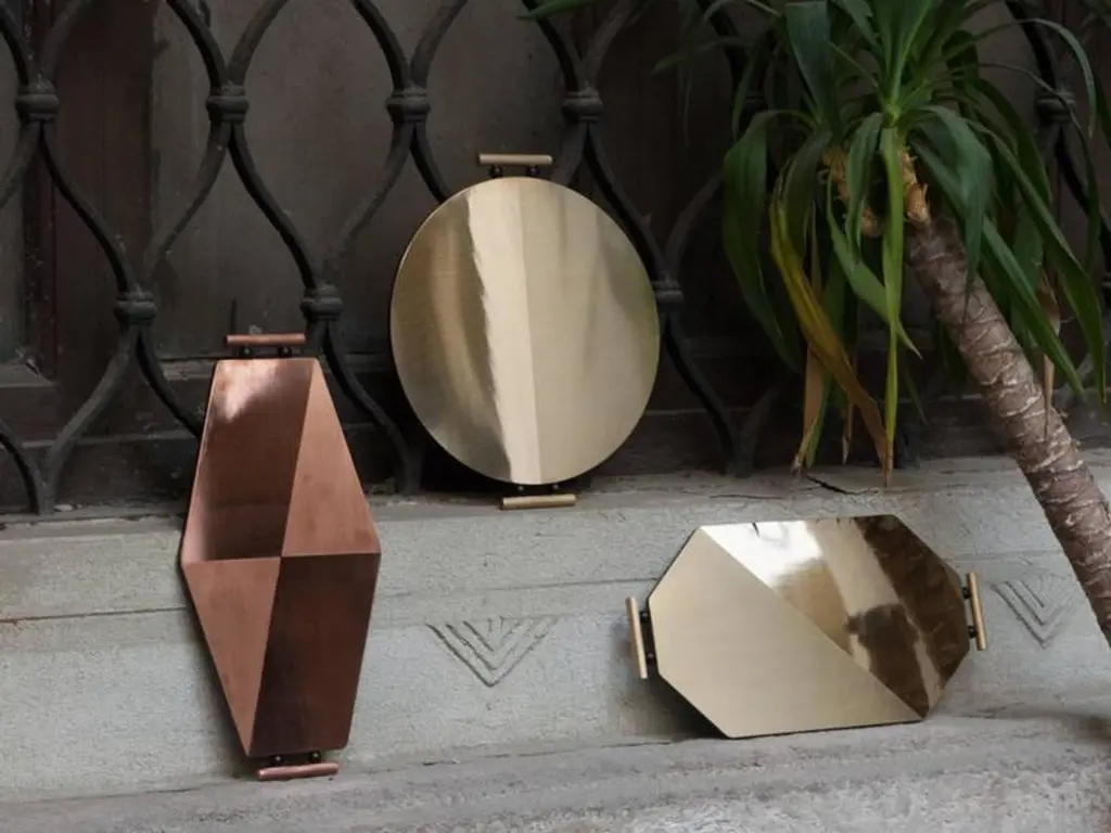 A family of trays covered by copper and brass that wink at Bauhaus period silvers. Available in natural brass top or natural copper top.Octagonal tray 18 x 35 cm.Exagonal tray 18 x 35 cm.Round tray dia 26 cm.