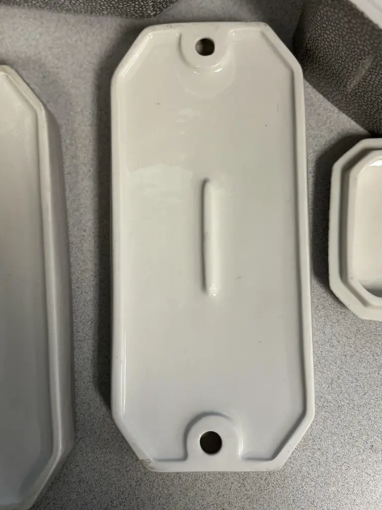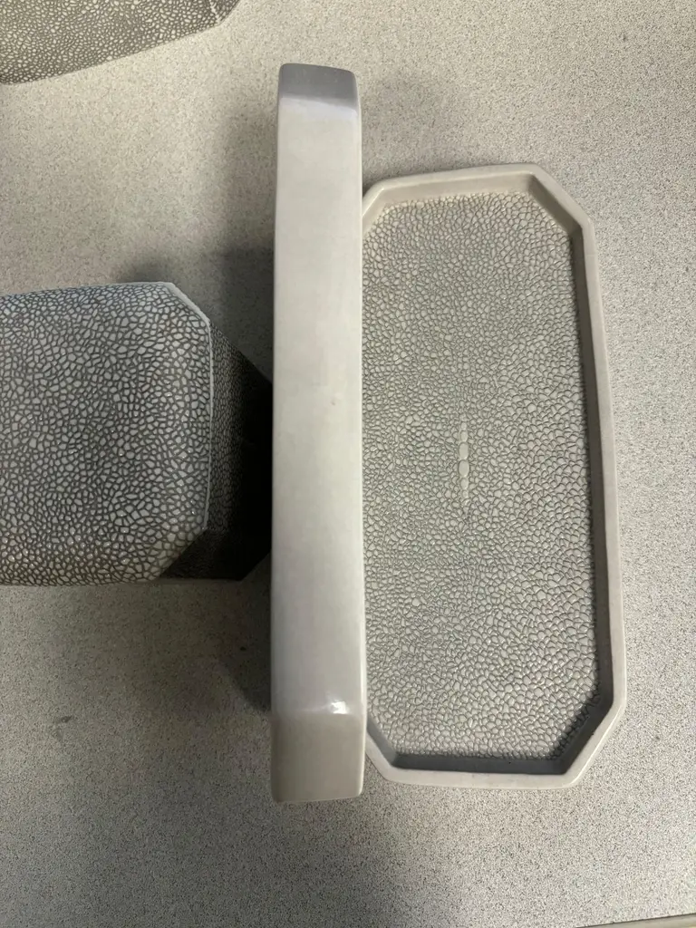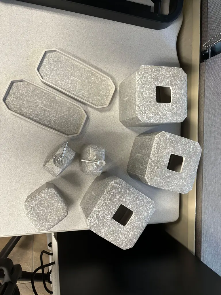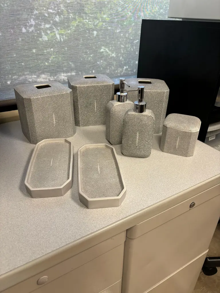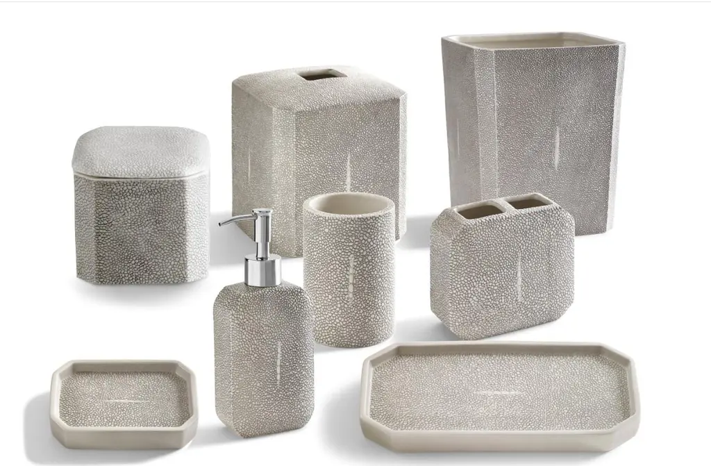 Porcelain embossed with a shagreen-look (stingray) detail, this lovely set is a great addition to any bathroom. (Additional pieces in this set are available.)