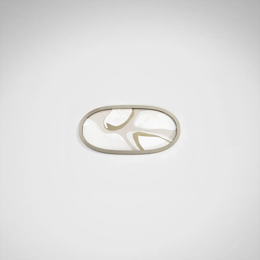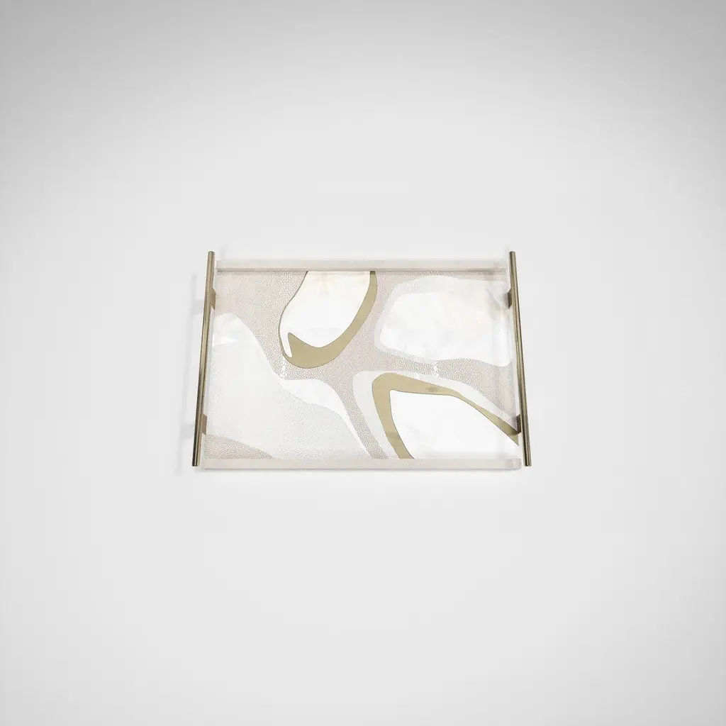 The Paris based label has distinguished themselves since their launch, with their iconic use of shagreen mixed with brass and other exotic materials. All furniture is handcrafted by skilled artisans, ultimately making each piece unique, designed in Paris and produced in the Philippines.A classic tray revisited; this Kifu Paris Chital II tray inlaid in a mixture of shagreen, shell and bronze-patina brass, makes for a stunning tabletop piece in any space. Available in other finishes and a rectangle shape. This listing is for the oval tray in the light colour way: mother of pearl, cream + white shagreen and bronze patina brass.The dimensions of this piece are 40 x 20 x 2 cm All Kifu Paris pieces are handmade by artisans, ultimately making each piece unique.Custom color/sizing available on request.Wipe clean with soft dry cloth.Although inspired by her parents, her collection of Home Accessories and Furniture is a distinct identity of its own. Kifu uses handmade techniques of elaborate inlay patterns of shagreen, shells, semi-precious stones, materials she experienced as a child growing up in her parent’s studio, but interpreted in a younger quirkier way reflecting her youth. From her "jewelry inspired knobs" on decorative boxes, gold bar boxes and an extravagant inlay pattern mix of shagreen and shell inspired by galactic constellations, as seen on her enormous round mirror, is refreshing to see. Kifu embodies whimsical elements throughout her collection and is not afraid to be daring and unexpected in her approach to design. All shagreen-covered items should be kept out of direct sunlight, color variants may occur on the stingray and other exotic finishes, but this showcases the Parisian label's commitment to creating authentic luxurious products using natural components.