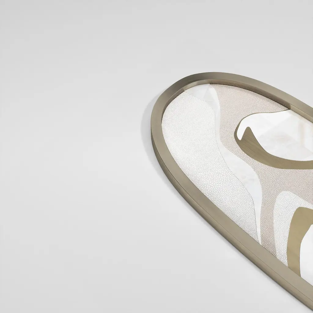 The Paris based label has distinguished themselves since their launch, with their iconic use of shagreen mixed with brass and other exotic materials. All furniture is handcrafted by skilled artisans, ultimately making each piece unique, designed in Paris and produced in the Philippines.A classic rectangle tray revisited; this Kifu Paris Chital II tray inlaid in a mixture of shagreen, shell and bronze-patina brass, makes for a stunning tabletop piece in any space. The brass handle are tubular. Available in other sizes & finishes and an oval shape. This listing is for the medium size rectangle tray in the light colour way: mother of pearl, cream + white shagreen and bronze patina brass.The dimensions of this piece are 43 x 30.5 x 5 cm All Kifu Paris pieces are handmade by artisans, ultimately making each piece unique.Custom color/sizing available on request.Wipe clean with soft dry cloth.Although inspired by her parents, her collection of Home Accessories and Furniture is a distinct identity of its own. Kifu uses handmade techniques of elaborate inlay patterns of shagreen, shells, semi-precious stones, materials she experienced as a child growing up in her parent’s studio, but interpreted in a younger quirkier way reflecting her youth. From her "jewelry inspired knobs" on decorative boxes, gold bar boxes and an extravagant inlay pattern mix of shagreen and shell inspired by galactic constellations, as seen on her enormous round mirror, is refreshing to see. Kifu embodies whimsical elements throughout her collection and is not afraid to be daring and unexpected in her approach to design. All shagreen-covered items should be kept out of direct sunlight, color variants may occur on the stingray and other exotic finishes, but this showcases the Parisian label's commitment to creating authentic luxurious products using natural components.