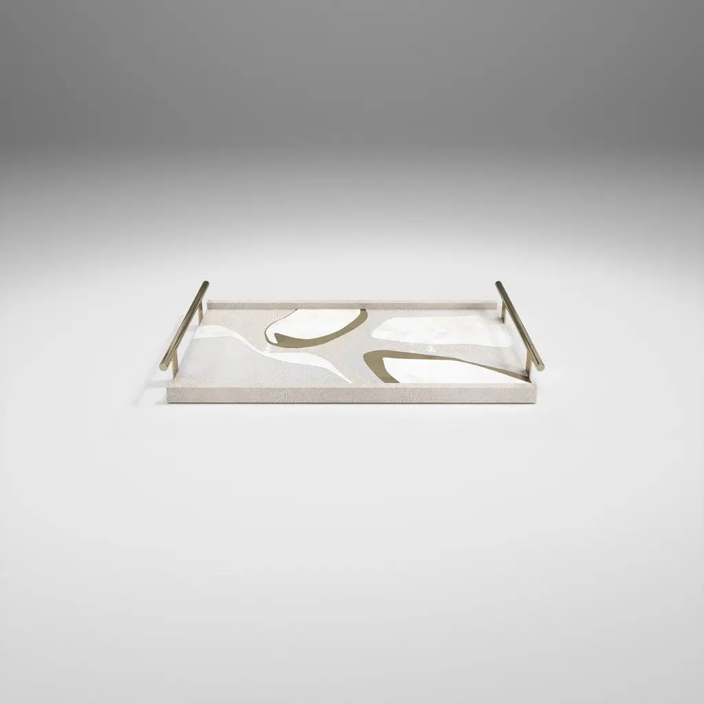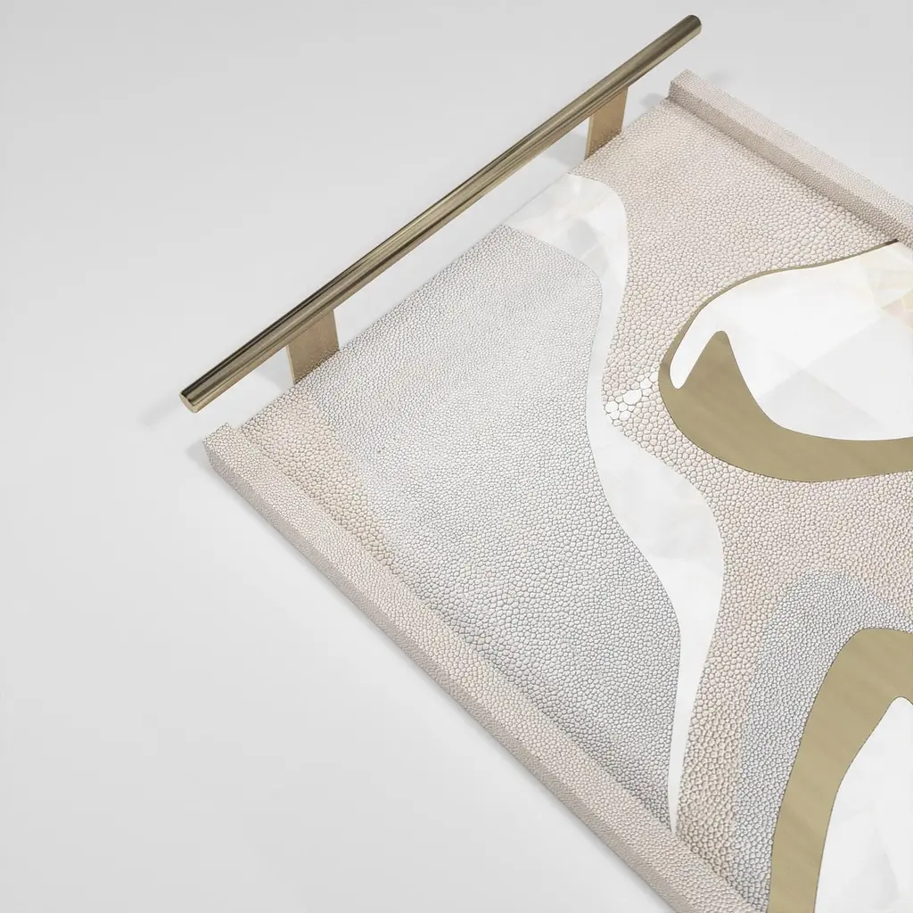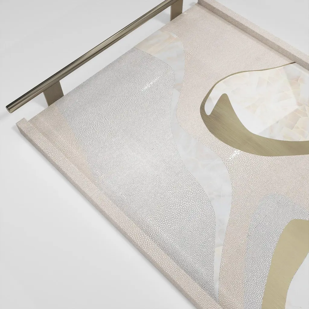The Paris based label has distinguished themselves since their launch, with their iconic use of shagreen mixed with brass and other exotic materials. All furniture is handcrafted by skilled artisans, ultimately making each piece unique, designed in Paris and produced in the Philippines.A classic rectangle tray revisited; this Kifu Paris Chital II tray inlaid in a mixture of shagreen, shell and bronze-patina brass, makes for a stunning tabletop piece in any space. The brass handle are tubular. Available in other sizes & finishes and an oval shape. This listing is for the medium size rectangle tray in the light colour way: mother of pearl, cream + white shagreen and bronze patina brass.The dimensions of this piece are 43 x 30.5 x 5 cm All Kifu Paris pieces are handmade by artisans, ultimately making each piece unique.Custom color/sizing available on request.Wipe clean with soft dry cloth.Although inspired by her parents, her collection of Home Accessories and Furniture is a distinct identity of its own. Kifu uses handmade techniques of elaborate inlay patterns of shagreen, shells, semi-precious stones, materials she experienced as a child growing up in her parent’s studio, but interpreted in a younger quirkier way reflecting her youth. From her "jewelry inspired knobs" on decorative boxes, gold bar boxes and an extravagant inlay pattern mix of shagreen and shell inspired by galactic constellations, as seen on her enormous round mirror, is refreshing to see. Kifu embodies whimsical elements throughout her collection and is not afraid to be daring and unexpected in her approach to design. All shagreen-covered items should be kept out of direct sunlight, color variants may occur on the stingray and other exotic finishes, but this showcases the Parisian label's commitment to creating authentic luxurious products using natural components.