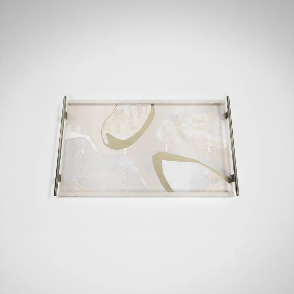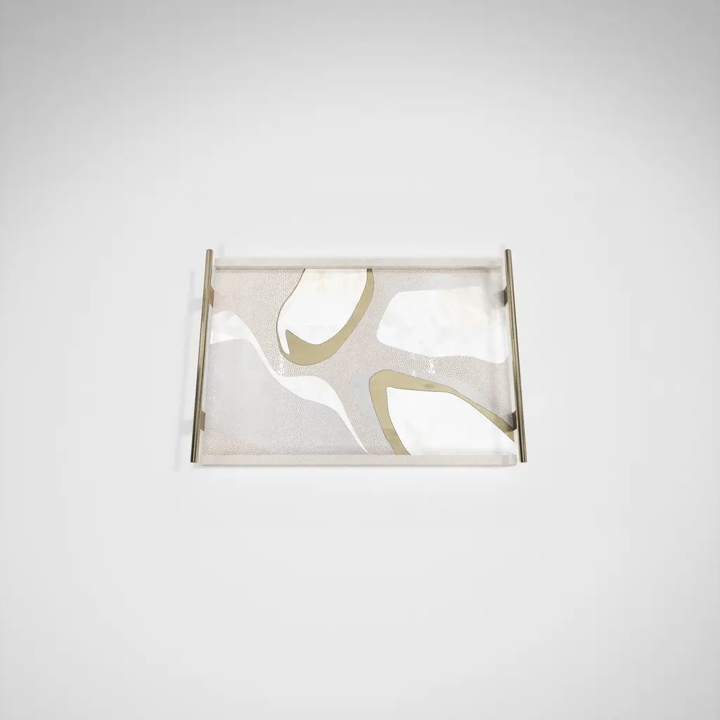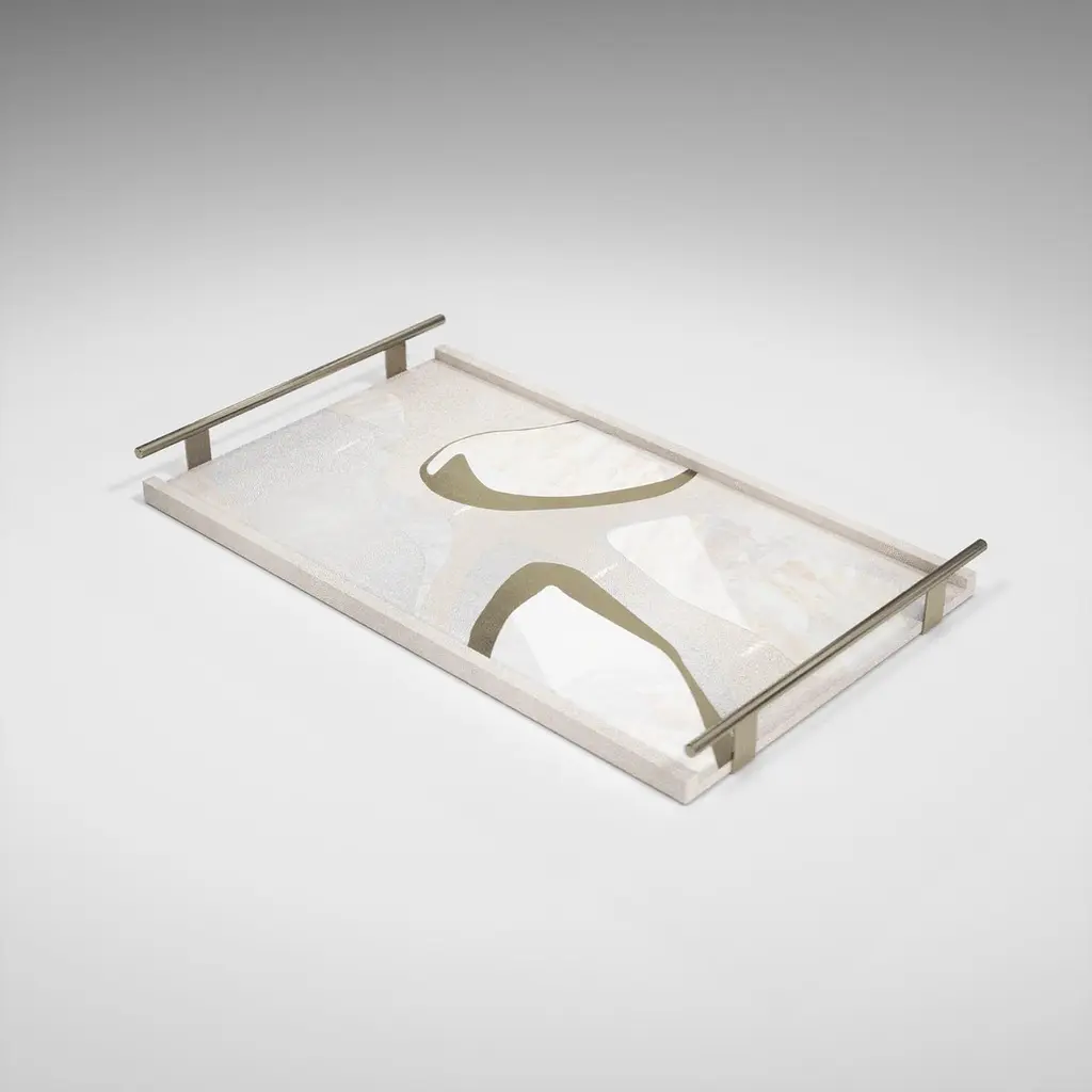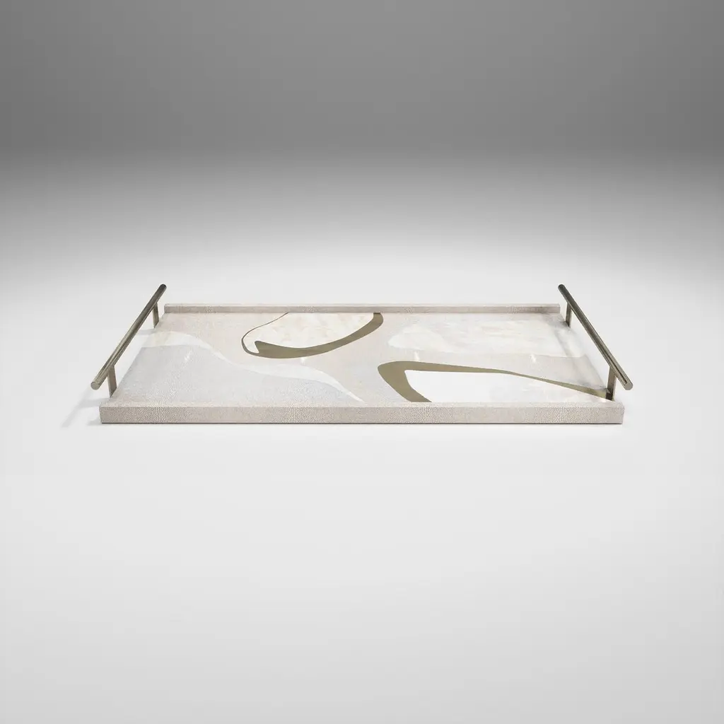 The Paris based label has distinguished themselves since their launch, with their iconic use of shagreen mixed with brass and other exotic materials. All furniture is handcrafted by skilled artisans, ultimately making each piece unique, designed in Paris and produced in the Philippines.A classic rectangle tray revisited; this Kifu Paris Chital II tray inlaid in a mixture of shagreen, shell and bronze-patina brass, makes for a stunning tabletop piece in any space. The brass handle are tubular. Available in other sizes & finishes and an oval shape. This listing is for the medium size rectangle tray in the light colour way: mother of pearl, cream + white shagreen and bronze patina brass.The dimensions of this piece are 43 x 30.5 x 5 cm All Kifu Paris pieces are handmade by artisans, ultimately making each piece unique.Custom color/sizing available on request.Wipe clean with soft dry cloth.Although inspired by her parents, her collection of Home Accessories and Furniture is a distinct identity of its own. Kifu uses handmade techniques of elaborate inlay patterns of shagreen, shells, semi-precious stones, materials she experienced as a child growing up in her parent’s studio, but interpreted in a younger quirkier way reflecting her youth. From her "jewelry inspired knobs" on decorative boxes, gold bar boxes and an extravagant inlay pattern mix of shagreen and shell inspired by galactic constellations, as seen on her enormous round mirror, is refreshing to see. Kifu embodies whimsical elements throughout her collection and is not afraid to be daring and unexpected in her approach to design. All shagreen-covered items should be kept out of direct sunlight, color variants may occur on the stingray and other exotic finishes, but this showcases the Parisian label's commitment to creating authentic luxurious products using natural components.