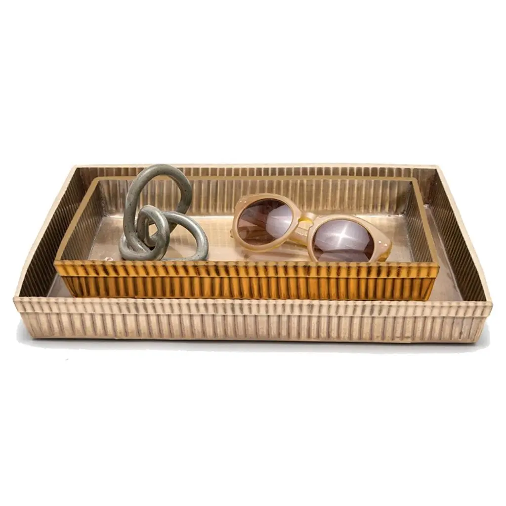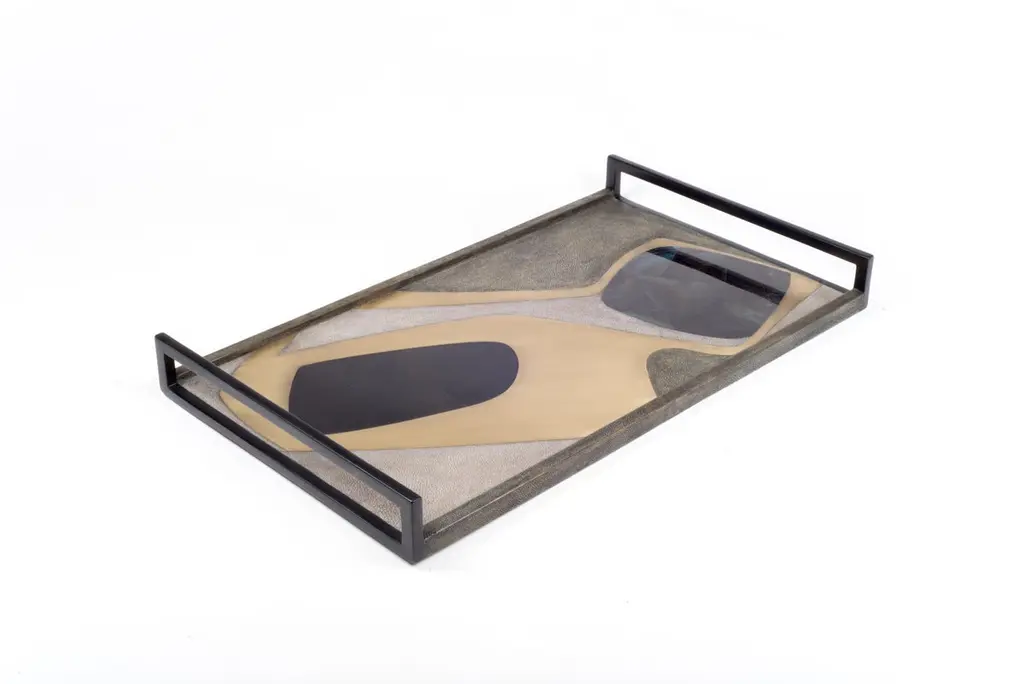 The Paris based label has distinguished themselves since their launch, with their iconic use of shagreen mixed with brass and other exotic materials. All furniture is handcrafted by skilled artisans, ultimately making each piece unique, designed in Paris and produced in the Philippines.The Cosmos rectangle tray is a stunning tabletop piece for any space. Available in light or dark color way inlaid in a mixture of shagreen, pen shell and bronze-patina brass. Also available on a circular tray.Measures: 24 x 13.5 x 2"All R & Y Augousti pieces are handmade by artisans, ultimately making each piece unique.Wipe clean with soft dry cloth.Acclaimed design duo Ria & Yiouri Augousti have established themselves since the 1990s as pioneers of modern-vintage style through their luxurious Art Deco inspired collections.The Paris based label has distinguished themselves since their launch, with their iconic use of shagreen mixed with brass and other exotic materials. All furniture is handcrafted by skilled artisans, ultimately making each piece unique. All shagreen-covered items should be kept out of direct sunlight, color variants may occur on the stingray and other exotic finishes, but this showcases the Parisian label's commitment to creating authentic luxurious products using natural components.