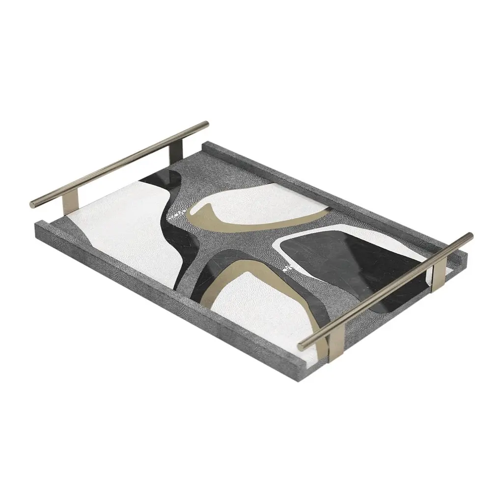 The Paris based label has distinguished themselves since their launch, with their iconic use of shagreen mixed with brass and other exotic materials. All furniture is handcrafted by skilled artisans, ultimately making each piece unique, designed in Paris and produced in the Philippines.The dancing peacock rectangle tray is a stunning tabletop piece for any space. Available in light or dark colour way inlaid in a mixture of shagreen, pen shell and bronze-patina brass. Also available on a circular tray. This listing is for the medium size inlaid in the dark colour way: blue + black pen shell, coal black + grey shagreen and bronze-patina brass.Measures: 18 x 12 x 2"All R & Y Augousti pieces are handmade by artisans, ultimately making each piece unique.Wipe clean with soft dry cloth.Acclaimed design duo Ria & Yiouri Augousti have established themselves since the 1990s as pioneers of modern-vintage style through their luxurious Art Deco inspired collections.The Paris based label has distinguished themselves since their launch, with their iconic use of shagreen mixed with brass and other exotic materials. All furniture is handcrafted by skilled artisans, ultimately making each piece unique. All shagreen-covered items should be kept out of direct sunlight, color variants may occur on the stingray and other exotic finishes, but this showcases the Parisian label's commitment to creating authentic luxurious products using natural components.
