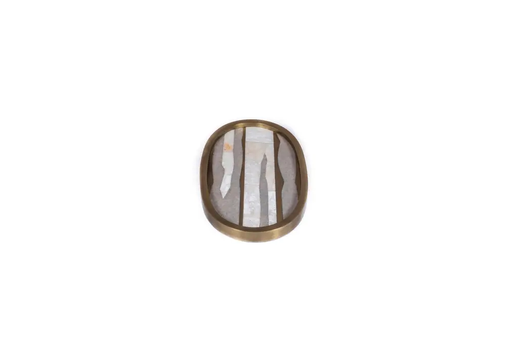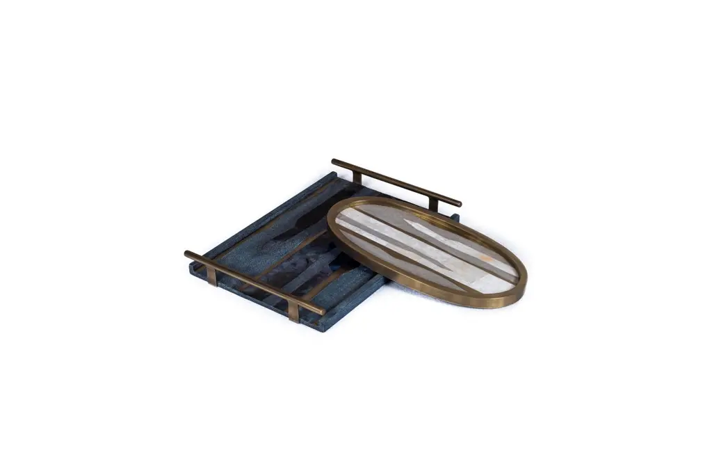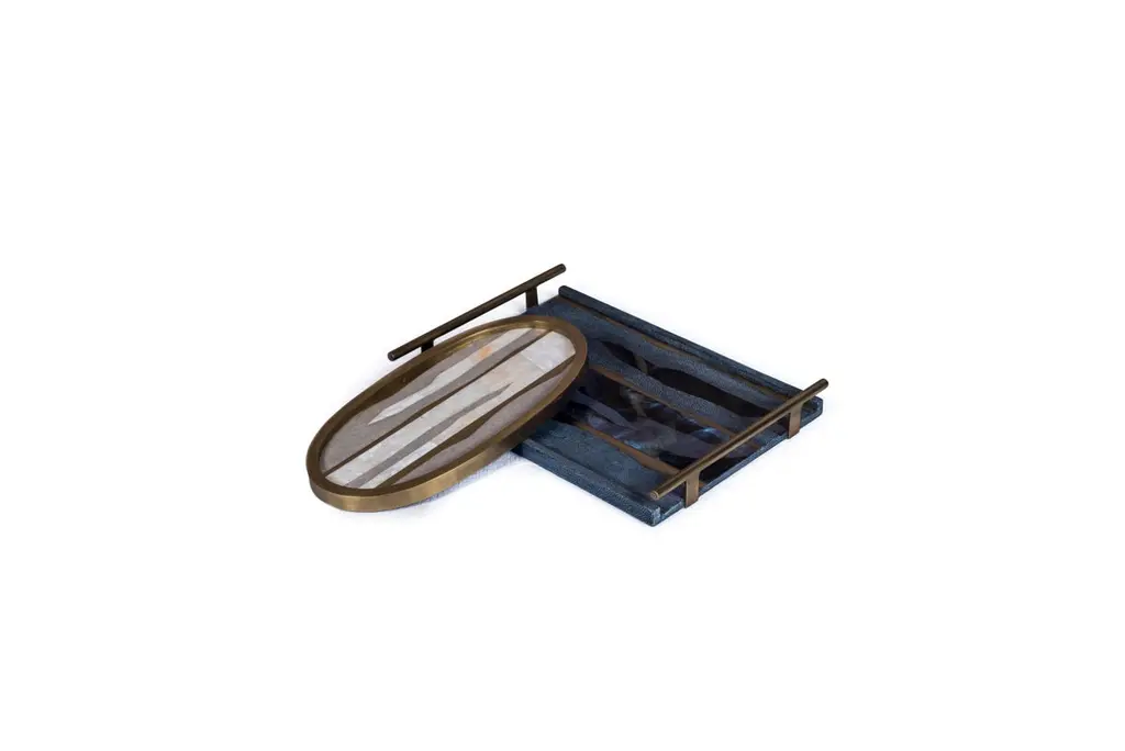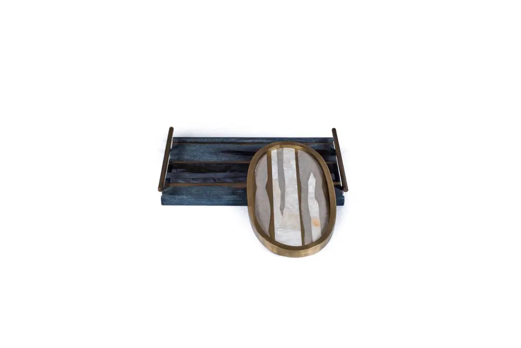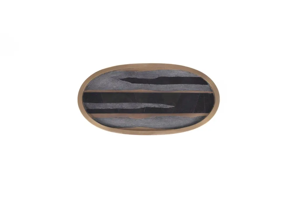 The Paris based label has distinguished themselves since their launch, with their iconic use of shagreen mixed with brass and other exotic materials. All furniture is handcrafted by skilled artisans, ultimately making each piece unique, designed in Paris and produced in the Philippines.A Classic oval vanity tray revisited; this Kifu Paris nautical-striped pattern tray is inlaid in a mixture of coal black shagreen, black shell, and bronze-patina brass, making for a stunning tabletop piece in any space. The frame is inlaid in bronze-patina brass. Available in other finishes and a rectangle shape.The dimensions of this piece are 15.75 x 7.75 x 0.78"All Kifu Paris pieces are handmade by artisans, ultimately making each piece unique.Custom color/sizing available on request.Wipe clean with soft dry cloth.Although inspired by her parents, her collection of Home Accessories and Furniture is a distinct identity of its own. Kifu uses handmade techniques of elaborate inlay patterns of shagreen, shells, semi-precious stones, materials she experienced as a child growing up in her parent’s studio, but interpreted in a younger quirkier way reflecting her youth. From her "jewelry inspired knobs" on decorative boxes, gold bar boxes and an extravagant inlay pattern mix of shagreen and shell inspired by galactic constellations, as seen on her enormous round mirror, is refreshing to see. Kifu embodies whimsical elements throughout her collection and is not afraid to be daring and unexpected in her approach to design. All shagreen-covered items should be kept out of direct sunlight, color variants may occur on the stingray and other exotic finishes, but this showcases the Parisian label's commitment to creating authentic luxurious products using natural components.