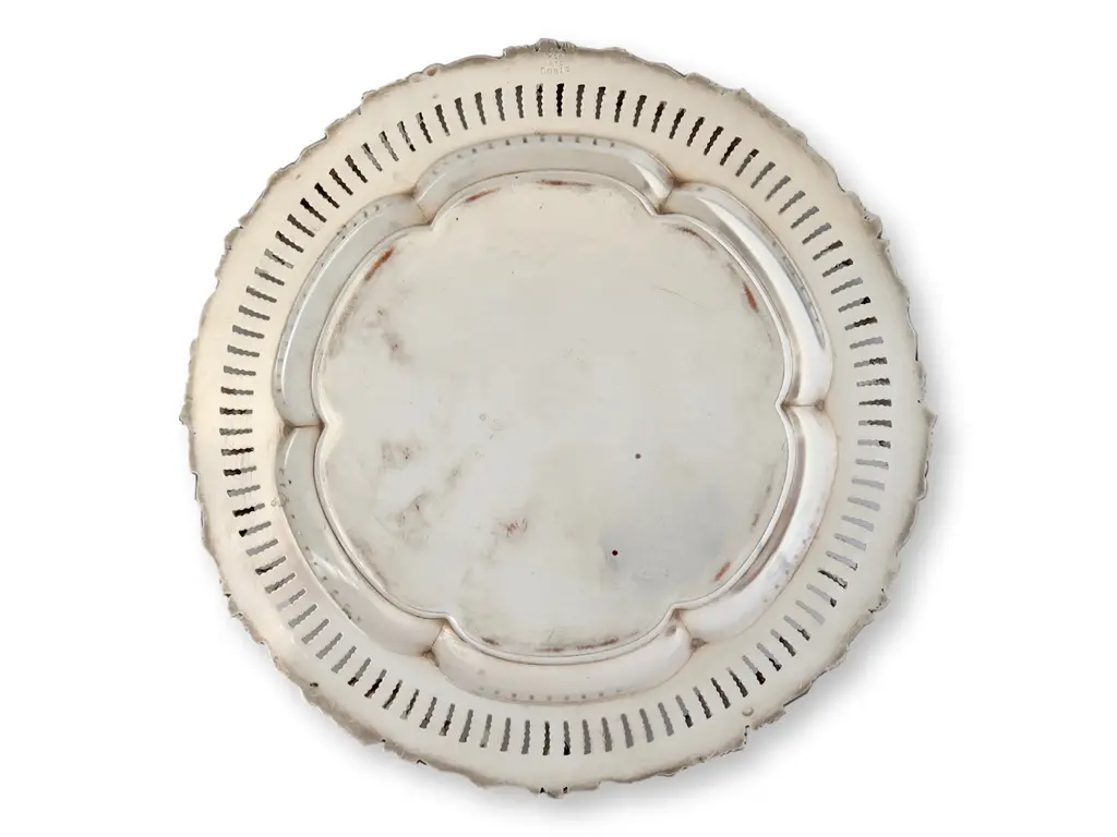 Vintage Sheffield plate round tray with heavy grapevine border. Typical "Old Sheffield Plate" with copper polished through silver. Crafted in the traditional style, it boasts hand-chased detailing and a maker's mark stamped on the back. Revel in the beauty of its craftsmanship and timeless charm. Perfect luxurious piece for a small space.